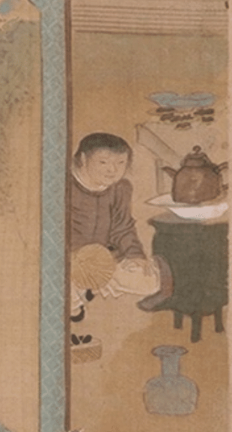 Further down, we can see a little boy squatting in front of the tea stove brewing tea fo his master.