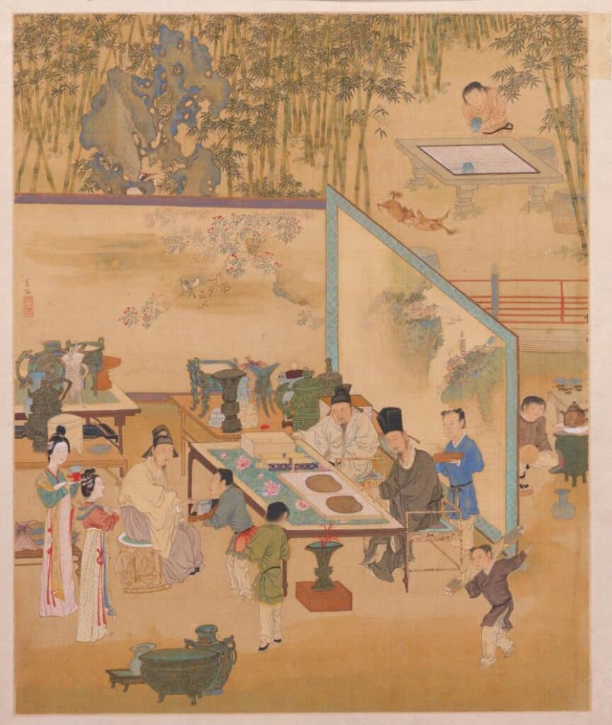Qiu Ying’s Appreciating Antiquities In the Bamboo Garden blends the characteristics of the Song and Ming dynasties, with both the elegant atmosphere of the Song Dynasty and the opulent material culture of the Ming Dynasty.