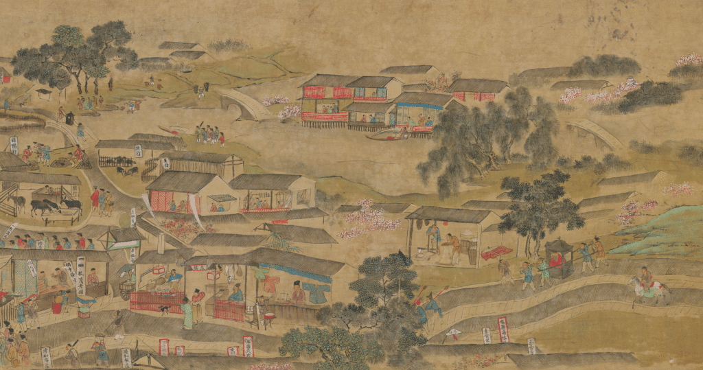 First, let’s look at the far right side of the scroll. On the far right is the outskirts of Nanjing, a landscape of springtime countryside dotted with pink peach blossoms where farmers toil, fetching water or carrying firewood. On the main road to the city, two soldiers could be seen patrolling with spears, followed by a group of attendants carrying palanquins for officials dressed in red robes. The farther to the left, the closer to the city, rice shops, pig shops, sheep shops, cattle shops, chicken and duck shops, textile shops begin to show in the scene, shop owners are busy doing the work in hand, greeting the guests who come to do businesses.