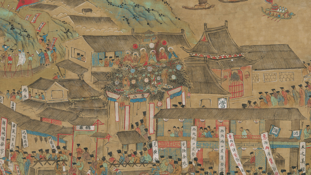 The bustling streets and luxuriously dressed people depicted in the scroll show that Nanjing was a major commercial city of the Ming dynasty, filled with diverse markets and dense crowds. It also reflects the prosperity of Sino-foreign trade and the growing extravagance of urban life in the mid-to-late Ming dynasty.