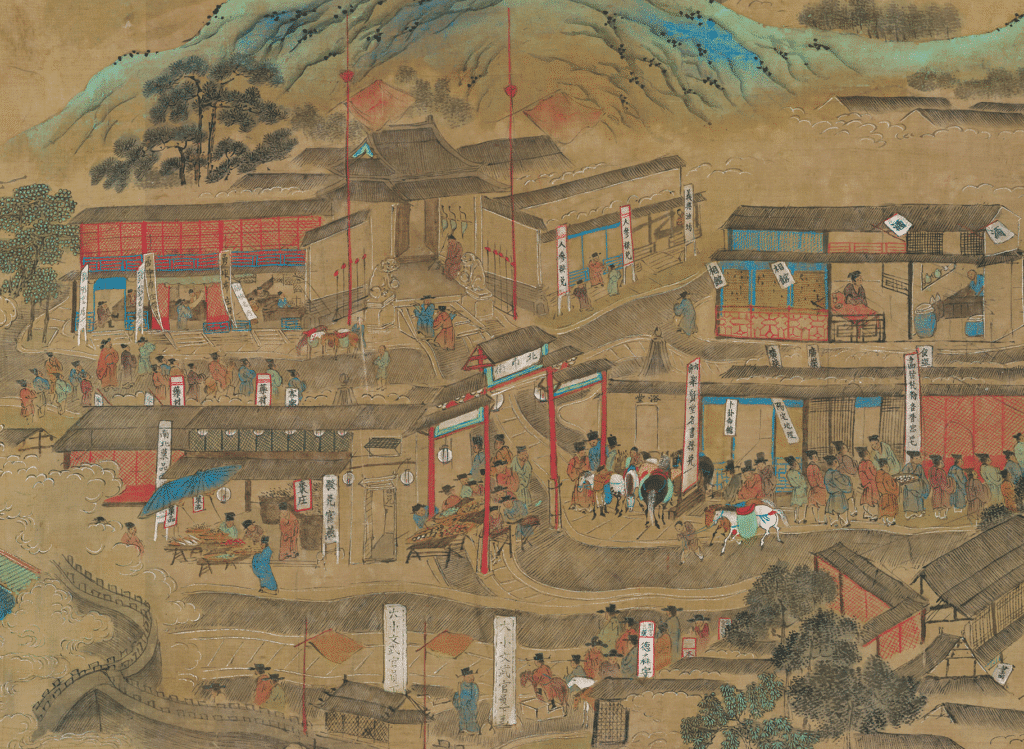 Looking to the center of the picture, the central part can be divided into two sections, the upper section depicts the natural mountain scenery, and the lower section depicts the bustling urban landscape. In the picture, stone-paved roads crisscross the scene, with various buildings on both sides—shops, restaurants, tea houses, pawnshops, private banks, portrait studios, painting workshops, open-air stages, bath houses, government offices, temples, and residential houses, etc, are scattered throughout. The road is crowded with pedestrians, carriages, and various tall signs. A small river runs through the center of the picture, showing the prosperity of the Jiangnan water town.