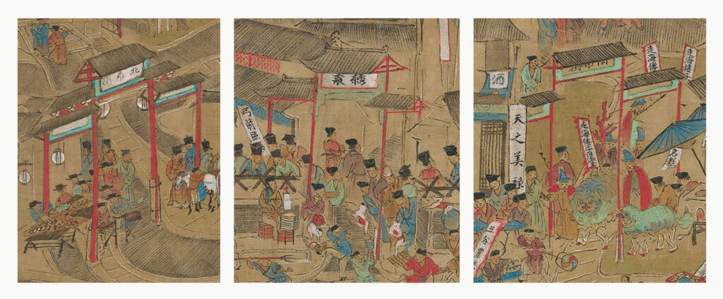 The Bustling and Hustling of Nanjing, like Appreciating Antiquities In the Bamboo Garden, was created by the Ming dynasty painter Qiu Ying and is now housed in National Museum of China. The scroll, measuring 44 cm in height and 350 cm in length, depicts the prosperous urban scene of Nanjing, the former capital of the Ming dynasty, from farmland to the market to the imperial palace, fully reflecting the profound changes in the urban economy and social life of the Ming dynasty and is known as the “Along the River During the Qingming Festival of the Ming dynasty”. The painting provides important visual materials for future generations to study the culture, economy, architecture and folklore of the Ming dynasty, and has both historical and artistic value.