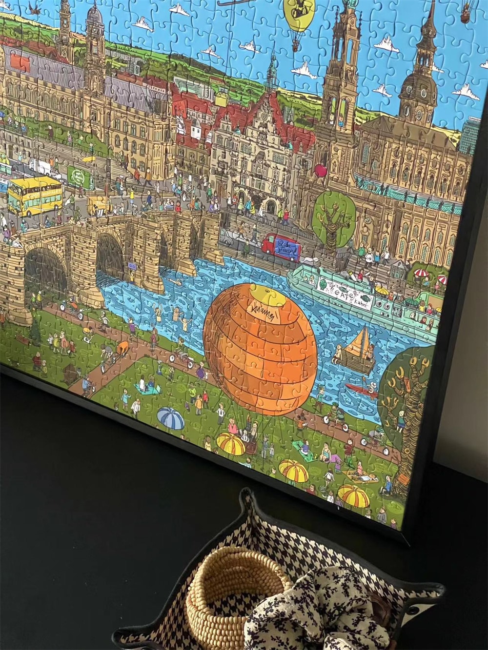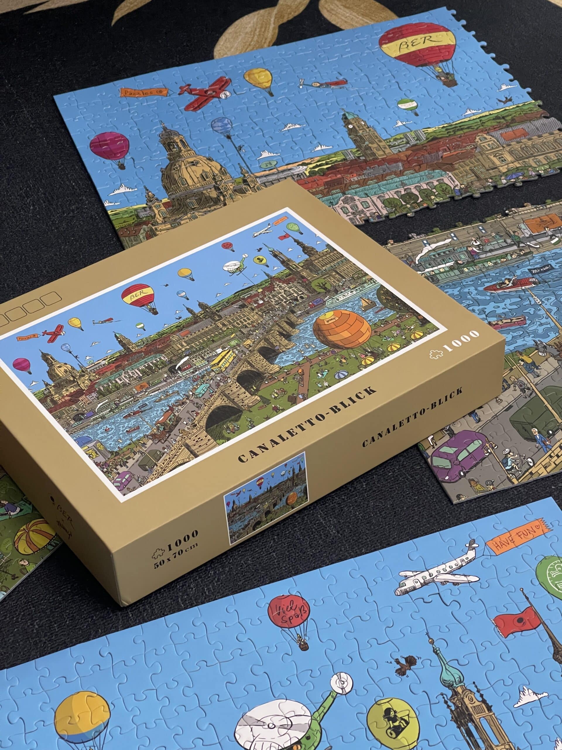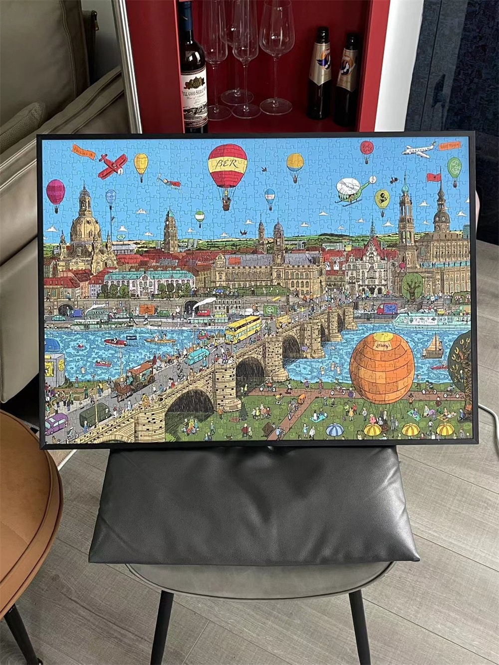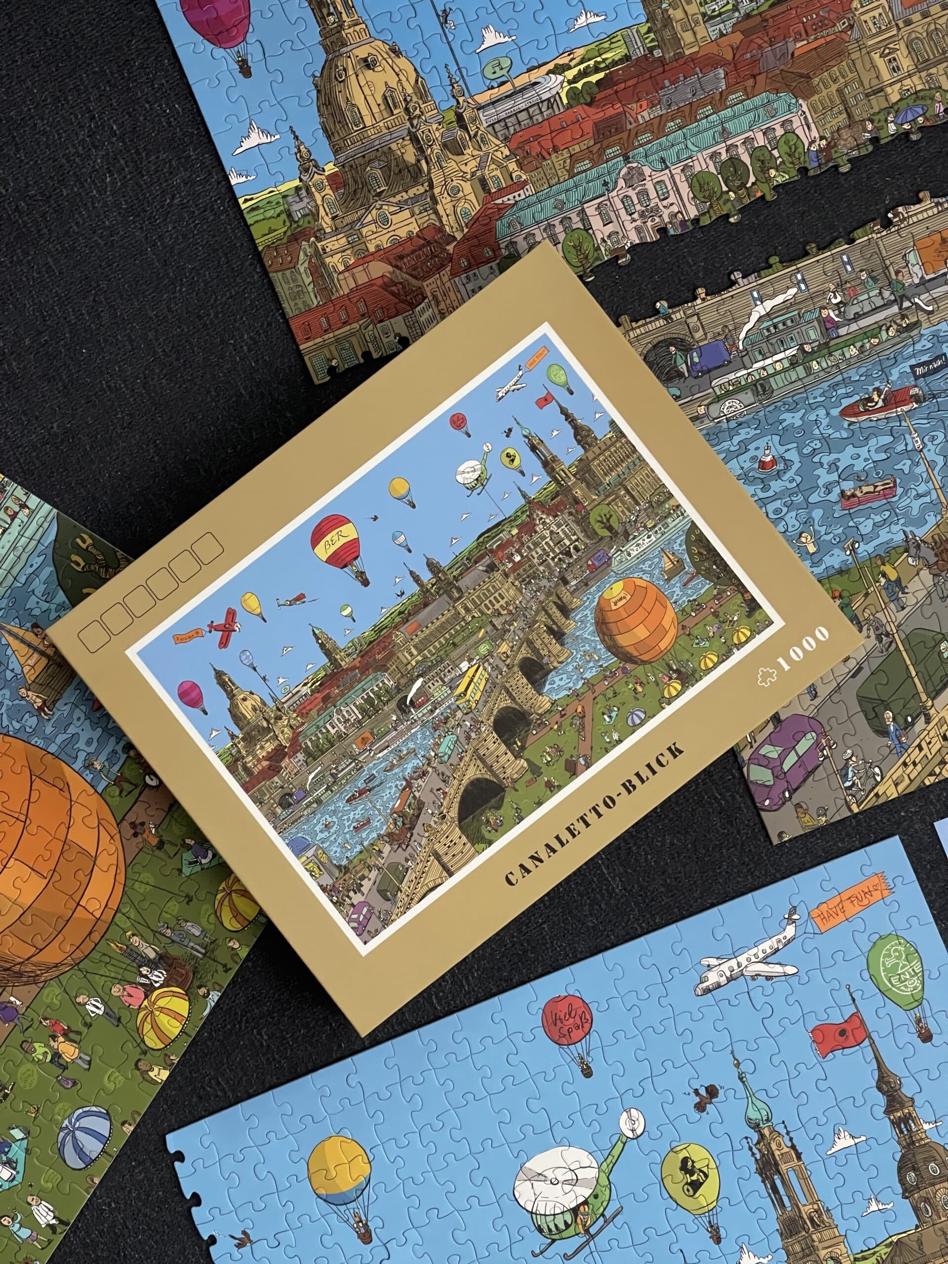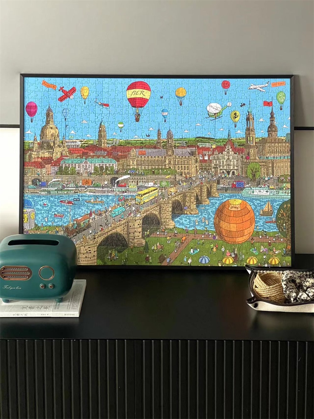 Canaletto-Blick 1000-piece velvet art puzzle features the award-winning 2020 DDV Media Innovationspreis artwork by German artist Mamei, portraying a lively Dresden scene with colorful hot air balloons drifting overhead. A broad bridge spans the river, linking historic buildings to lush parklands. In this beautiful city, people are savoring their leisure moments. Crafted from premium blue card with a velvet-touch finish, the puzzle offers a richly detailed and immersive assembling experience.