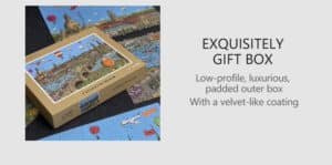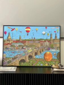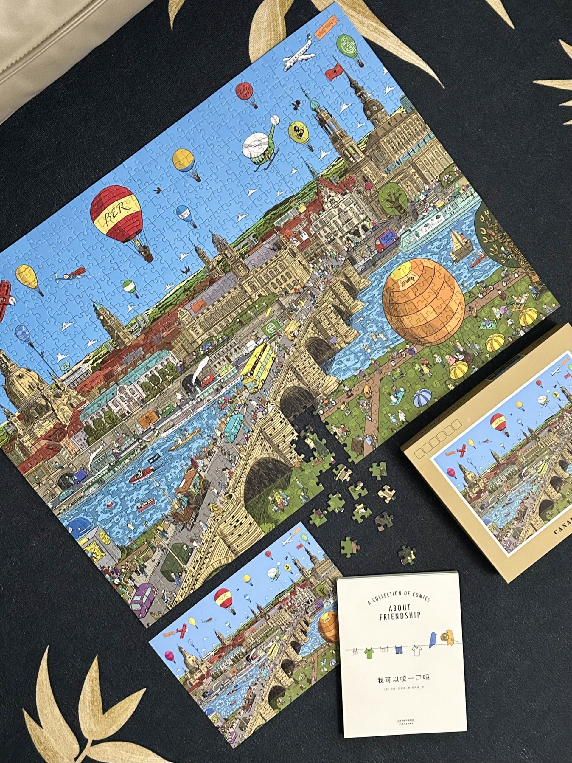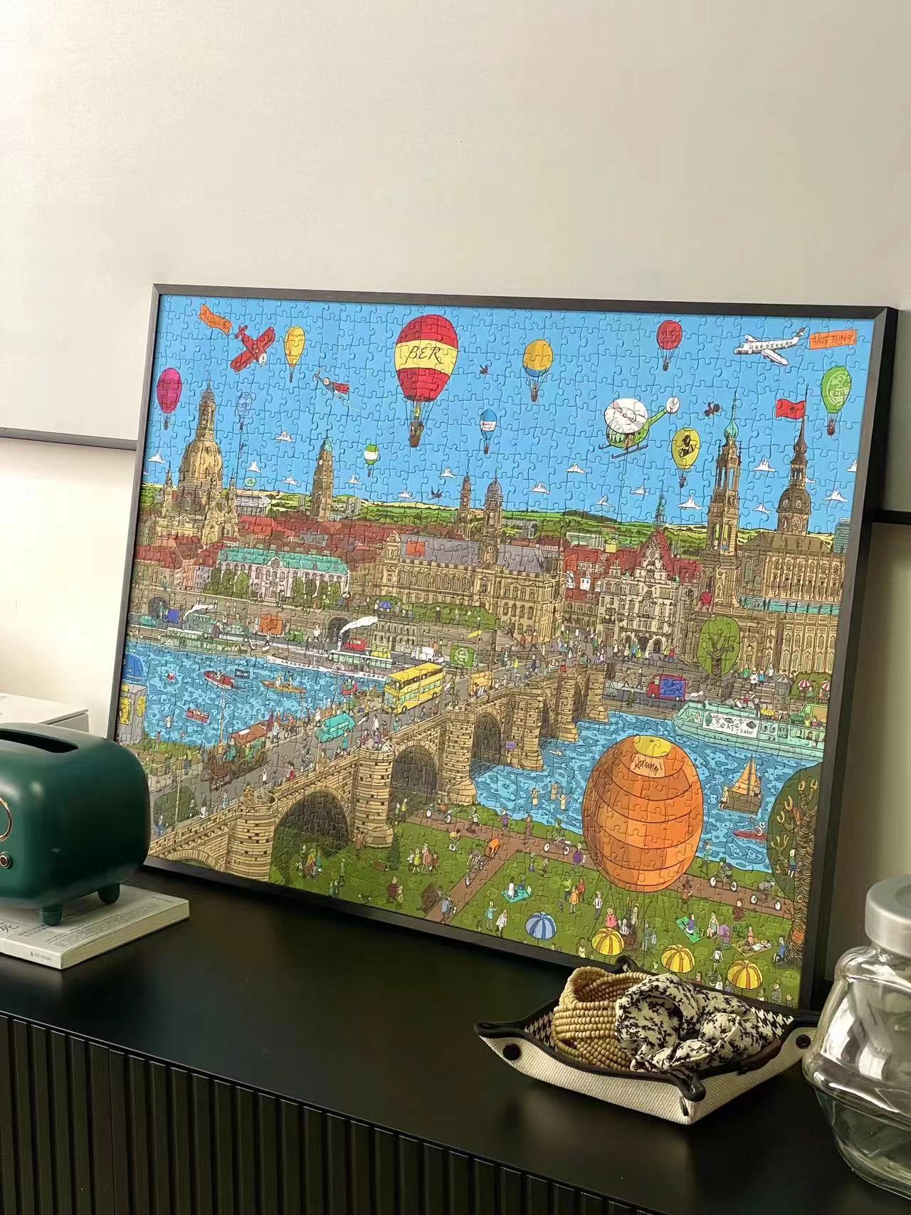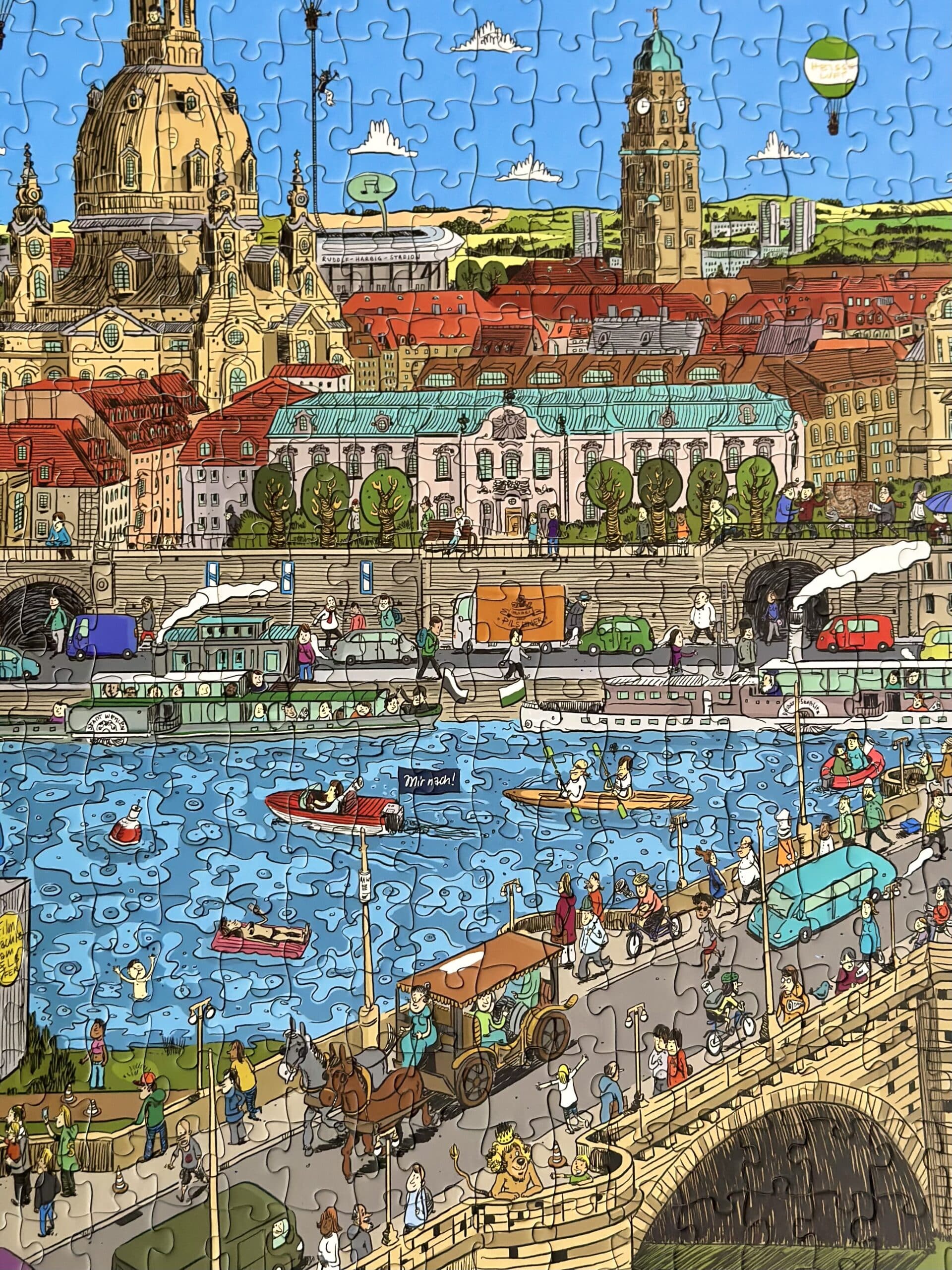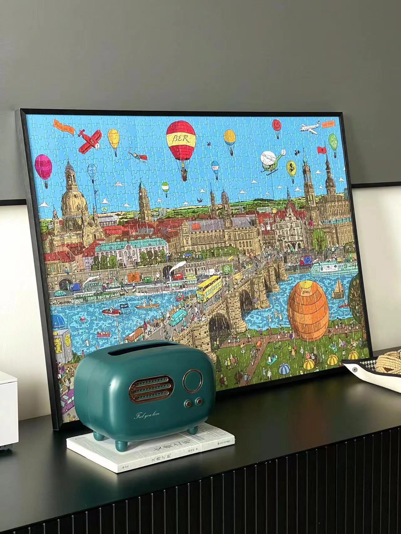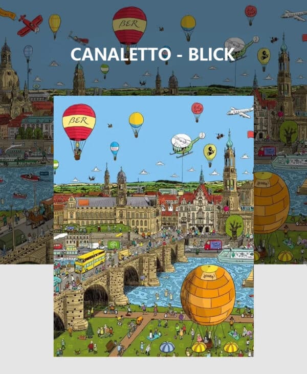 Canaletto-Blick 1000-piece velvet art puzzle features the award-winning 2020 DDV Media Innovationspreis artwork by German artist Mamei, portraying a lively Dresden scene with colorful hot air balloons drifting overhead. A broad bridge spans the river, linking historic buildings to lush parklands. In this beautiful city, people are savoring their leisure moments. Crafted from premium blue card with a velvet-touch finish, the puzzle offers a richly detailed and immersive assembling experience.