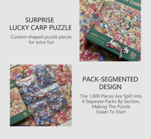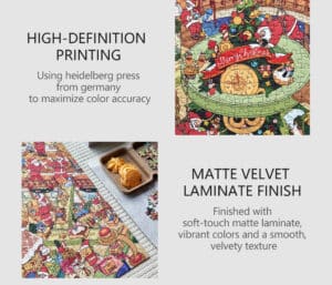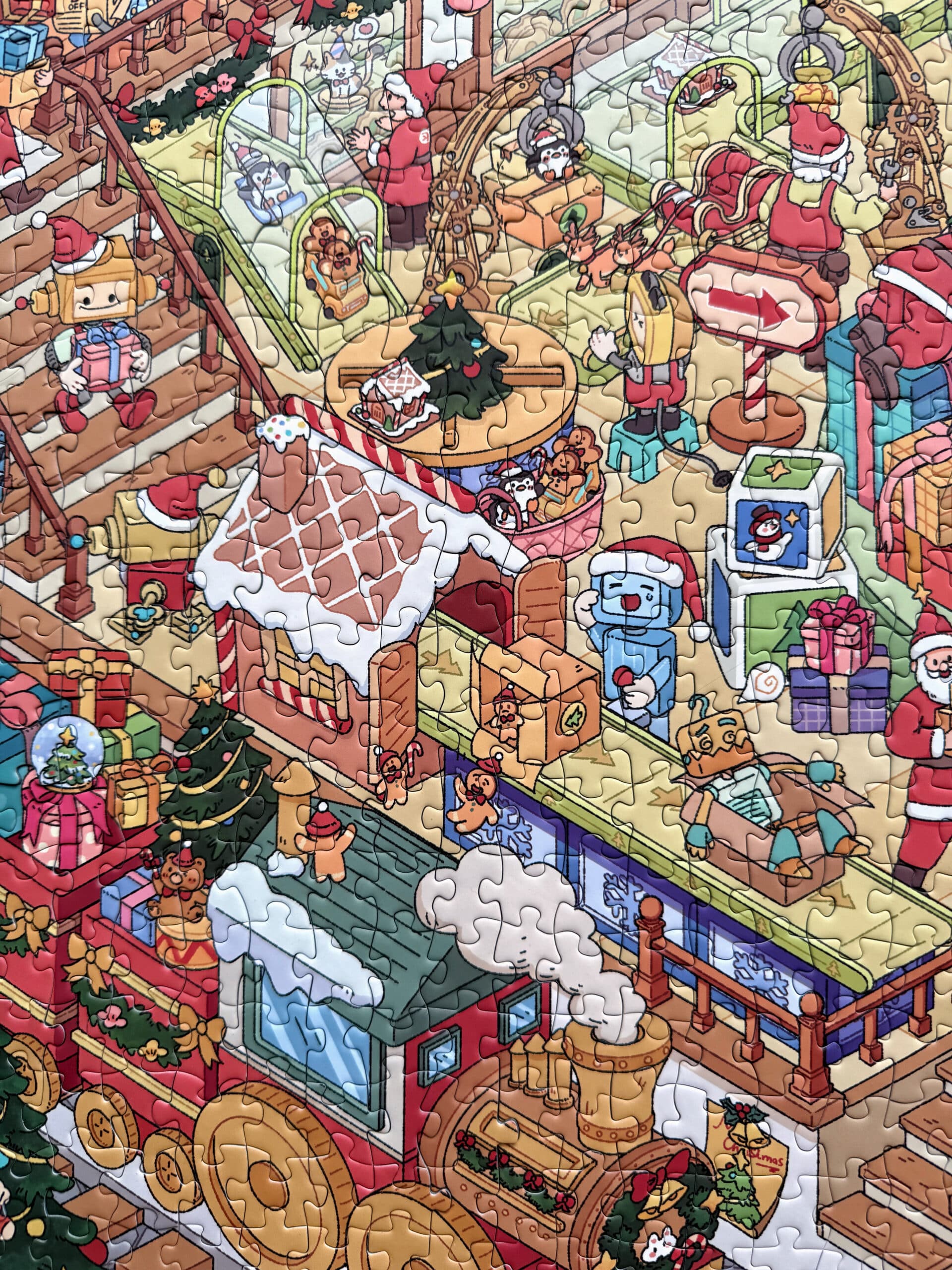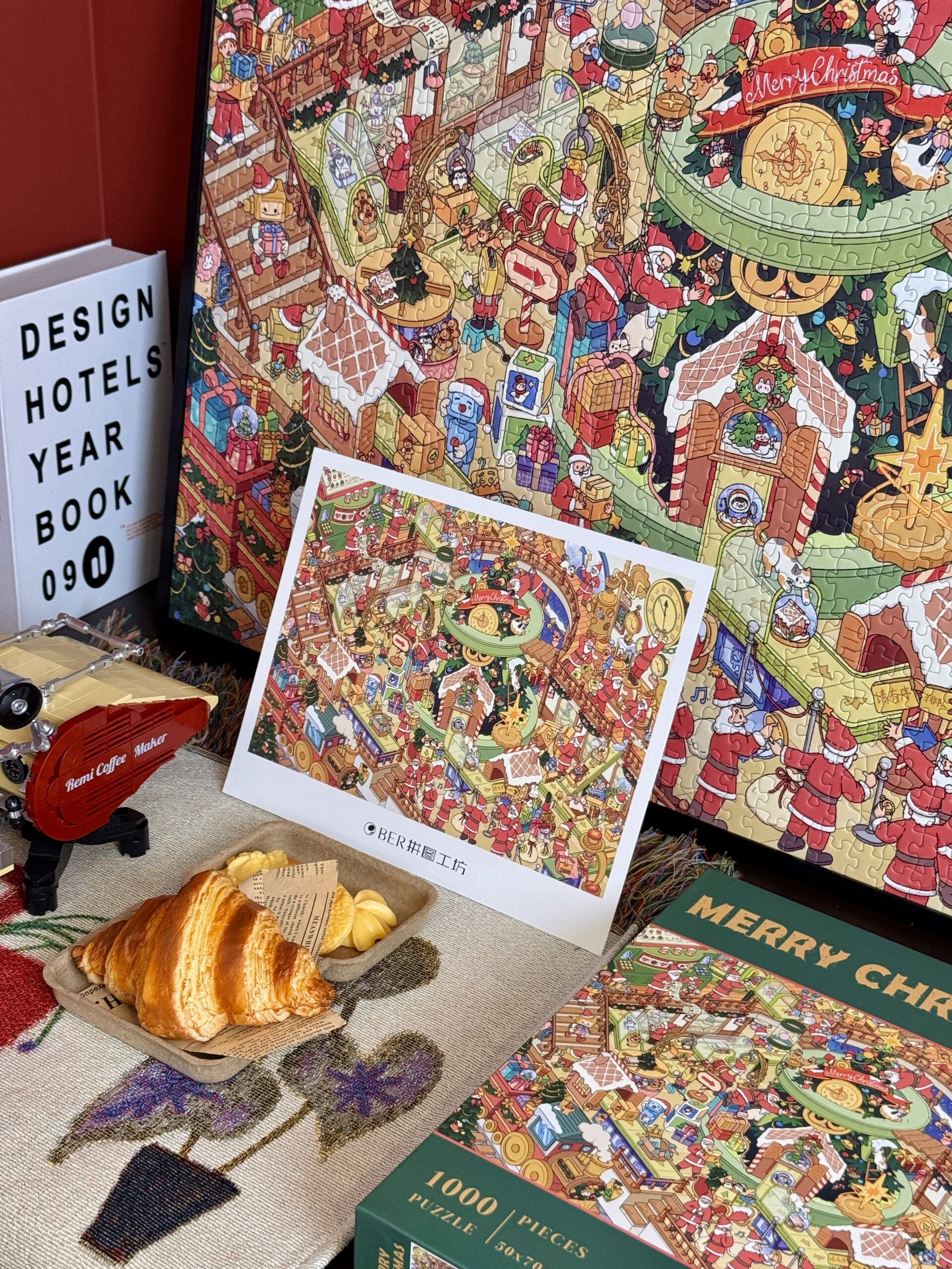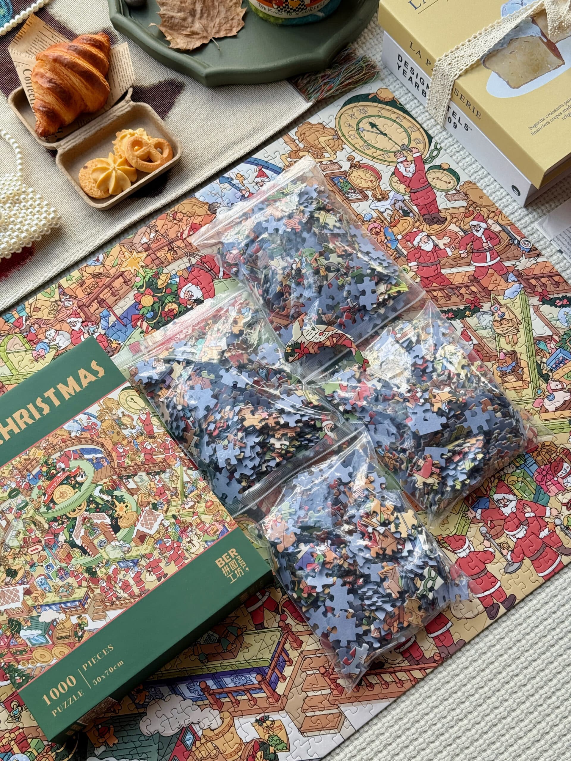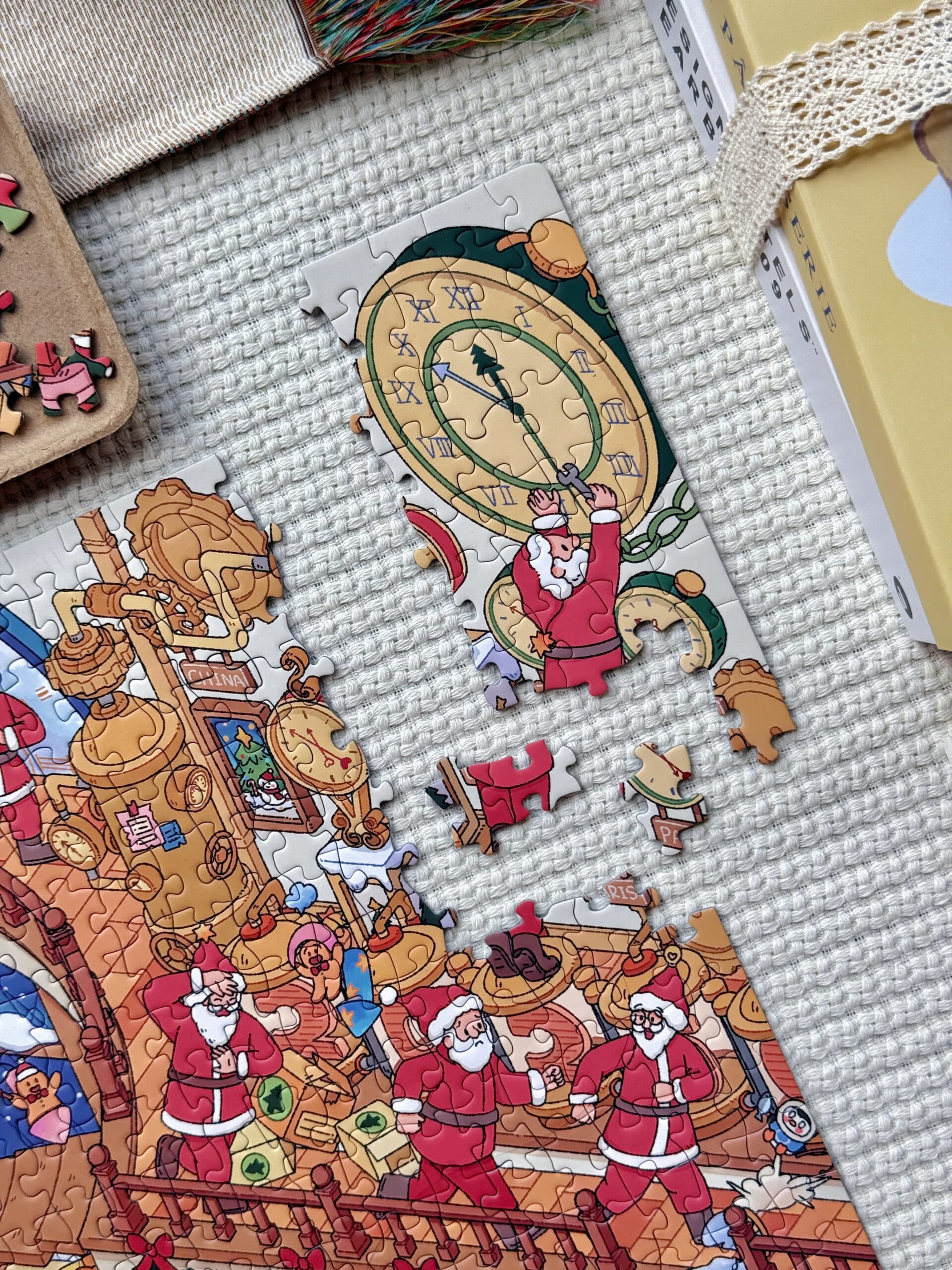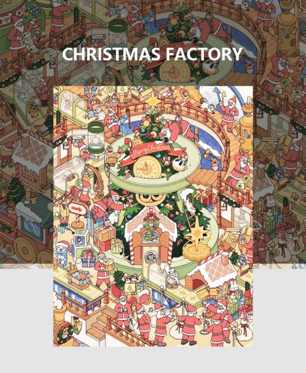 THE CHRISTMAS FACTORY 1000-PIECE ART PUZZLE SHOWS A LIVELY WORKSHOP WHERE SANTA, ELVES, AND WHIMSICAL HELPERS PREPARE GIFTS, CAPTURING THE FESTIVE MAGIC AND JOY OF CHRISTMAS. MADE FROM PREMIUM BLUE-CORE CARDBOARD WITH A MATTE VELVET FINISH, IT OFFERS A JOYFUL AND ENGAGING ASSEMBLING EXPERIENCE.
