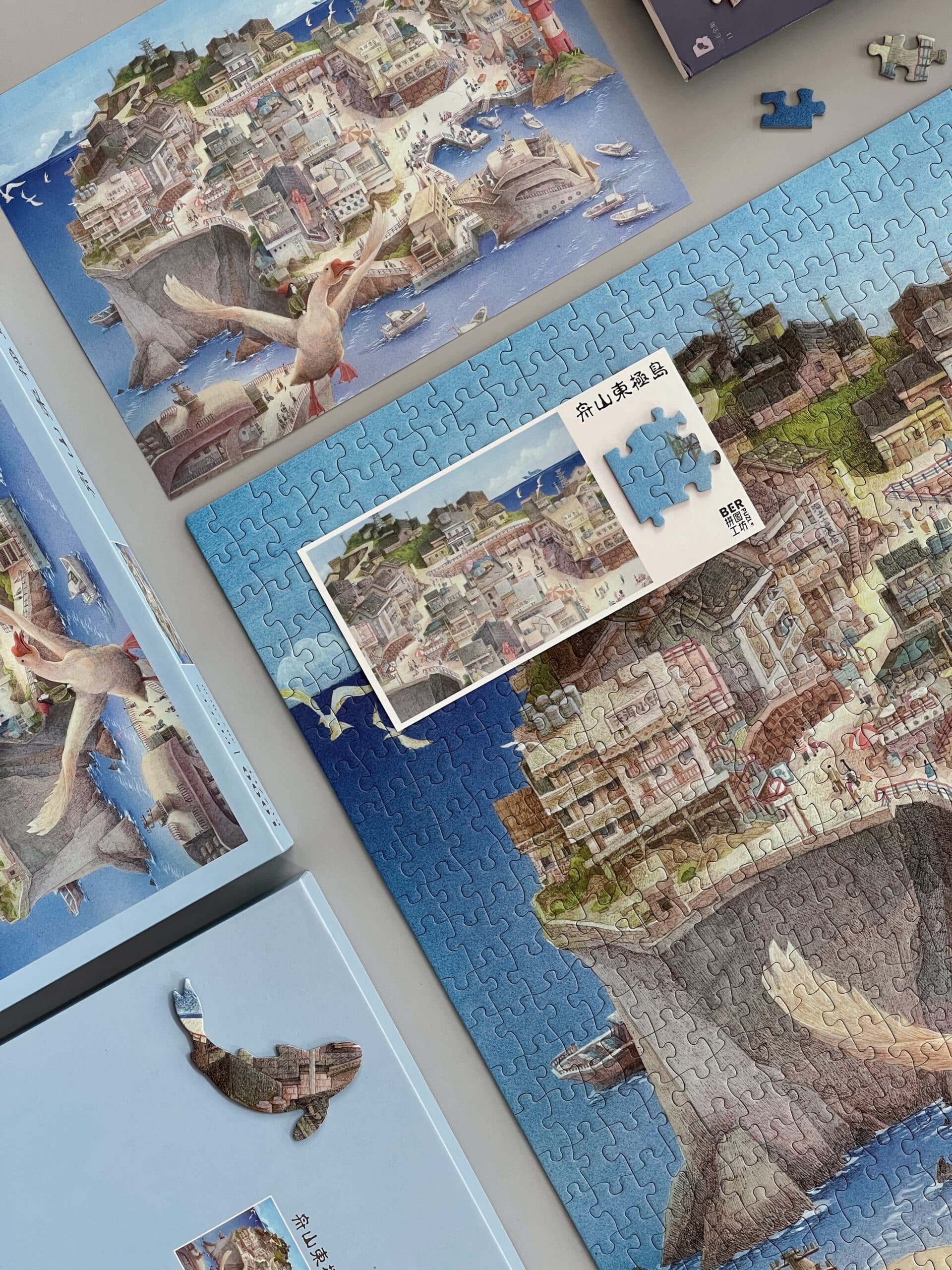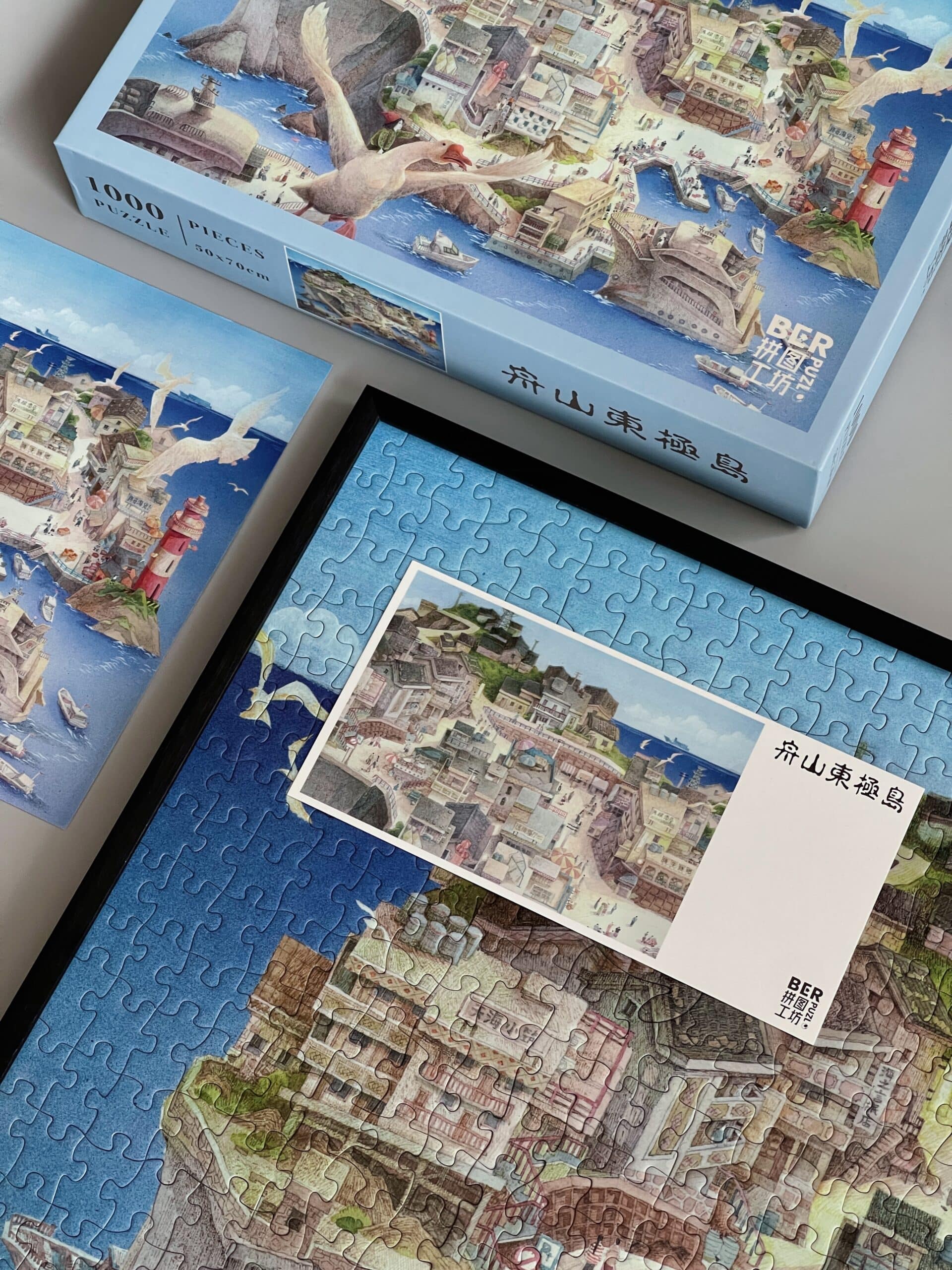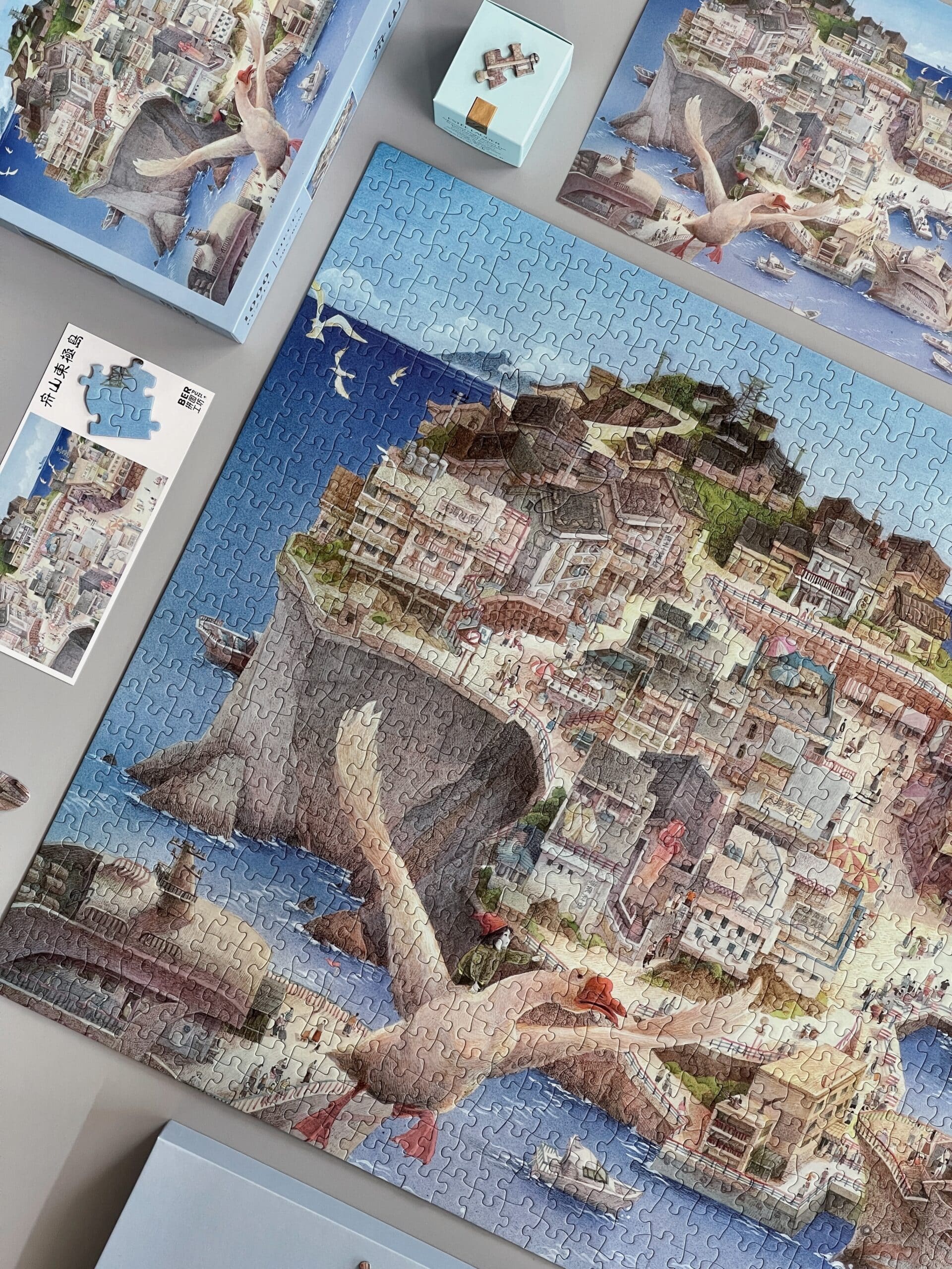 The Zhoushan Dongji Island 1000-piece art puzzle presents a hand-drawn panorama of this picturesque island town, where clusters of traditional island buildings rise gracefully along the shoreline. Rich in detail and atmosphere, the illustration captures the quiet beauty and charm of life by the sea. Crafted with premium blue card and a smooth matte touch finish, the puzzle offers both an immersive cultural journey and a deeply satisfying assembling experience.