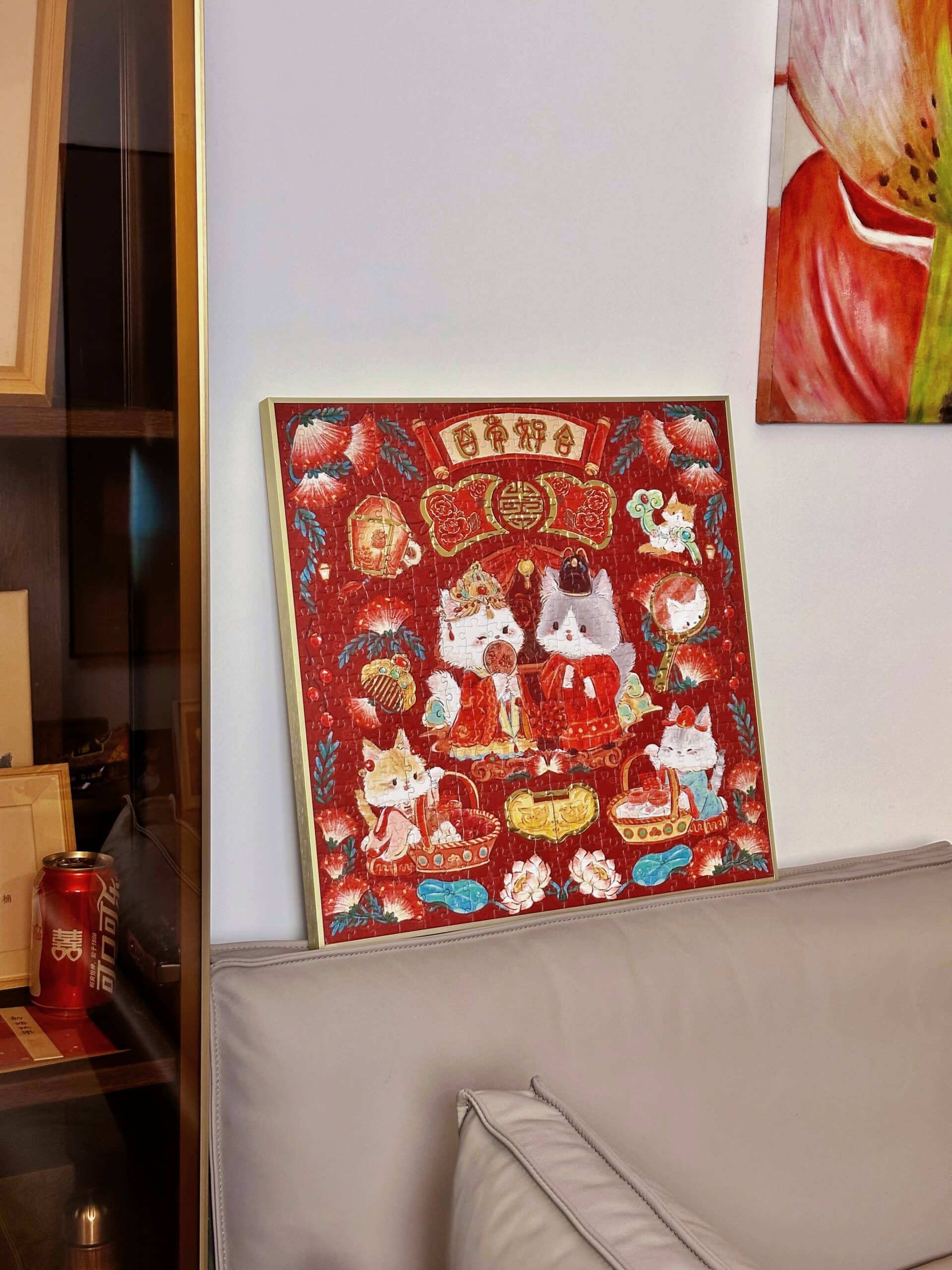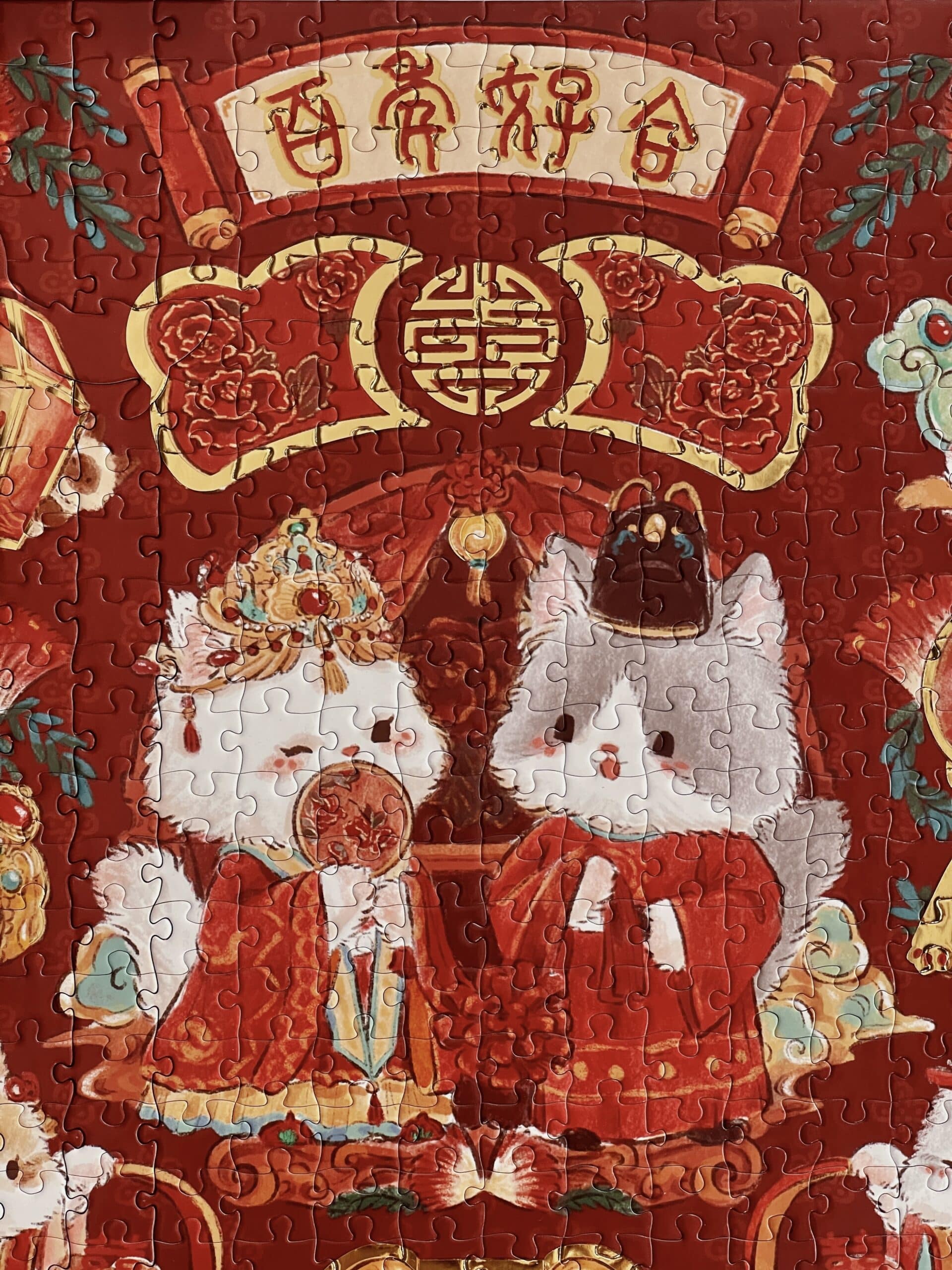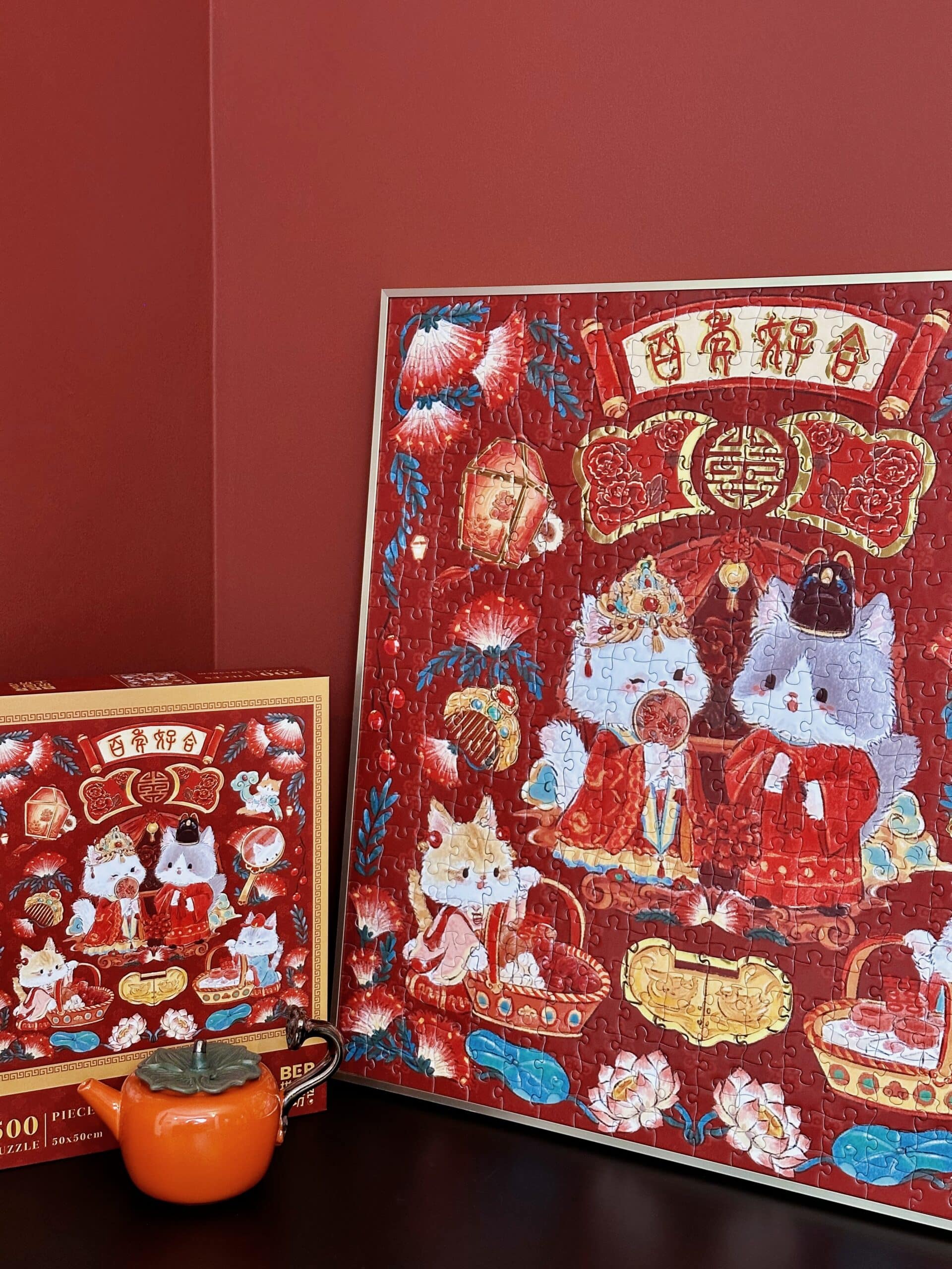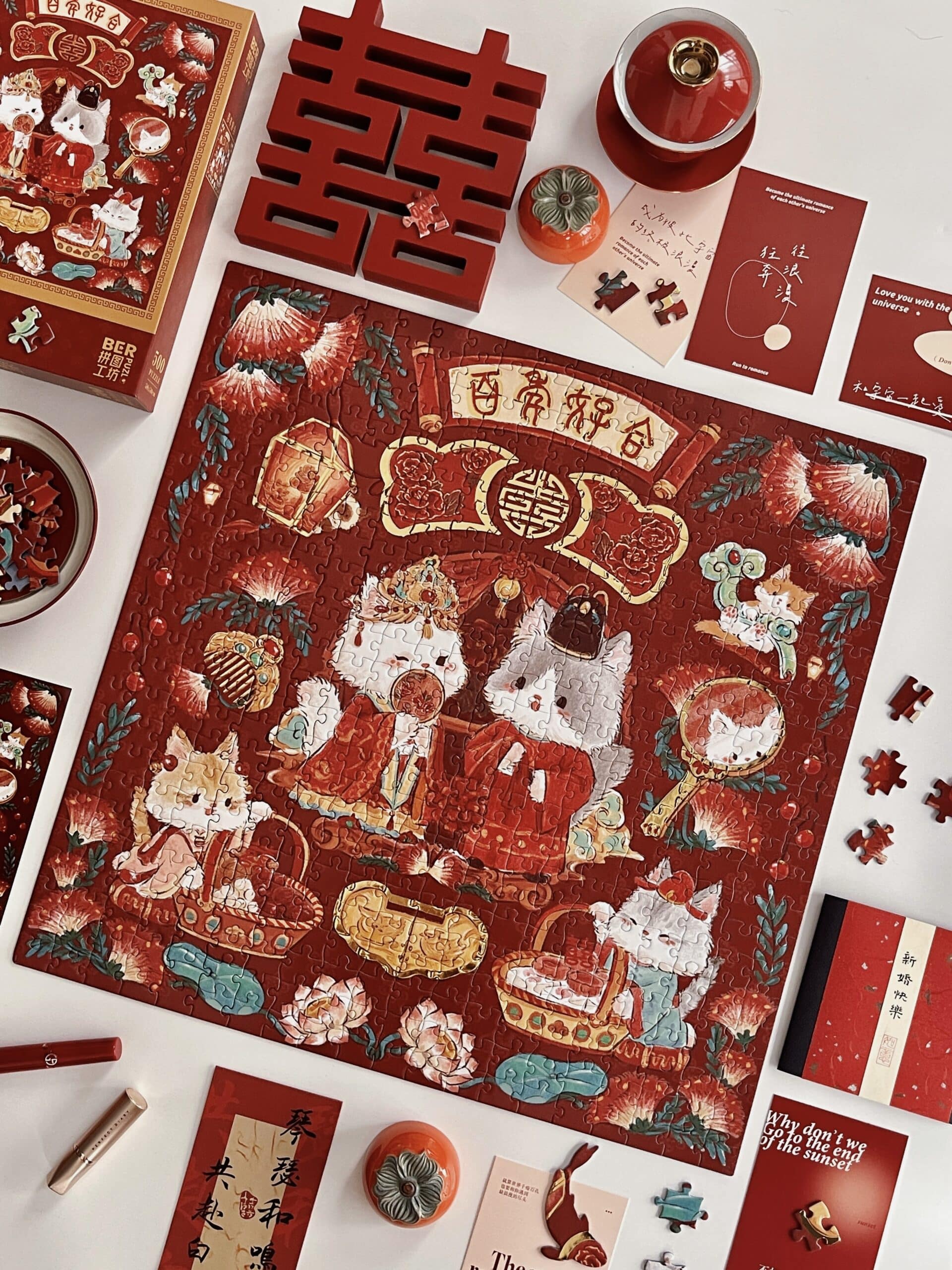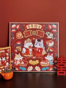 The Everlasting Harmony 500-piece velvet art puzzle features adorable cartoon cats as the main characters, portraying a captivating traditional Chinese wedding scene. Made from premium imported blue card with a matte finish and selective gold foil accents, it combines quality with elegance. A red envelopeis included with the puzzle, offering a joyful and heartwarming experience as the delightful scene comes together.Perfect for couples to enjoy assembling together.
