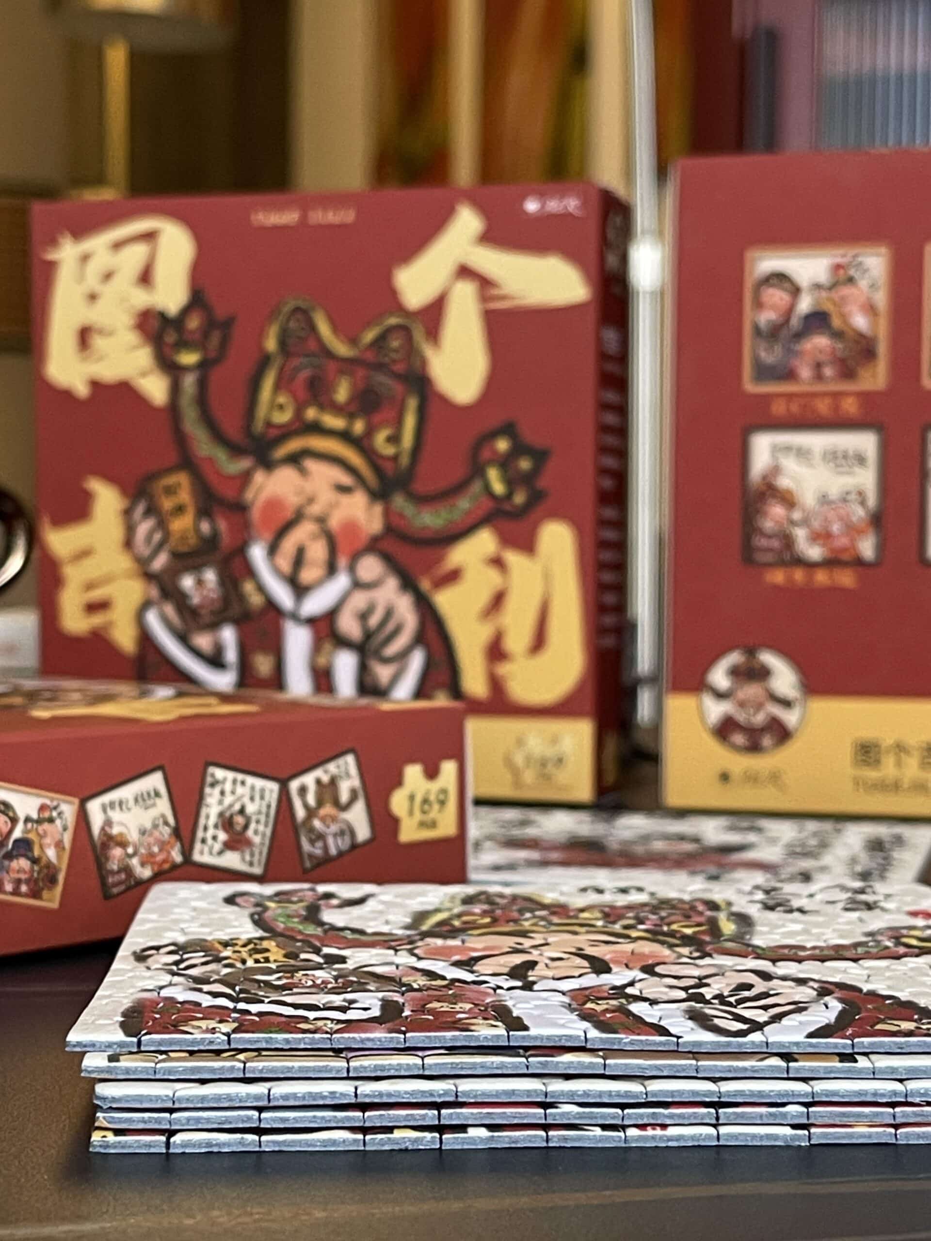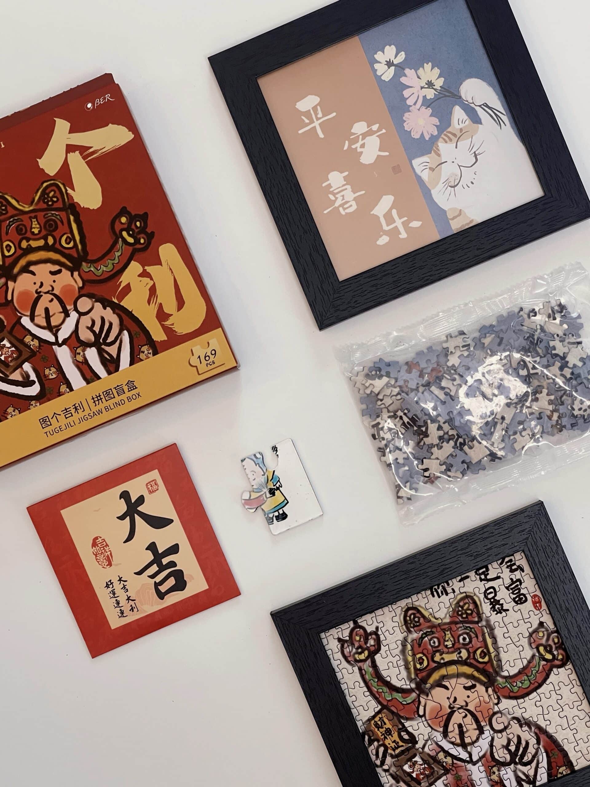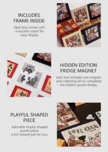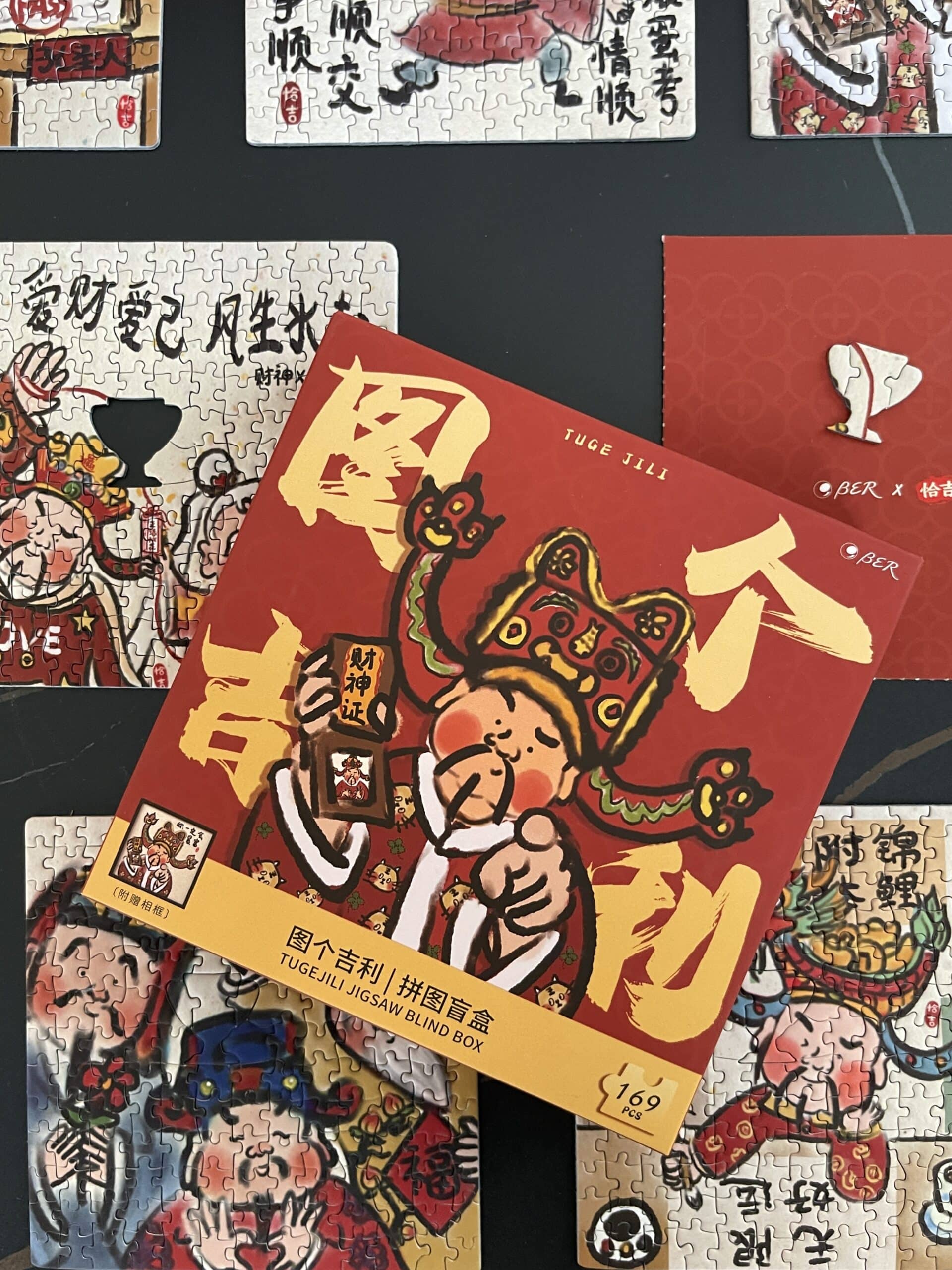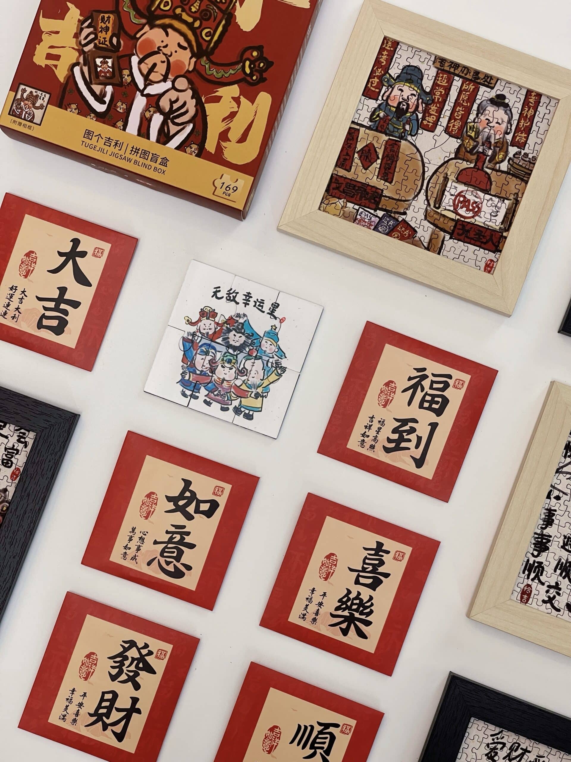 The For Good Fortune Puzzle Blind Box set includes 6 box of 169-piece puzzles, each featuring playful illustrations inspired by Chinese folklore and legendary figures such as the God of Wealth, Lord Guan(Guan Yu), and Chinese Demon Hunter(Zhong Kui). The designs convey wishes for prosperity, smooth careers, harmonious relationships, and a joyful life. Printed on premium blue cardboard with a velvety finish, each box comes with a frame, a festive red envelope, and a puzzle-shaped fridge magnet—collect all six magnets to form a new, combined design.