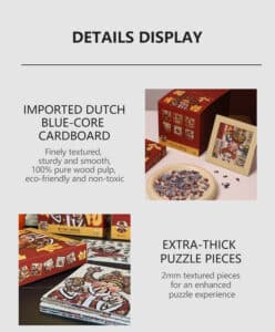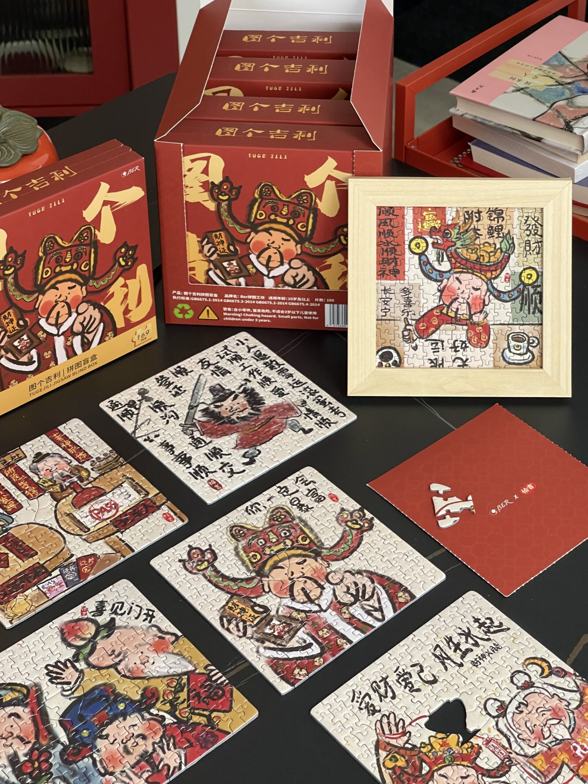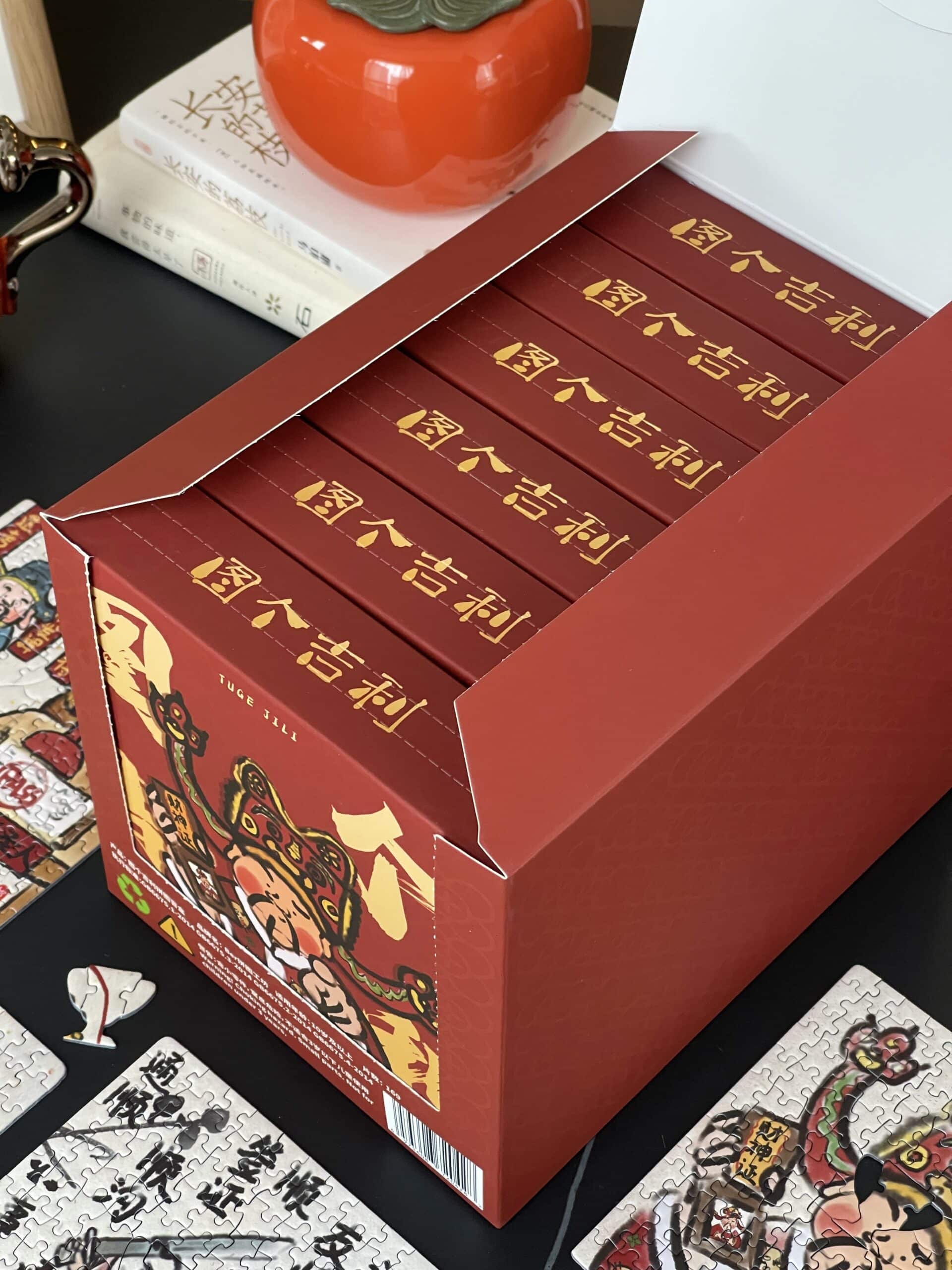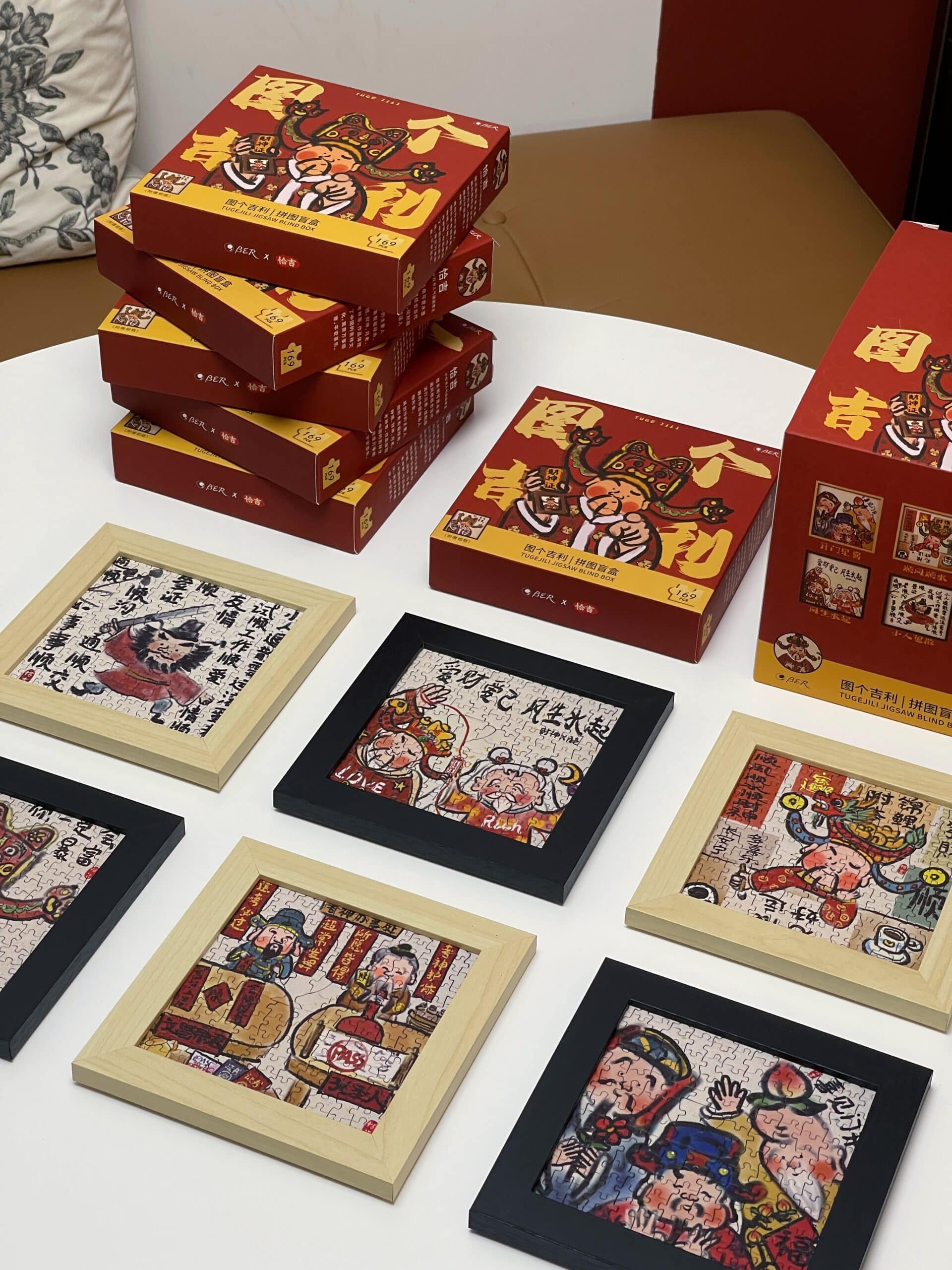 The For Good Fortune Puzzle Blind Box set includes 6 box of 169-piece puzzles, each featuring playful illustrations inspired by Chinese folklore and legendary figures such as the God of Wealth, Lord Guan(Guan Yu), and Chinese Demon Hunter(Zhong Kui). The designs convey wishes for prosperity, smooth careers, harmonious relationships, and a joyful life. Printed on premium blue cardboard with a velvety finish, each box comes with a frame, a festive red envelope, and a puzzle-shaped fridge magnet—collect all six magnets to form a new, combined design.