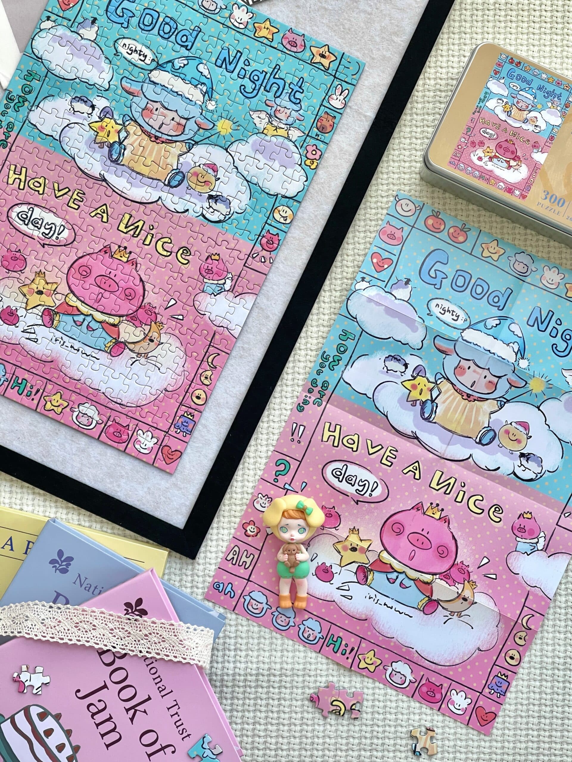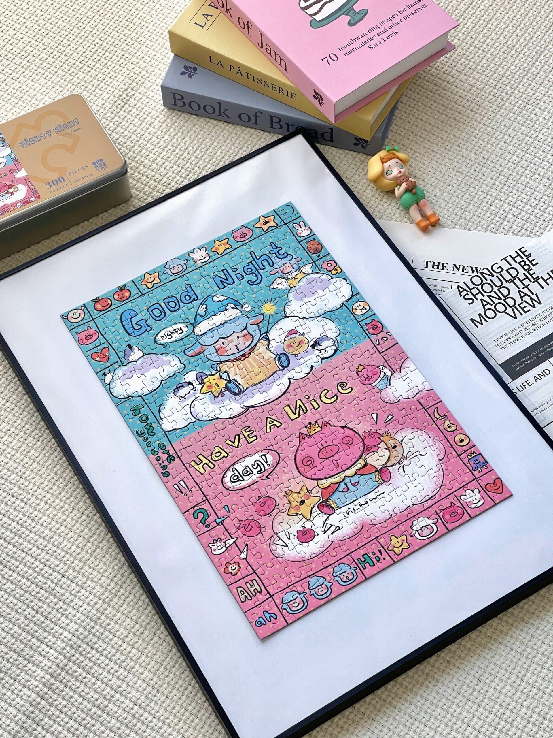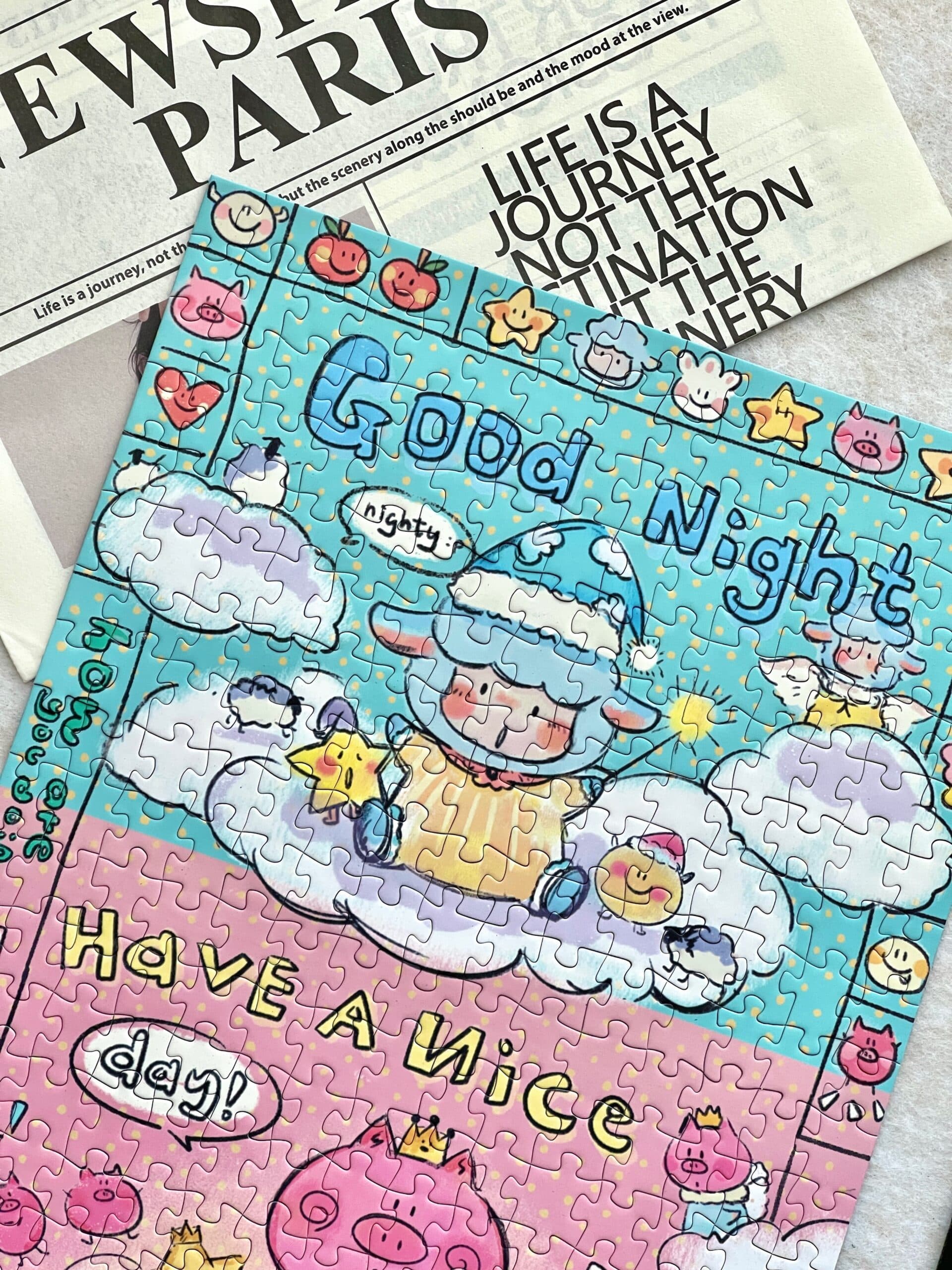 The Nighty Night 300-piece velvet art puzzle depicts Baudelaire the little lamb and his friends resting upon soft clouds, surrounded by twinkling stars as they whisper a gentle good night. Made with premium imported blue card and a velvet-touch finish, it offers both a soothing image and a delightful assembling experience.