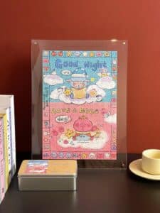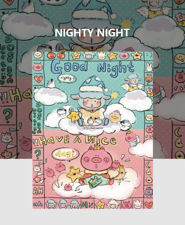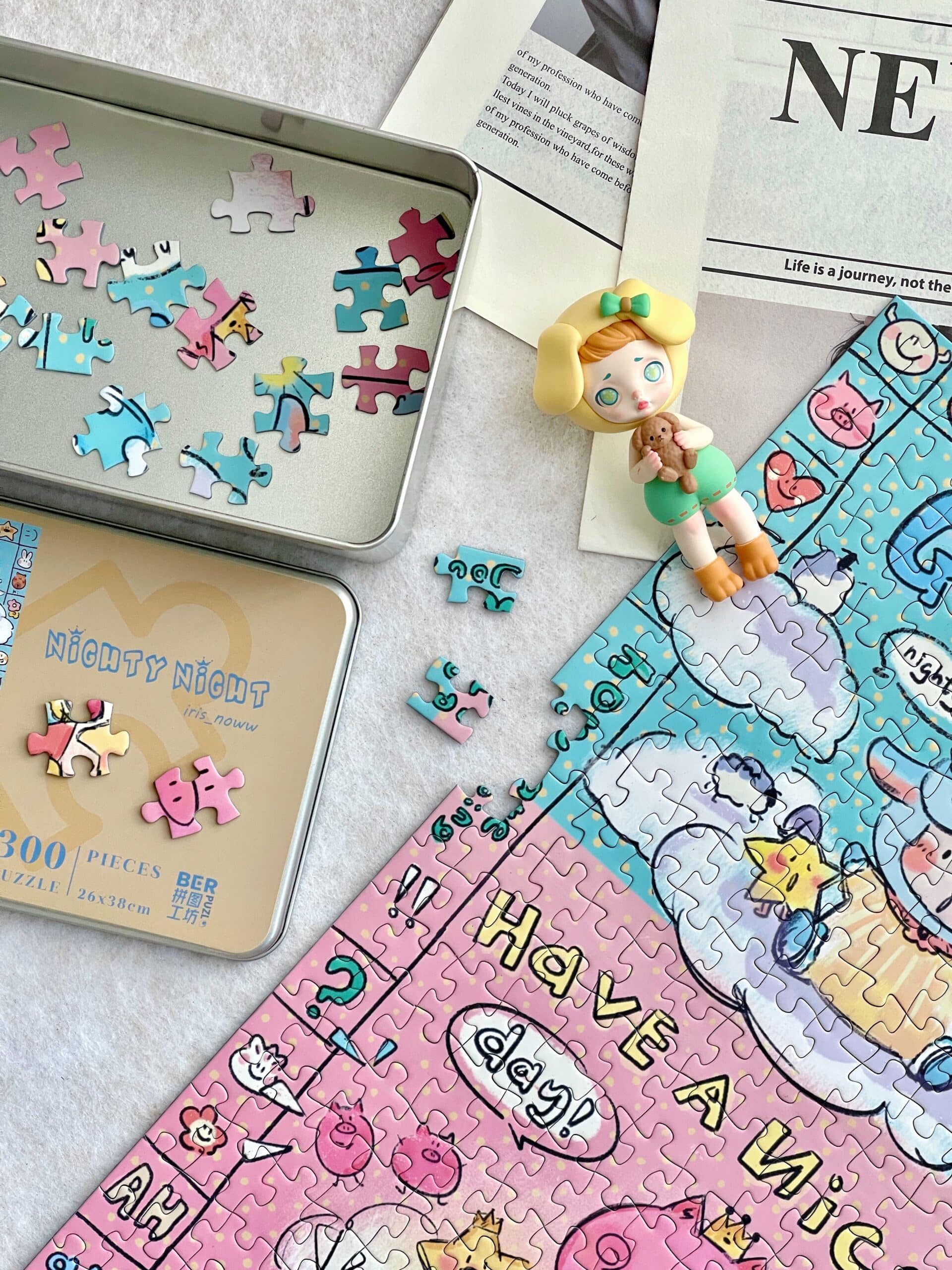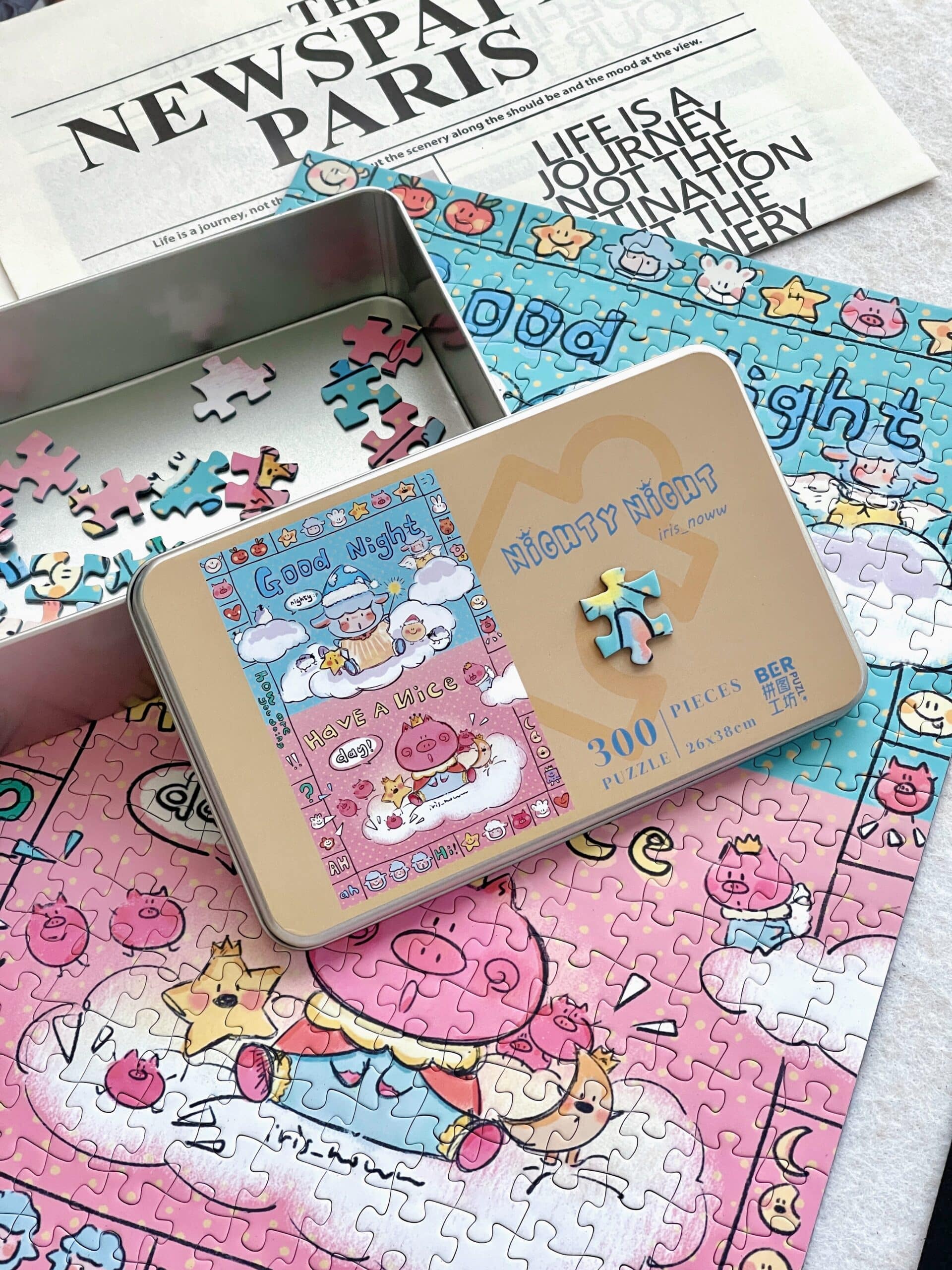 The Nighty Night 300-piece velvet art puzzle depicts Baudelaire the little lamb and his friends resting upon soft clouds, surrounded by twinkling stars as they whisper a gentle good night. Made with premium imported blue card and a velvet-touch finish, it offers both a soothing image and a delightful assembling experience.