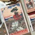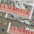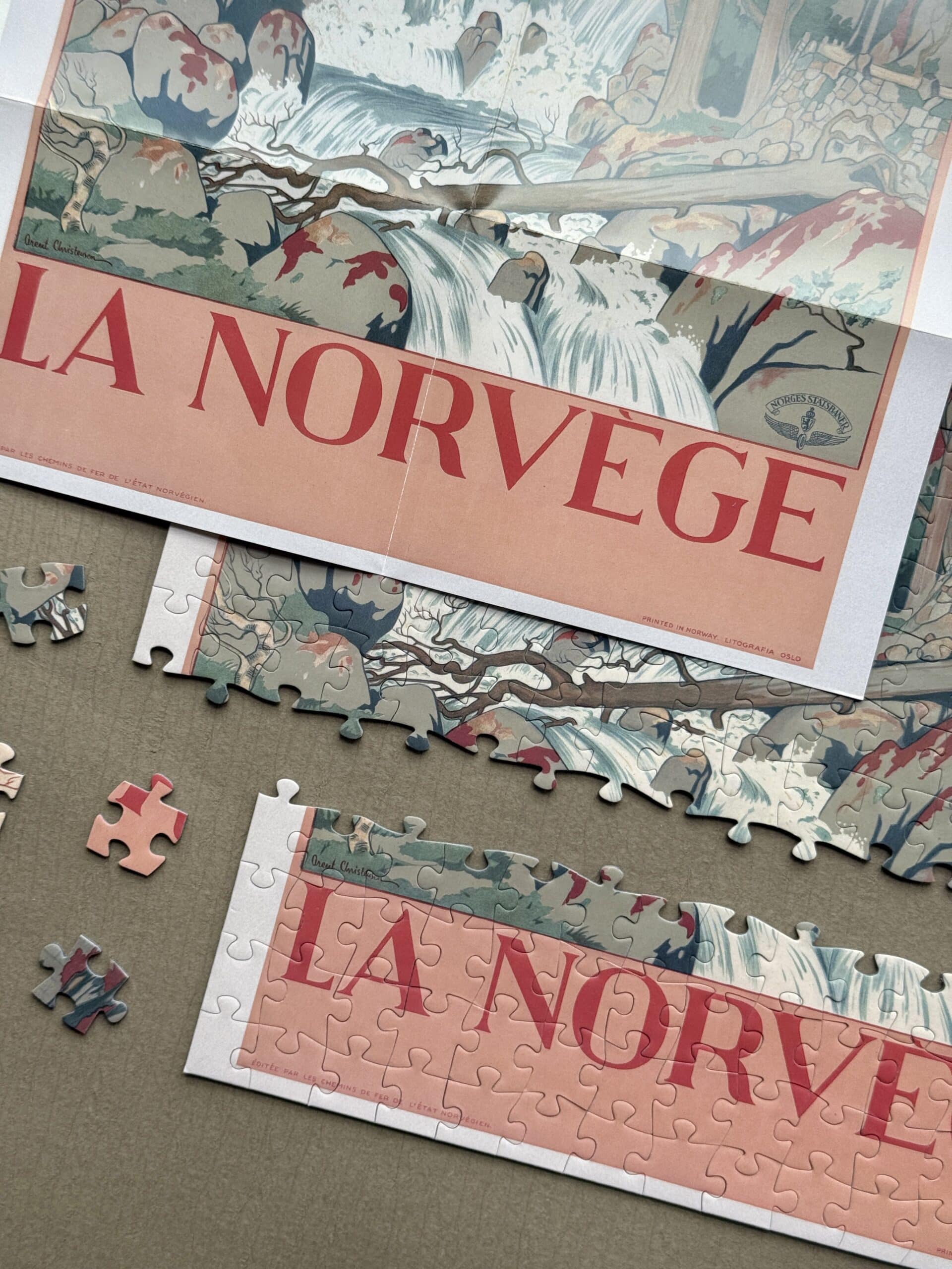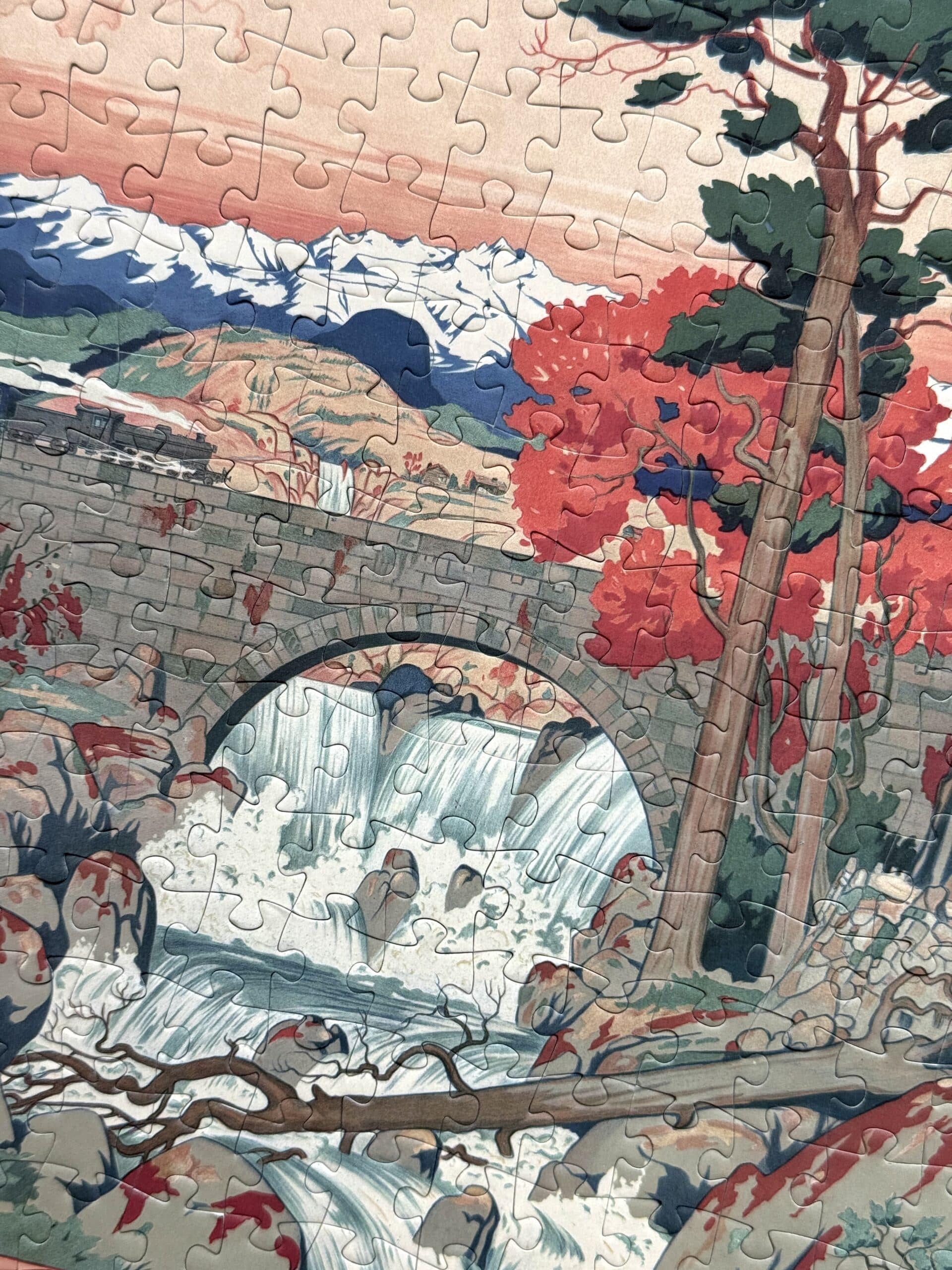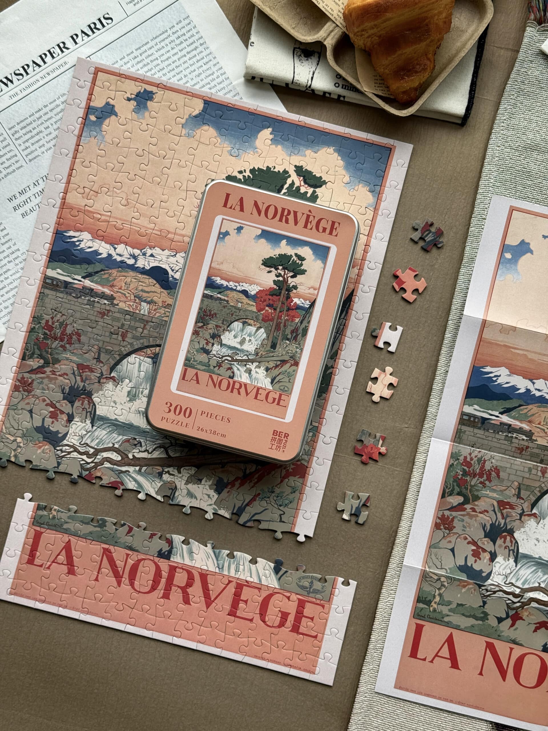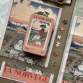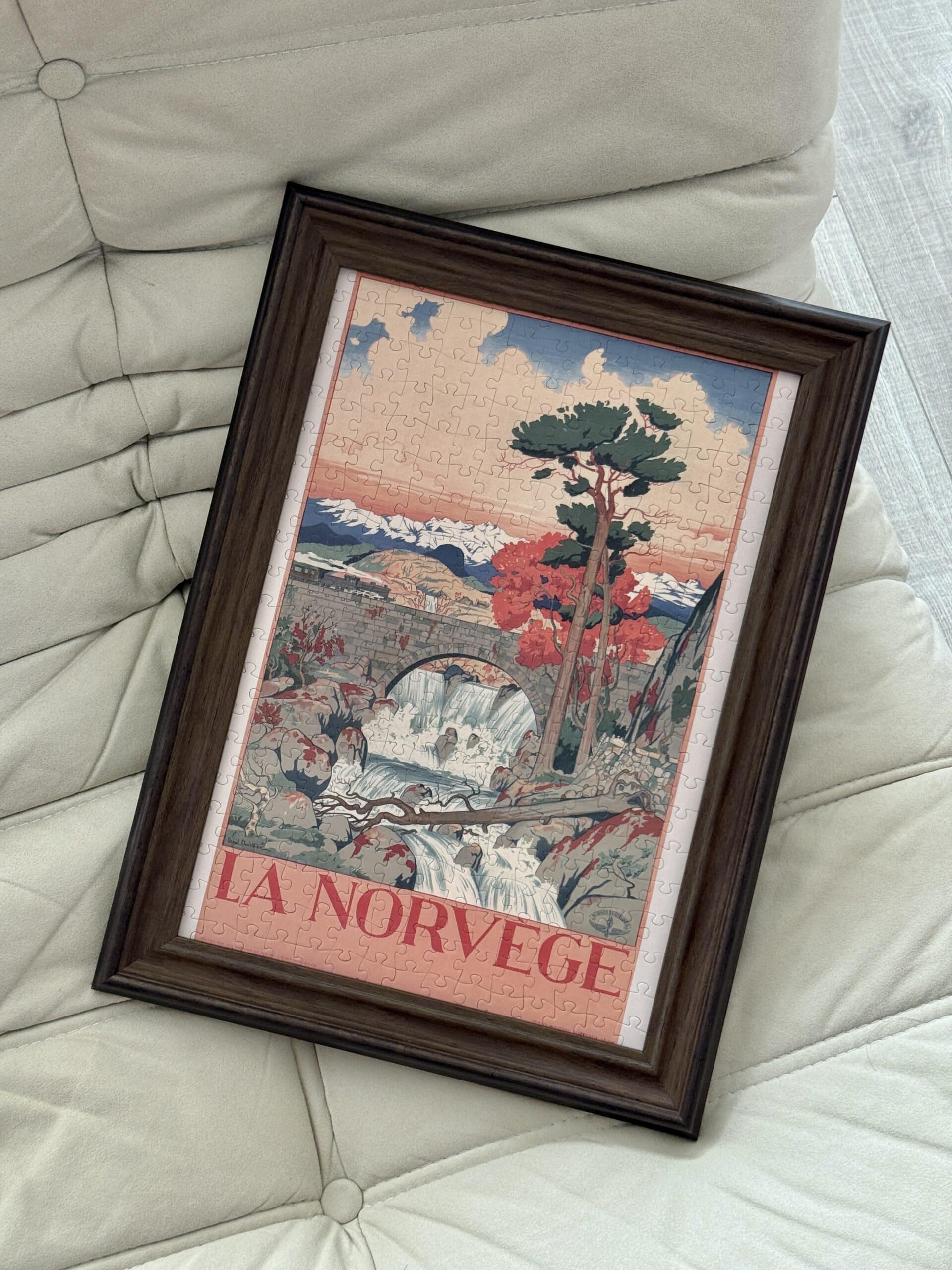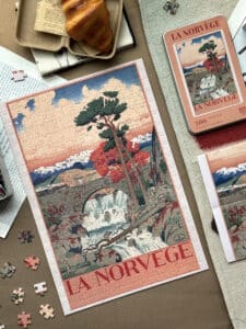 Norway 300-piece velvet puzzle depicts a tranquil river scene with a bridge and distant mountains in vintage poster style. Made on premium imported blue card with matte velvet finish for a peaceful and compact assembling experience.