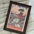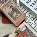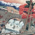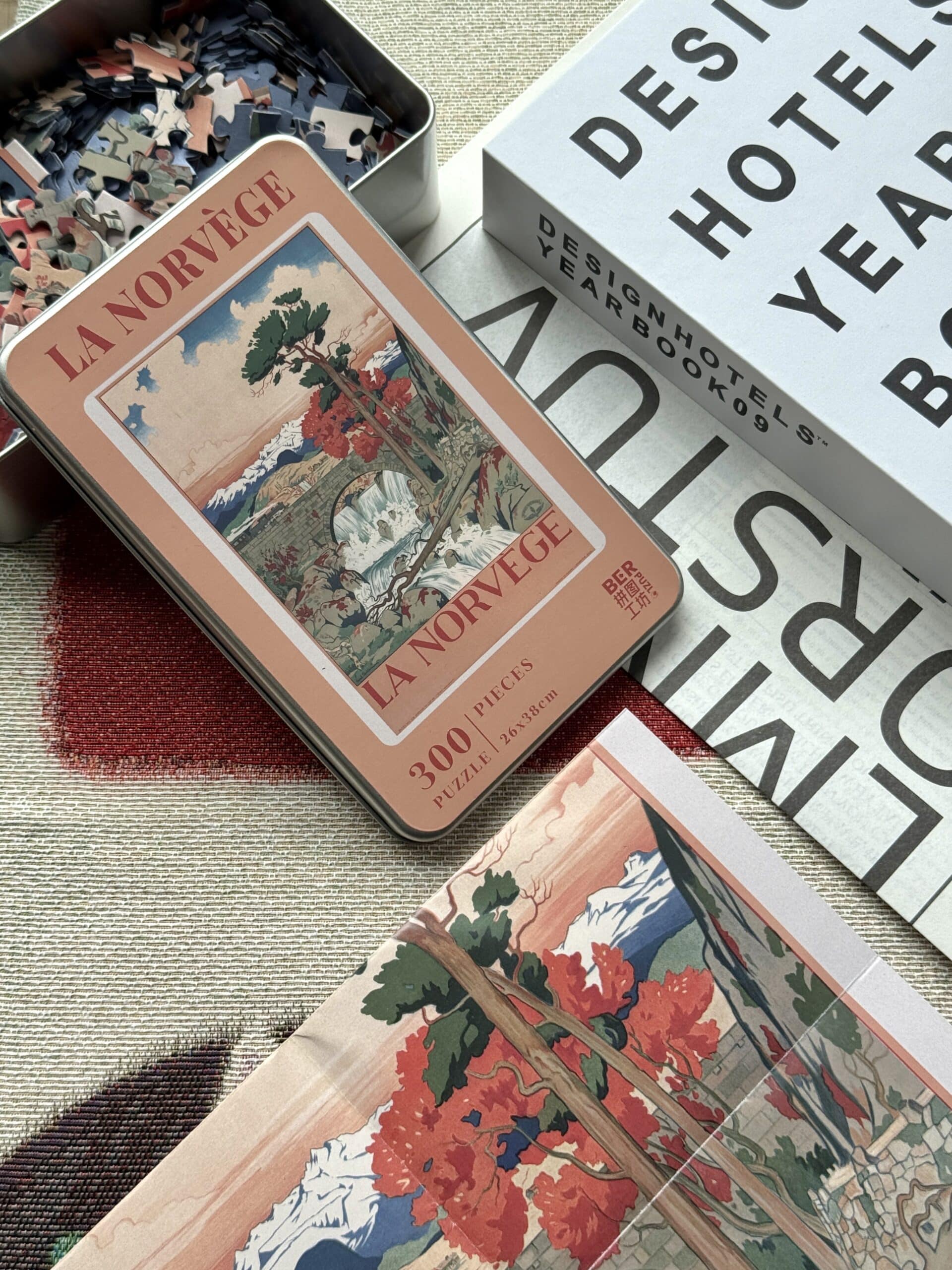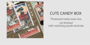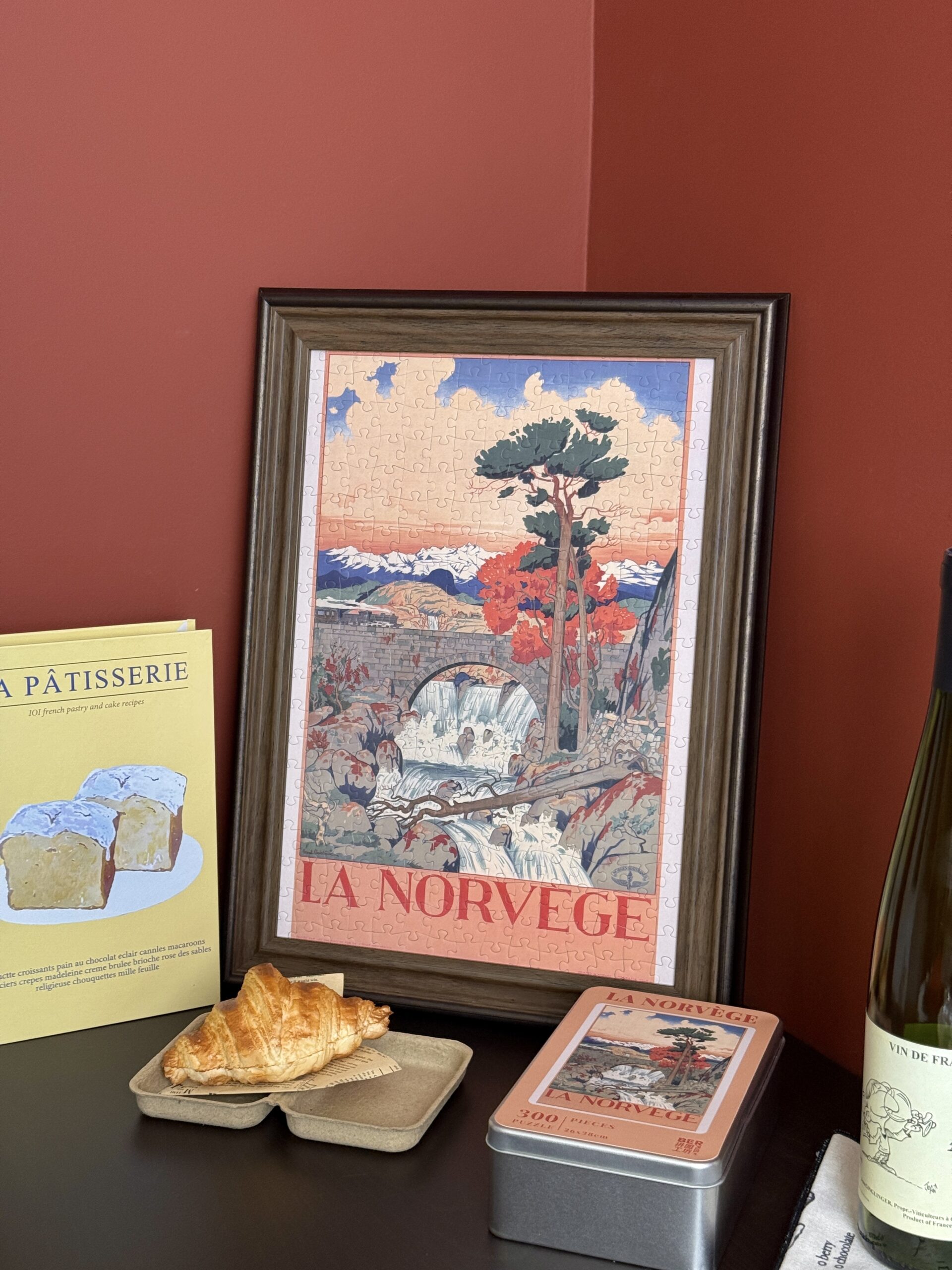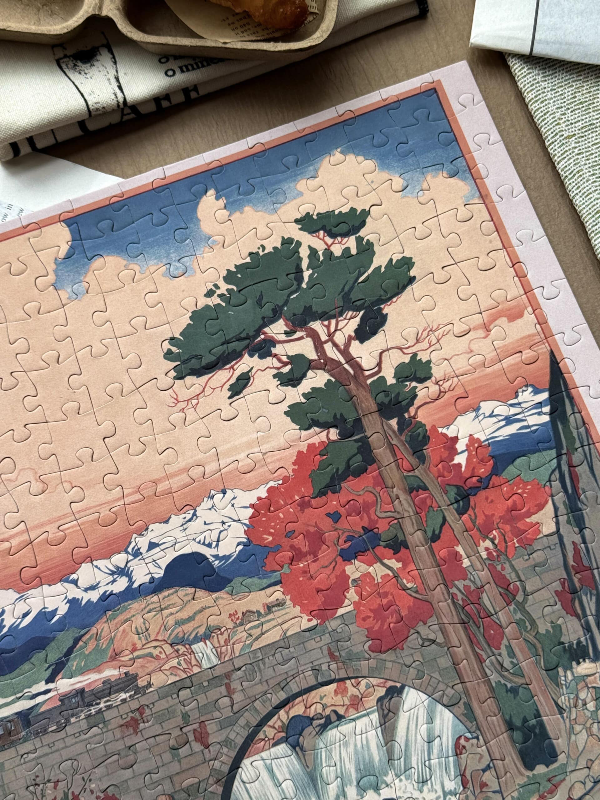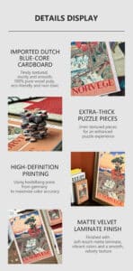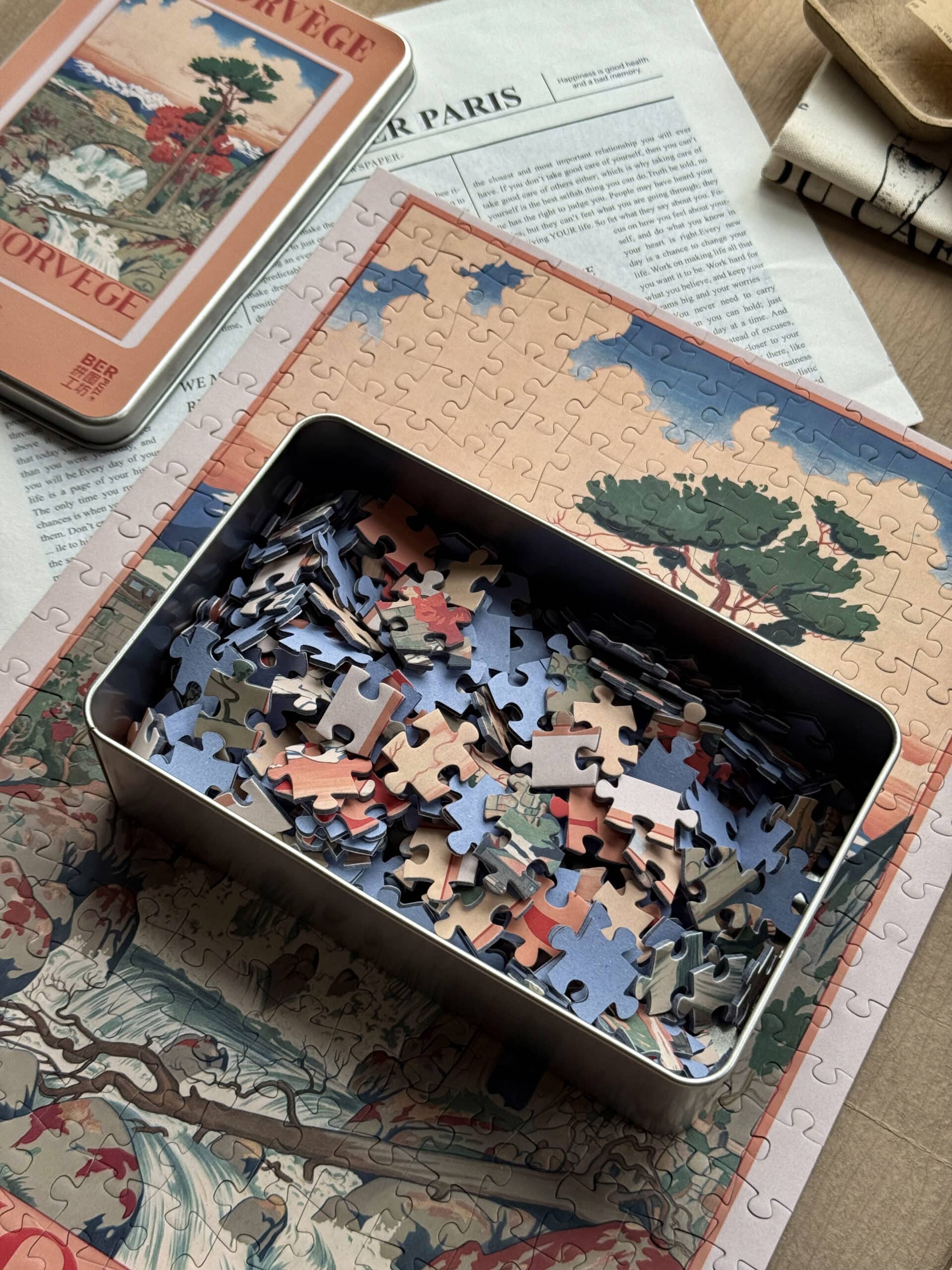 Norway 300-piece velvet puzzle depicts a tranquil river scene with a bridge and distant mountains in vintage poster style. Made on premium imported blue card with matte velvet finish for a peaceful and compact assembling experience.