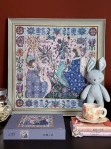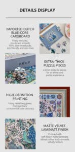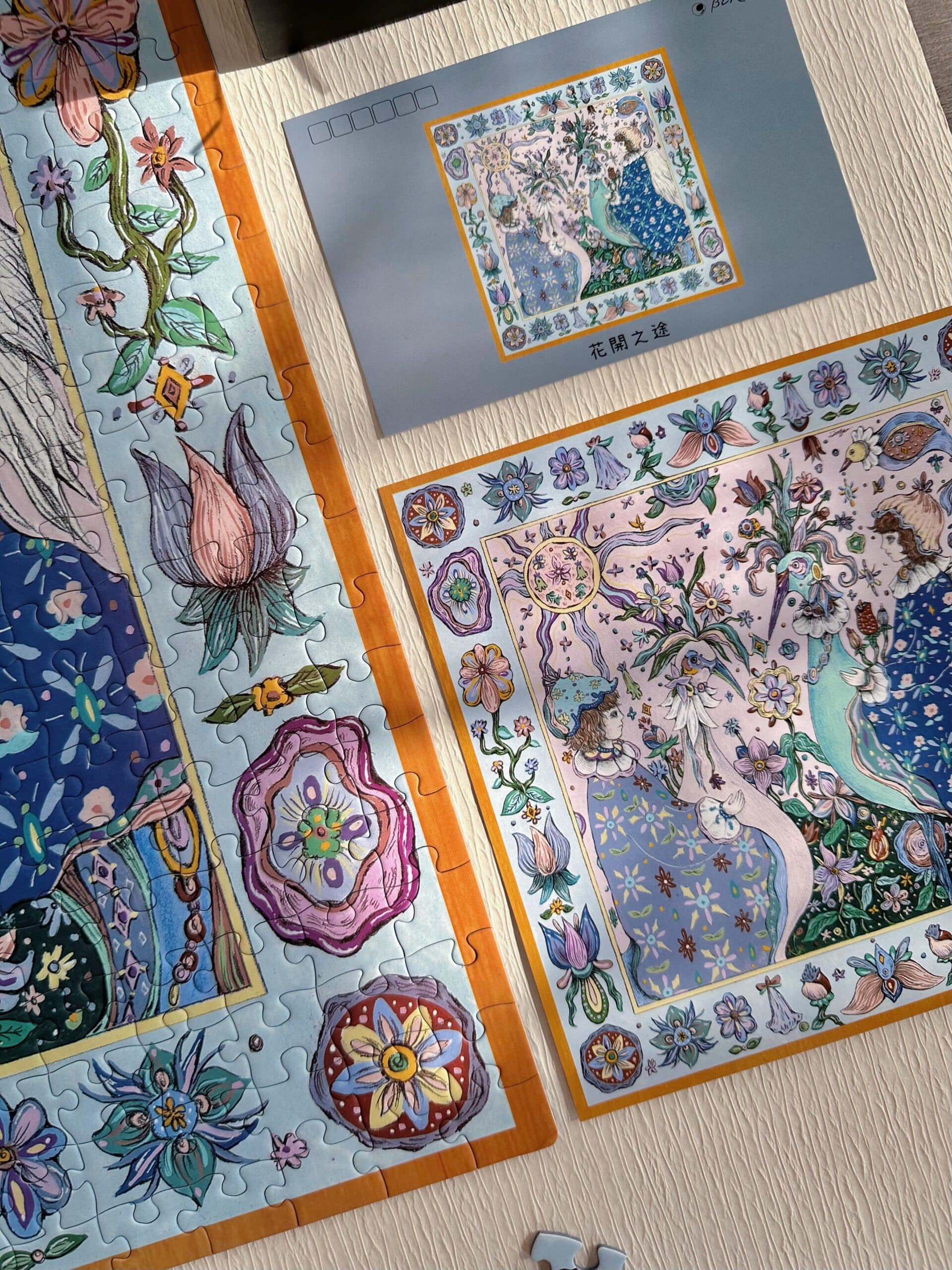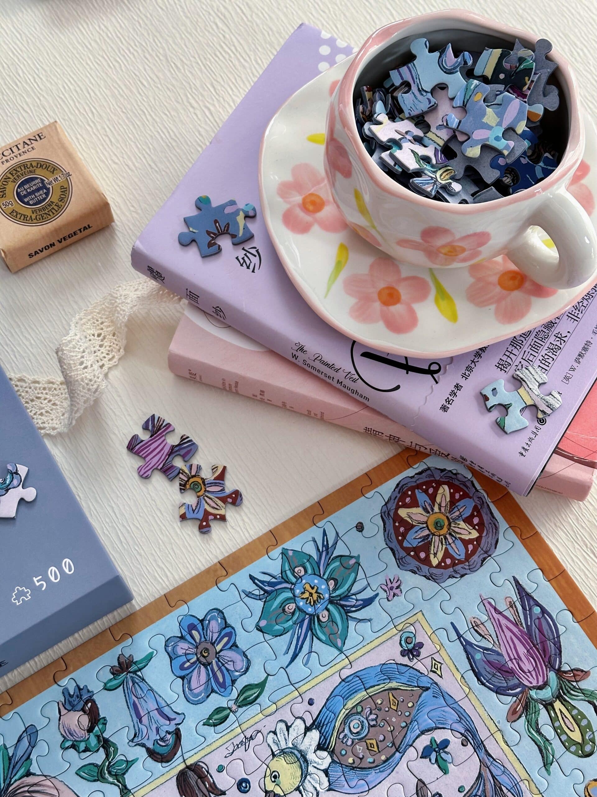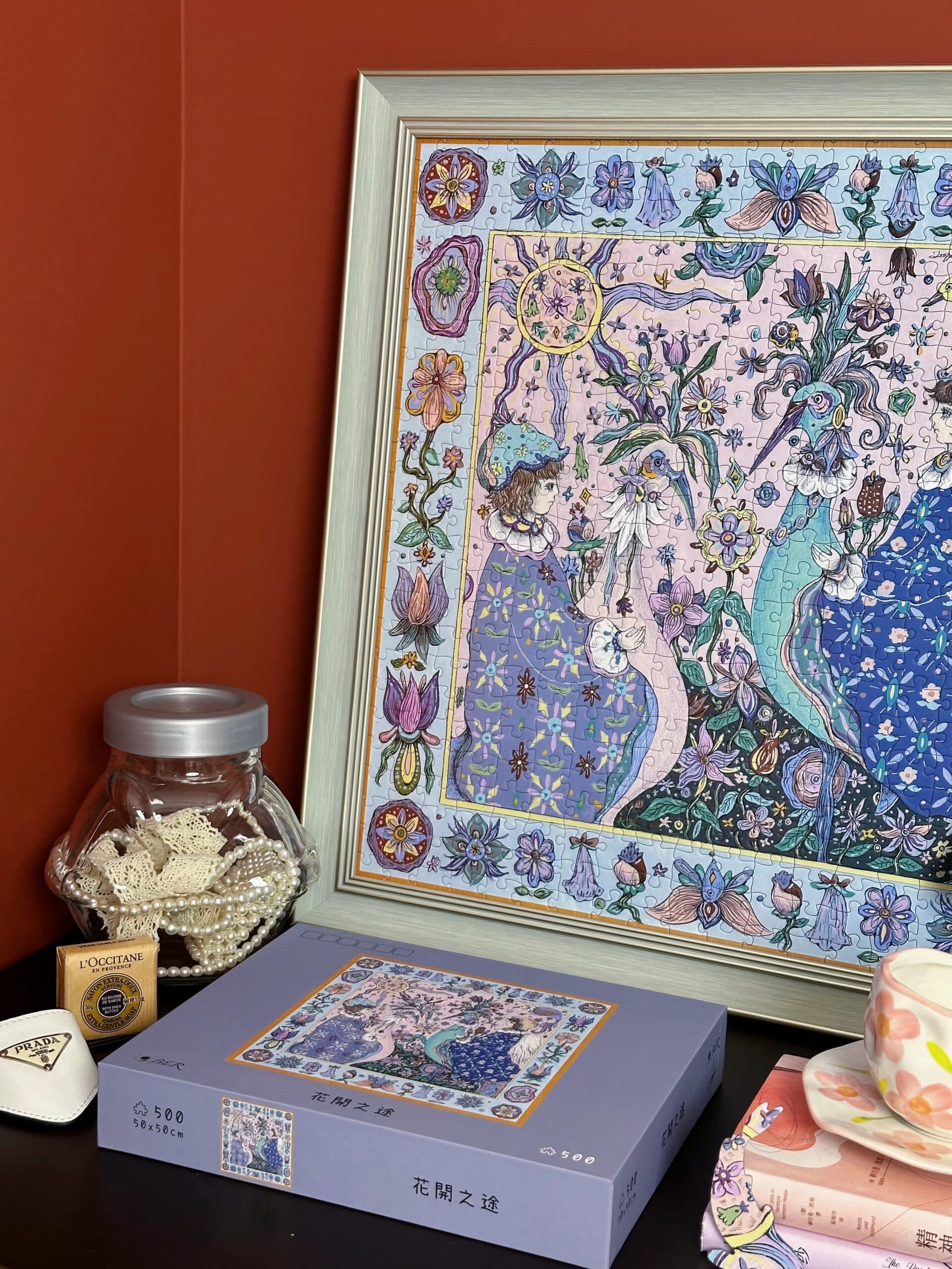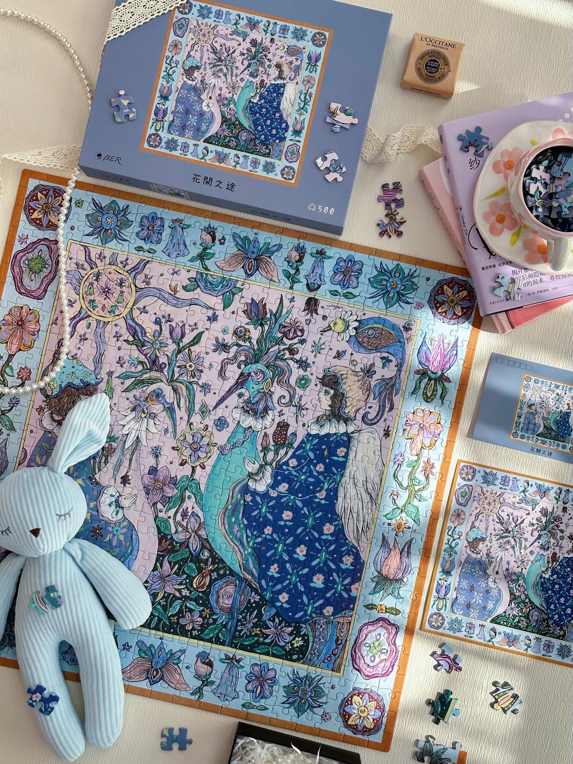 The Path of Blossoms 500-piece velvet art puzzle presents a refined vintage style, with a border of richly varied flowers encircling a central tableau of two refined youths cradling graceful birds amid a garden in bloom. Mirroring the cycles of nature and the shifting states of human emotion, the artwork conveys a poetic journey of self-care and renewal. Crafted from premium imported blue card with a velvet-touch finish, the puzzle offers a serene and uplifting experience.