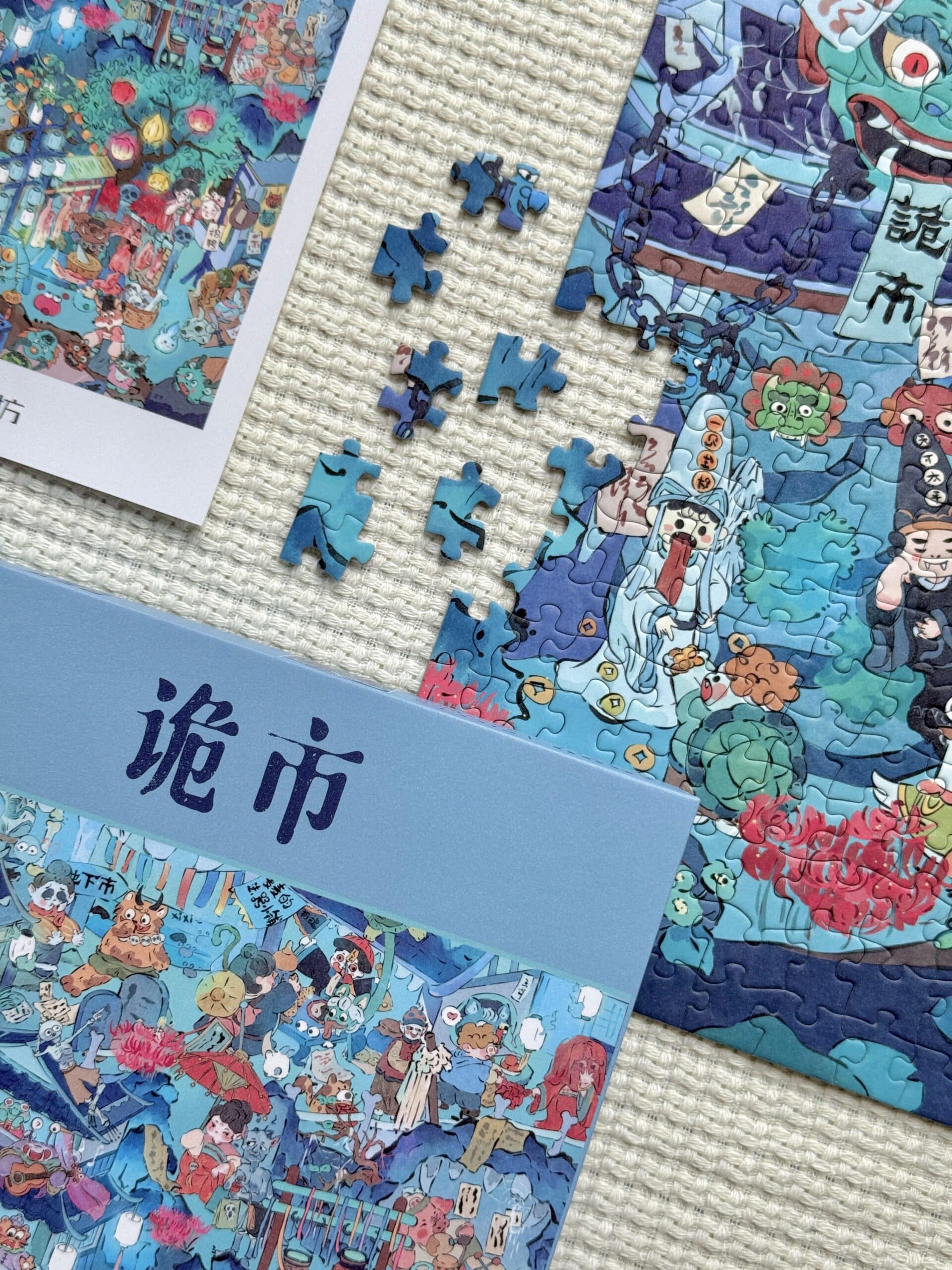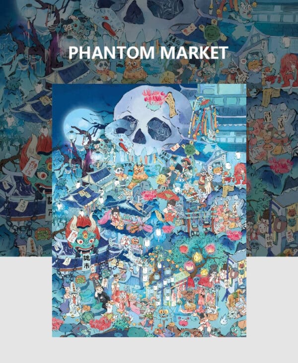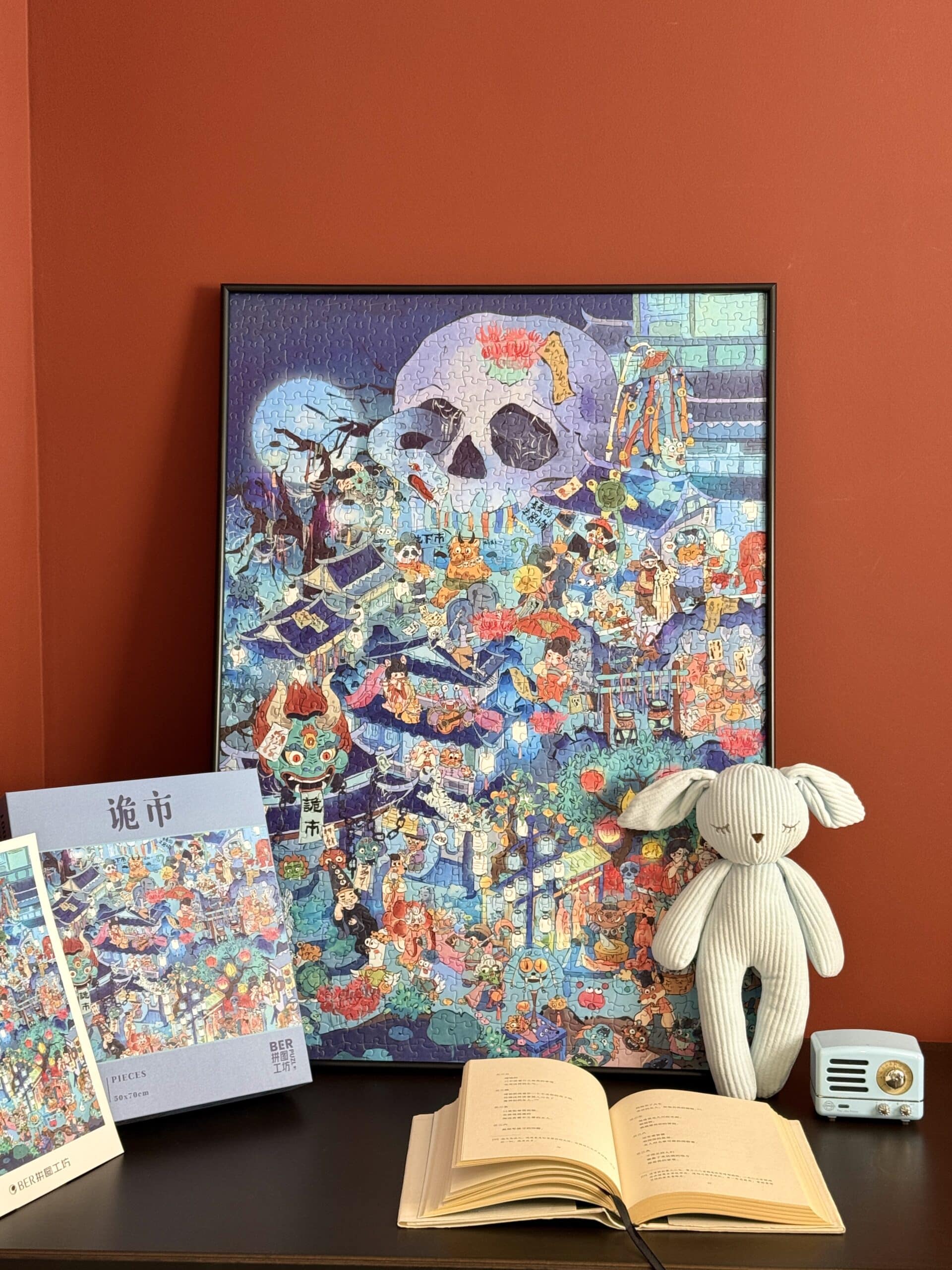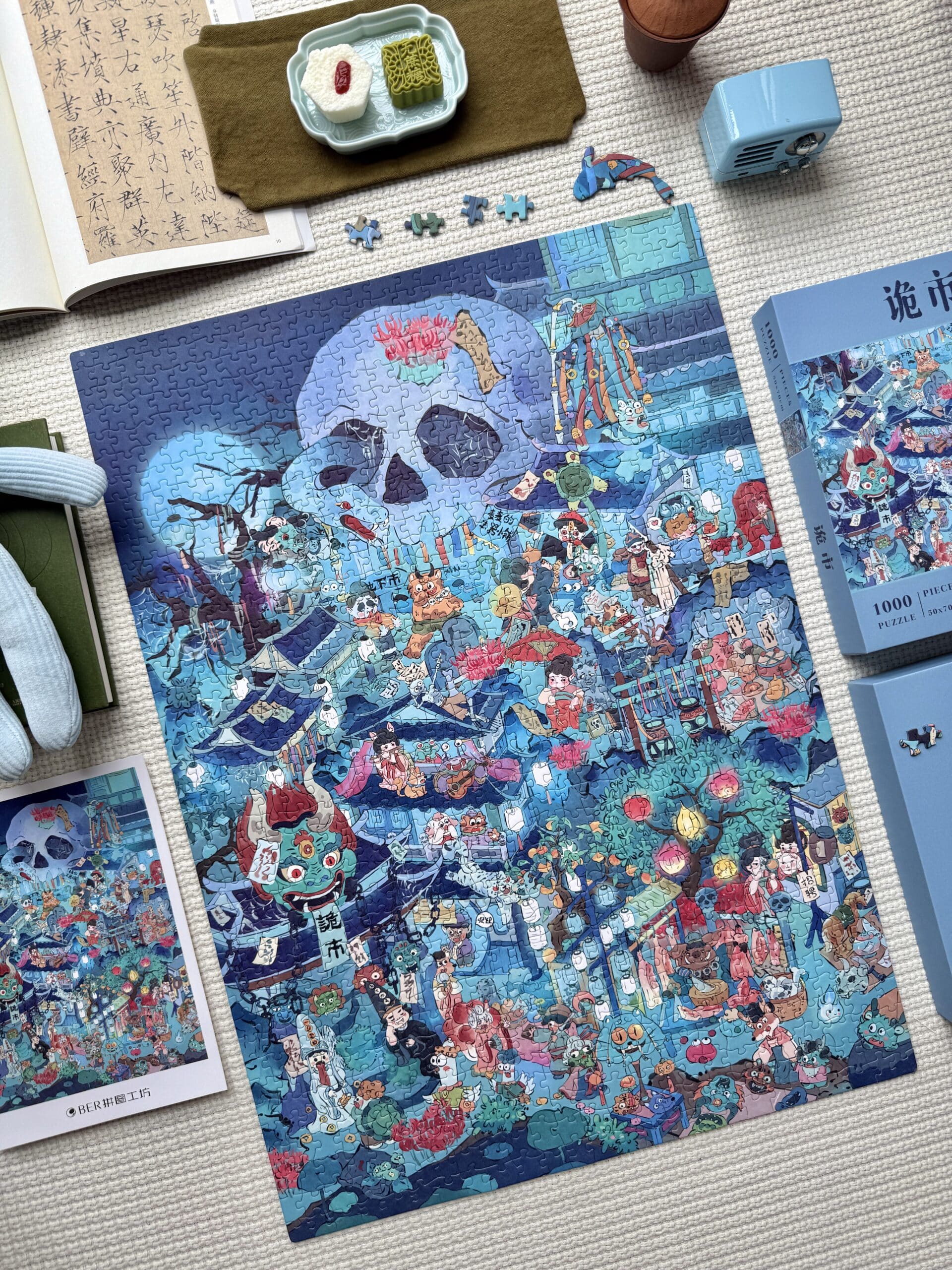 Phantom Market 1000-piece velvet art puzzle, made from premium blue card with a micro-glitter finish, captures a lively nocturnal market where whimsical spirits gather in playful revelry. The sparkling surface and intricate details bring this enchanting, otherworldly scene to life, offering an immersive and delightful assembling experience.