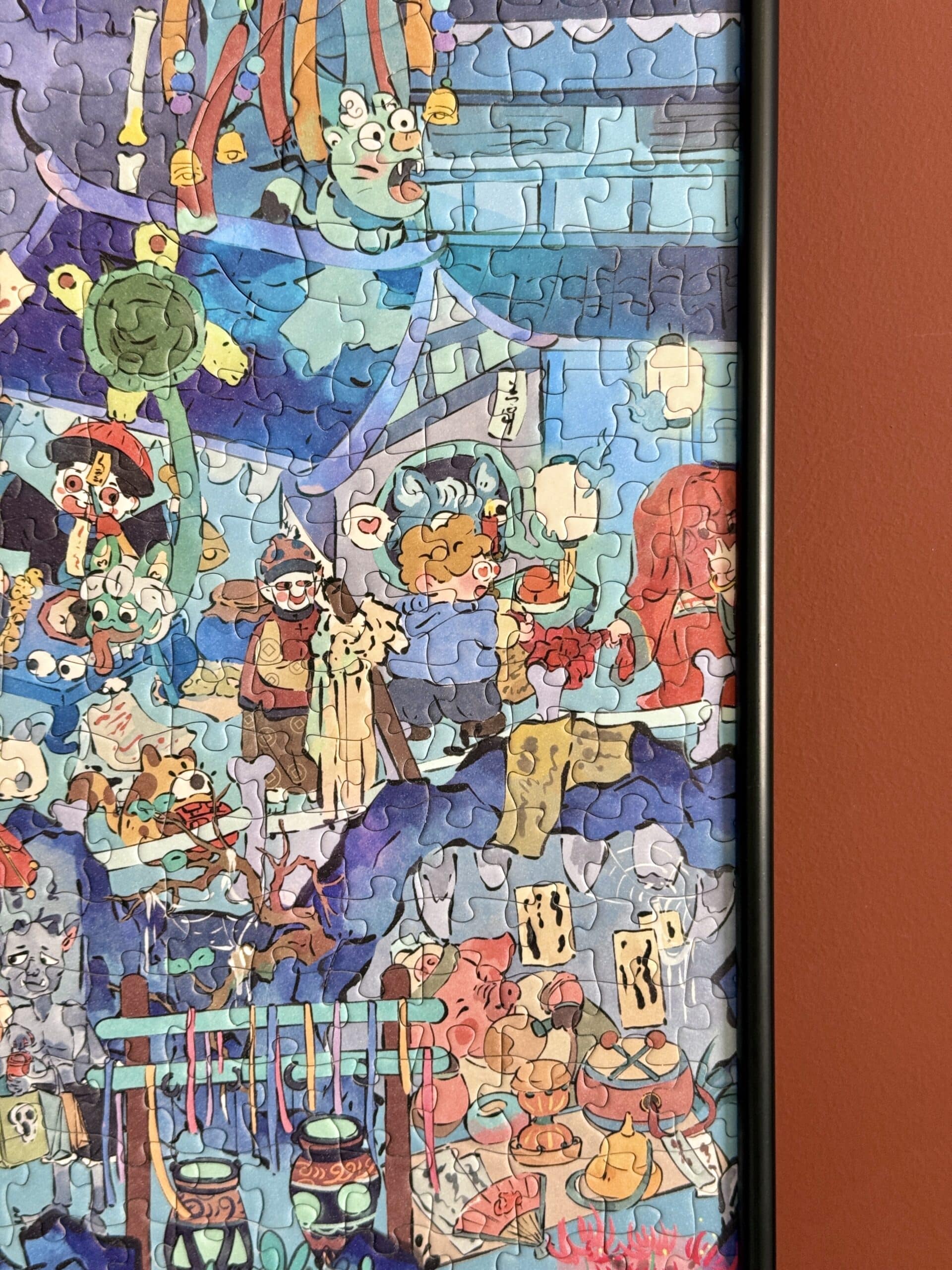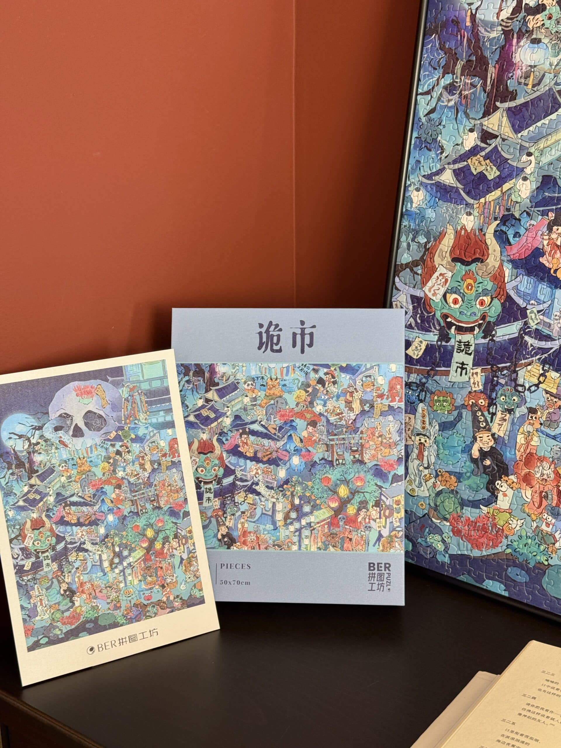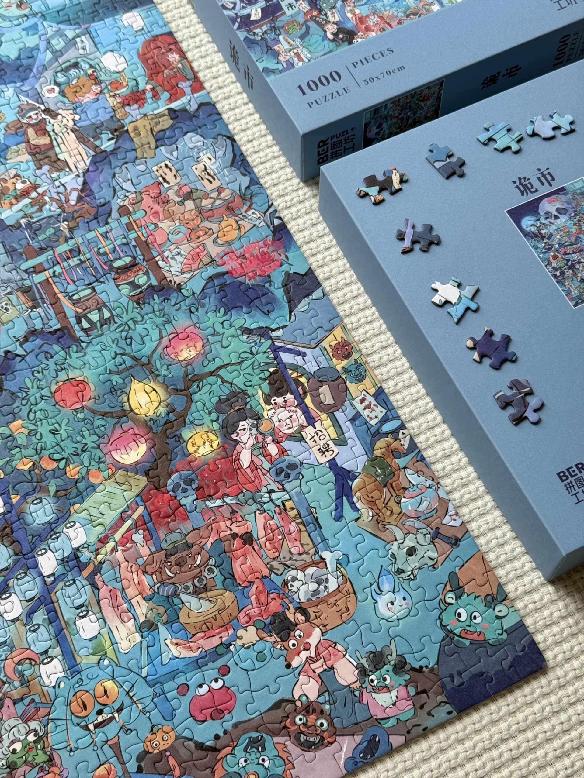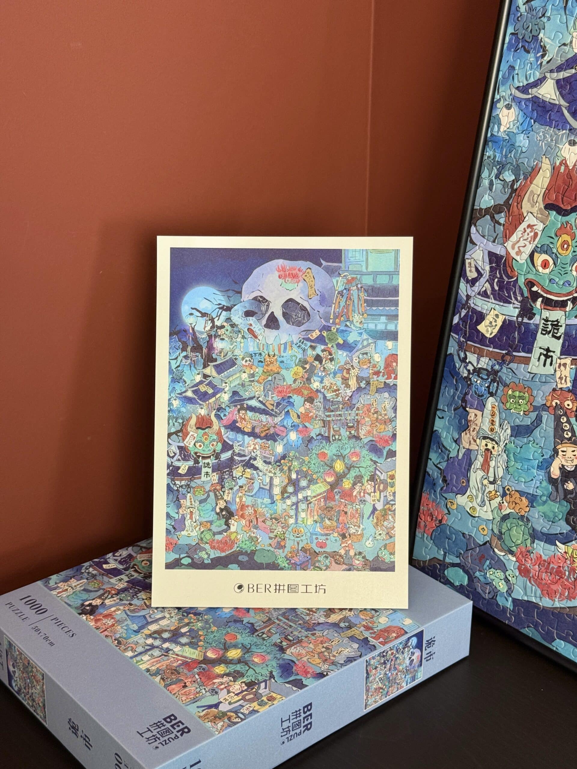 Phantom Market 1000-piece velvet art puzzle, made from premium blue card with a micro-glitter finish, captures a lively nocturnal market where whimsical spirits gather in playful revelry. The sparkling surface and intricate details bring this enchanting, otherworldly scene to life, offering an immersive and delightful assembling experience.