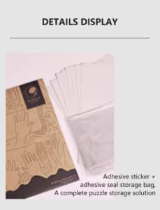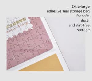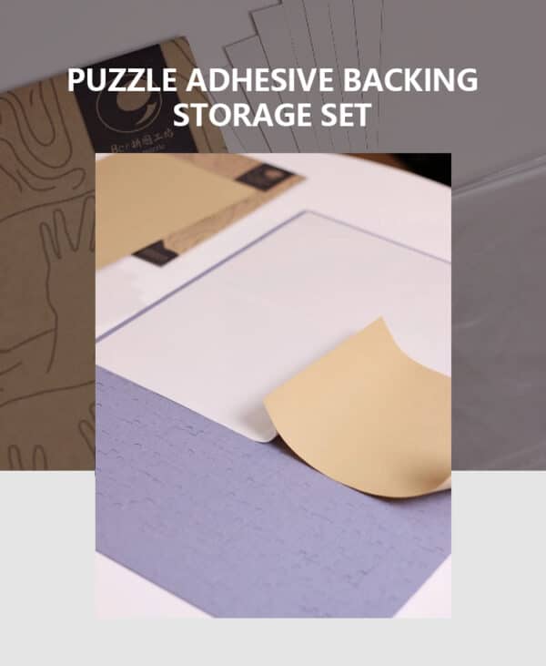 The Puzzle Storage Adhesive Set includes 8 sheets of adhesive sticker (27 × 19.5 cm) and a large adhesive seal storage bag (60 × 80 cm), designed to keep 1000-piece (50 × 70 cm) puzzles secure. The thick adhesive sheets hold puzzle pieces firmly in place, preventing them from shifting or scattering, while the spacious sealed bag protects your work from dust and dirt, offering a convenient and reliable solution for puzzle storage.