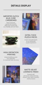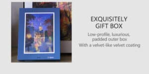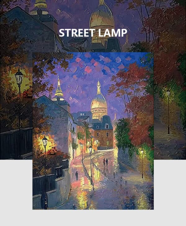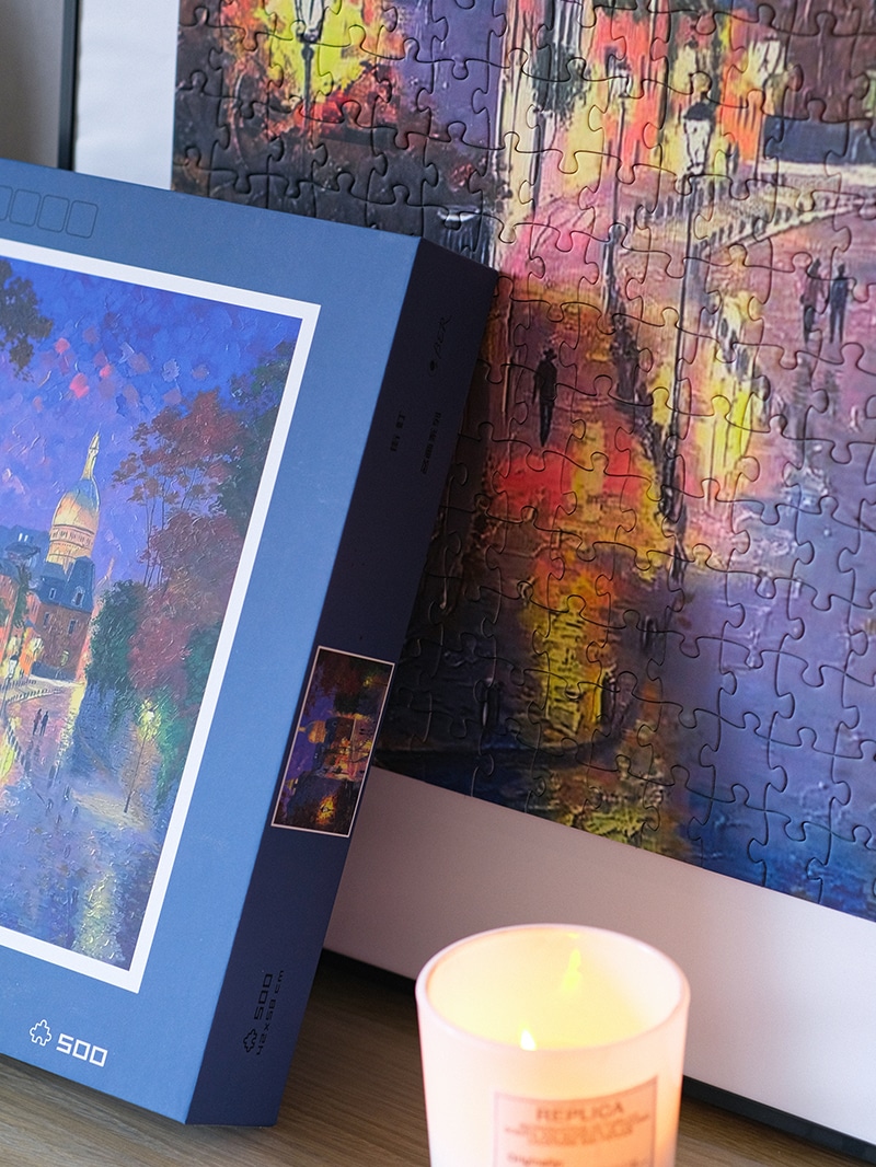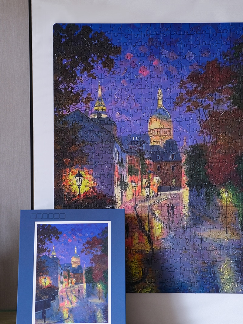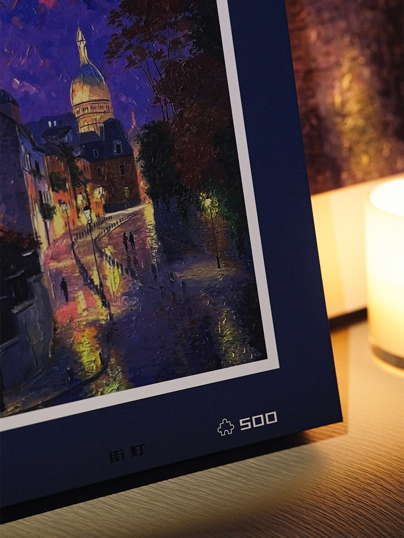 The Street Lights 500-piece velvet art puzzle captures a romantic Parisian night near the Sacré-Cœur Basilica. Viewed from a charming side street, the basilica’s spire peeks above rows of buildings, while glowing street lamps cast warm light onto the façades and rain-soaked cobblestones. Printed on premium blue card with a soft velvet-touch finish, this puzzle offers a beautifully atmospheric and immersive assembling experience.