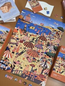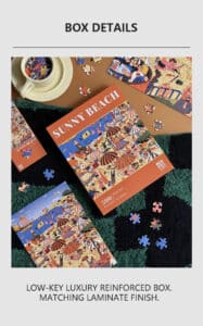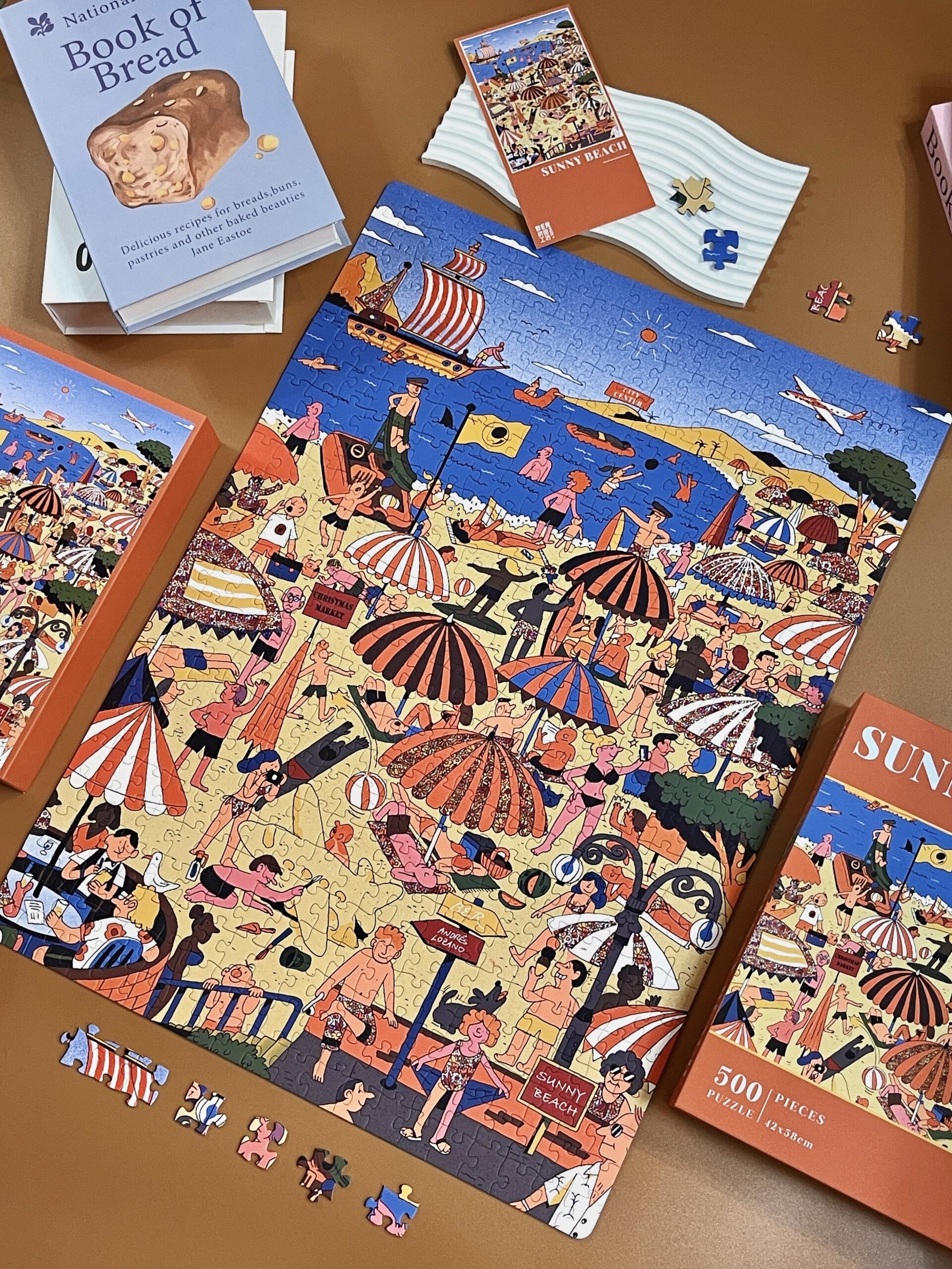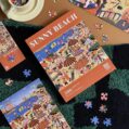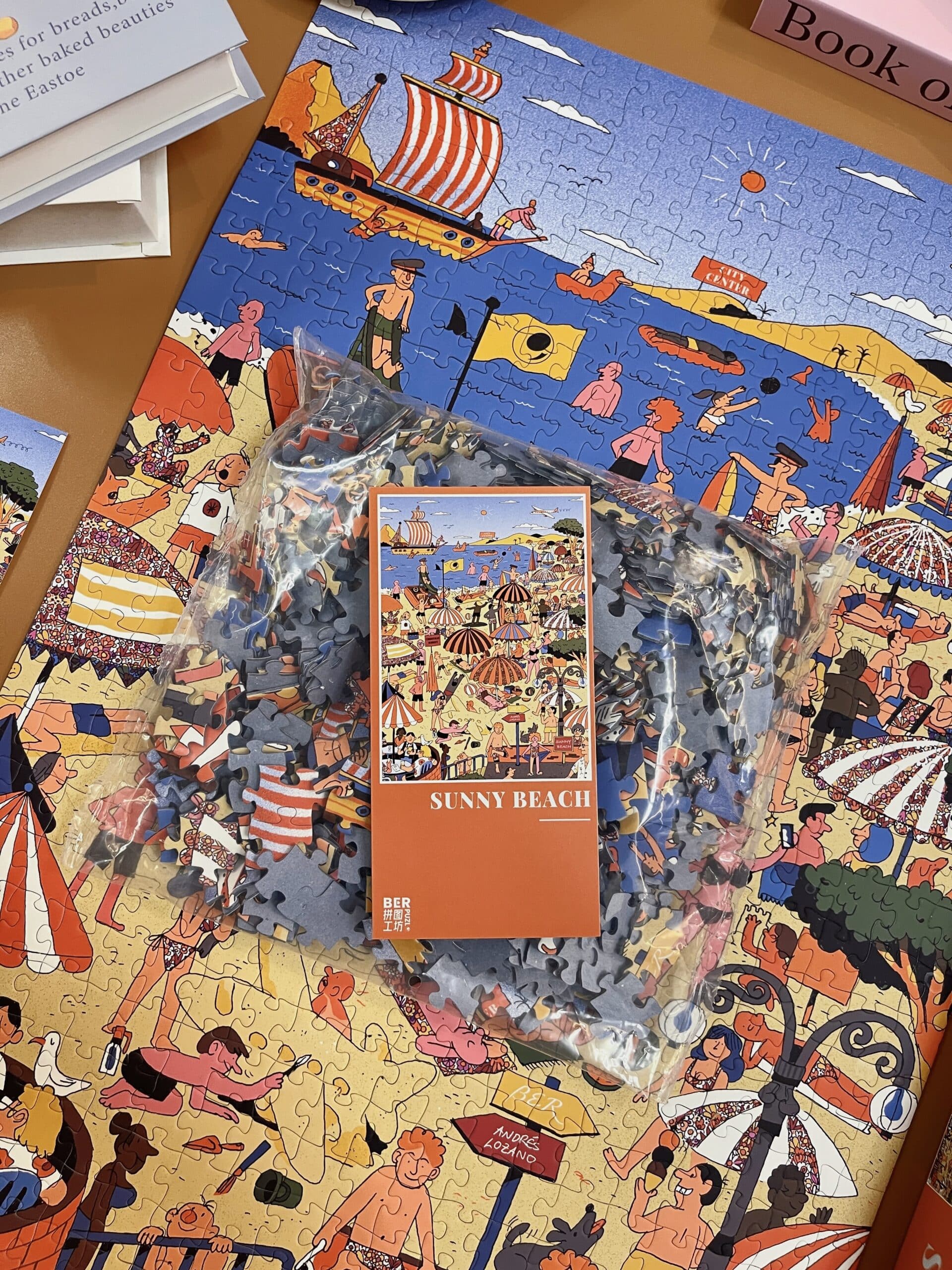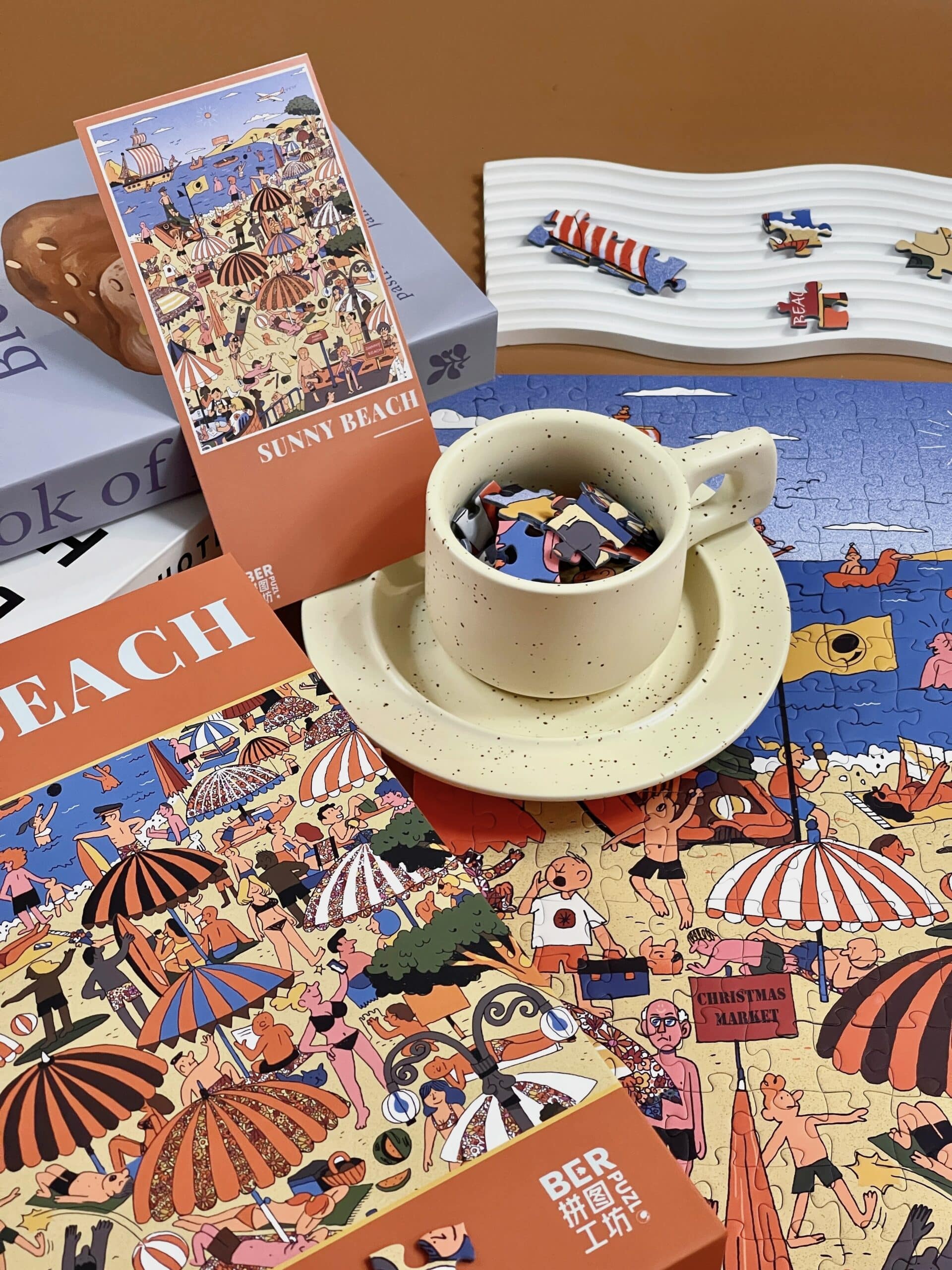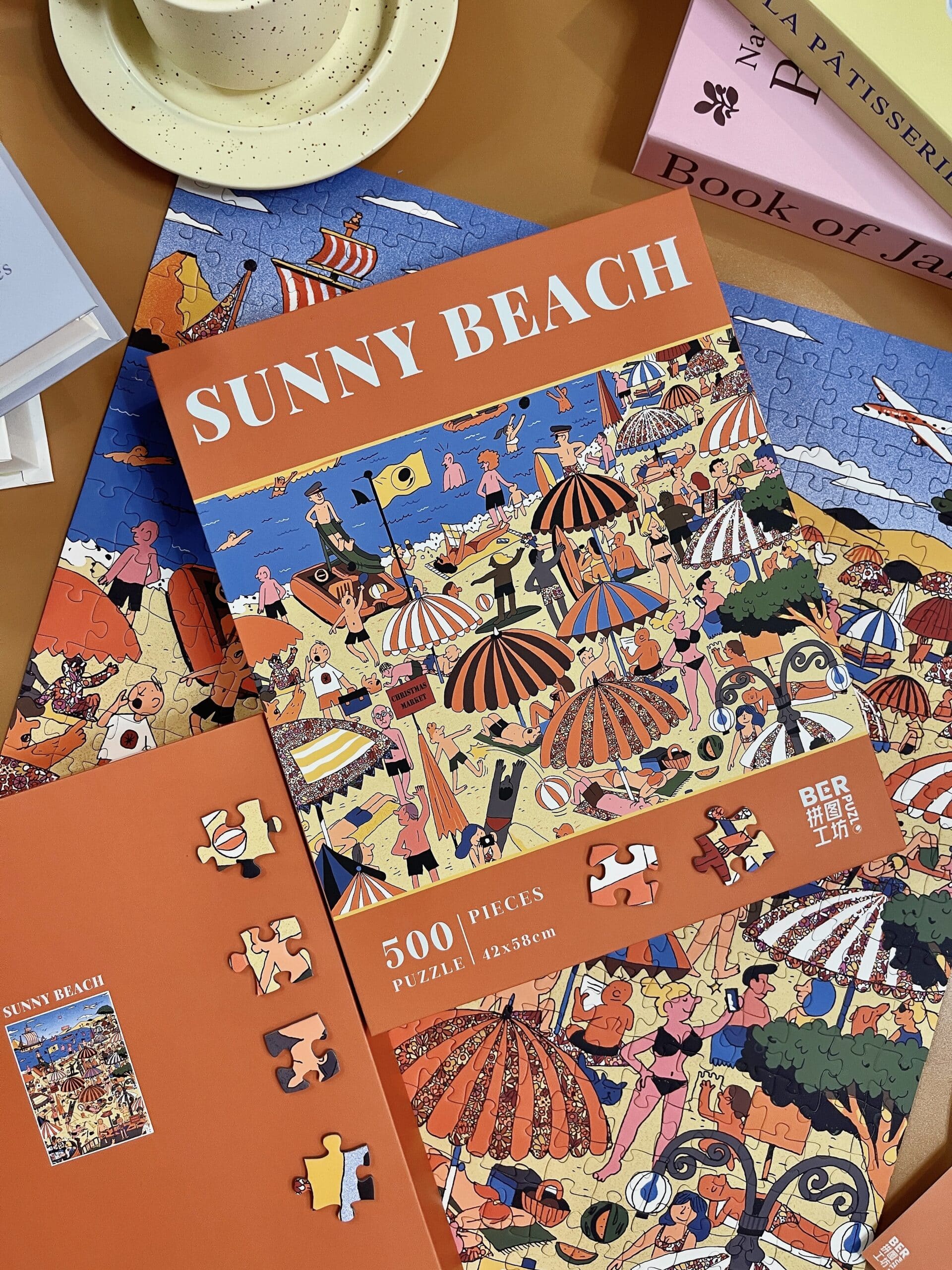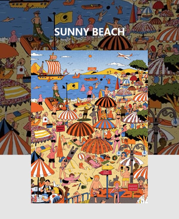 The Sunny Beach 500-piece velvet art puzzle, painted by renowned Spanish artist Andrés Lozano, captures a lively holiday scene on the beach, where visitors enjoy playful and diverse activities. Rendered in a whimsical cartoon style with harmonious, natural colors, the artwork exudes a relaxed and joyful atmosphere. Crafted from premium imported blue card with a velvet-touch finish, assembling the puzzle offers a fun and immersive experience.