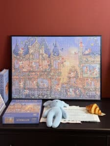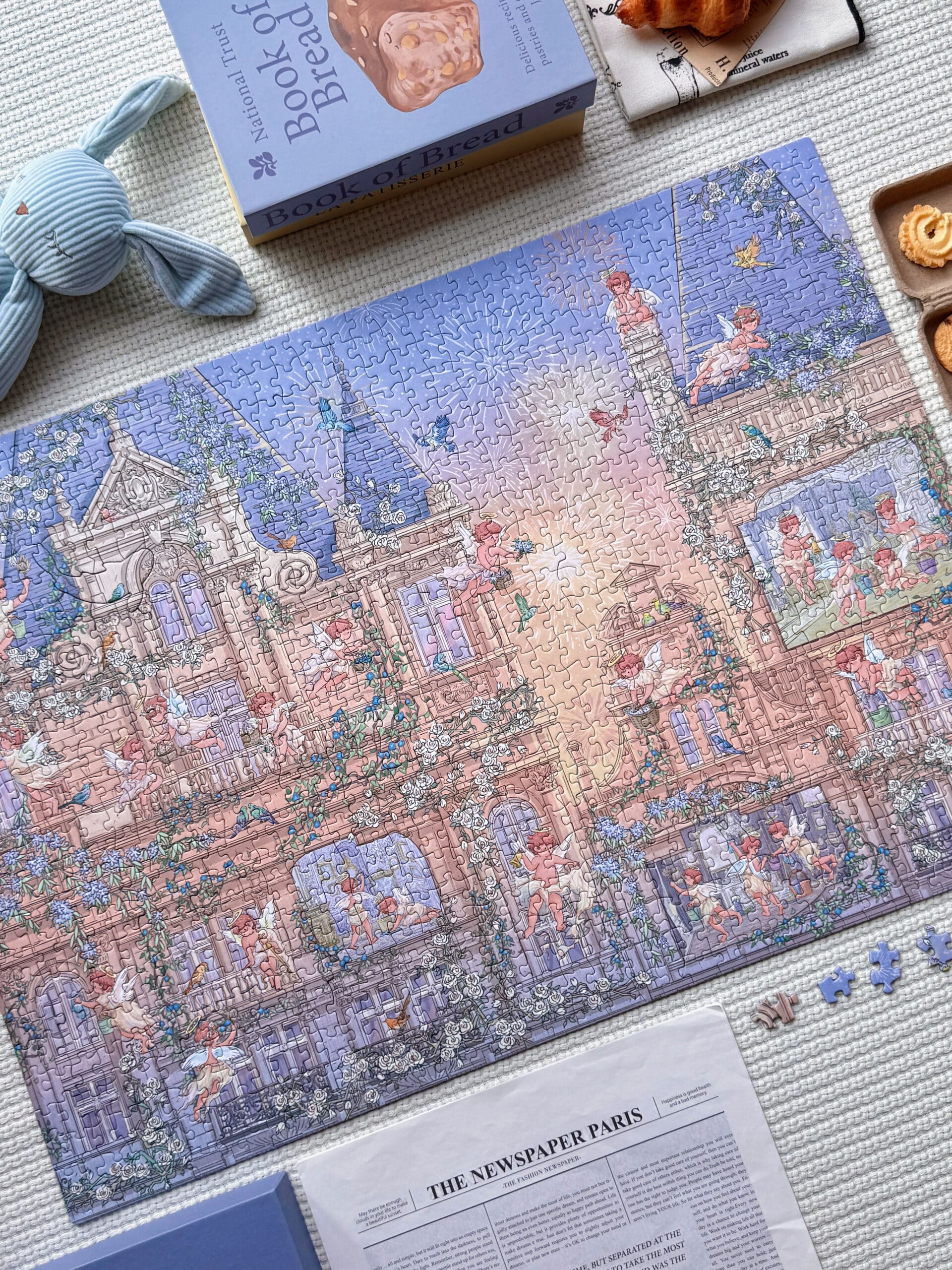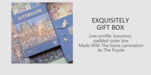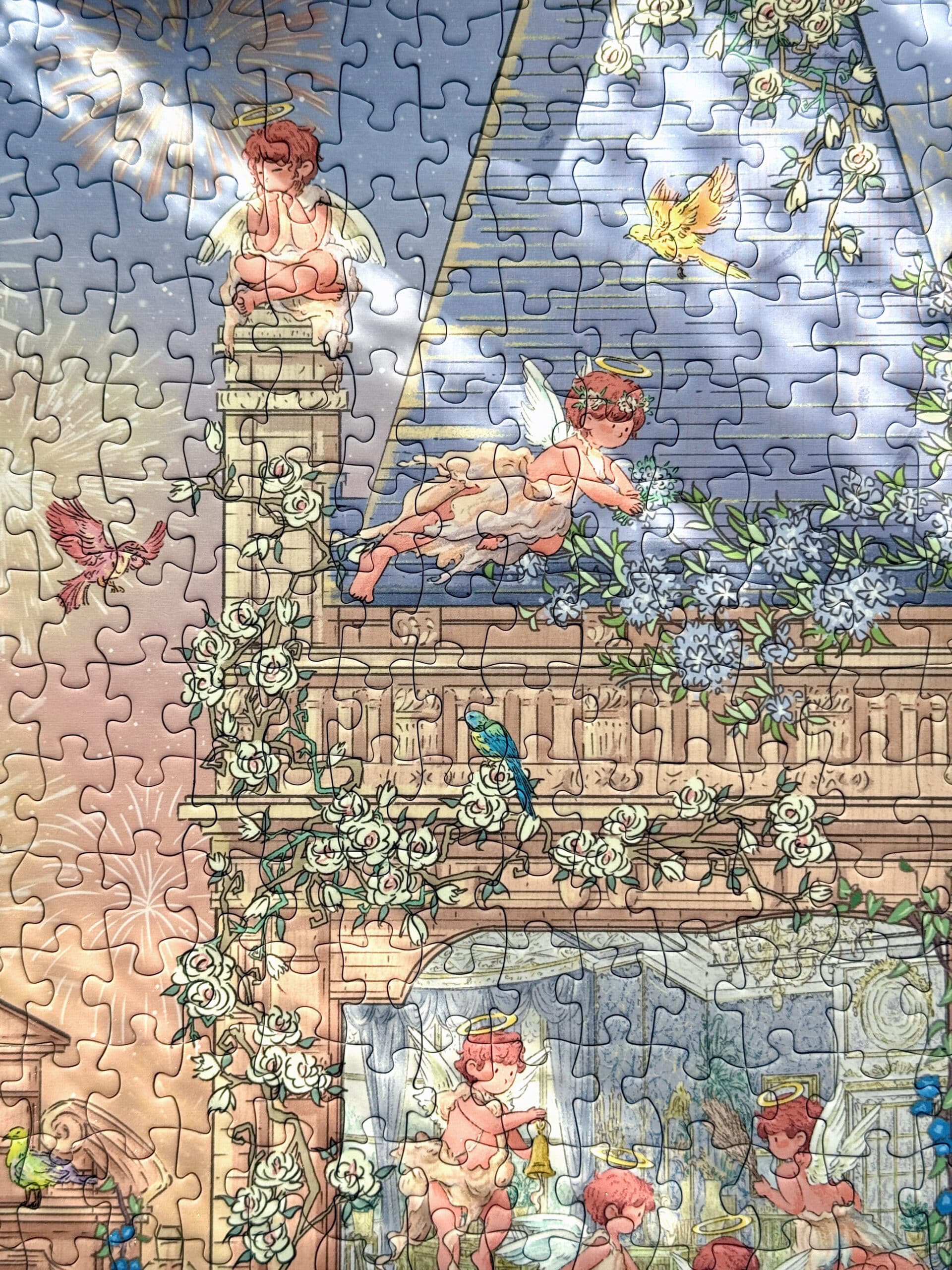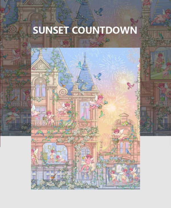 THE SUNSET COUNTDOWN 1000-PIECE ART PUZZLE PRESENTS A GENTLE, STORYBOOK-STYLE VISION OF A CASTLE GLOWING IN THE WARM LIGHT OF DUSK, SOFTENED BY GENTLE, LUMINOUS COLORS, WITH ANGELS ADORNING THE TOWERS IN A SCENE OF CELEBRATION. PRINTED ON PREMIUM IMPORTED BLUE CARD WITH AN ELEGANT BRUSHED TEXTURE AND SUBTLE SHIMMERING EFFECT, IT OFFERS A SOOTHING AND REWARDING ASSEMBLING EXPERIENCE.