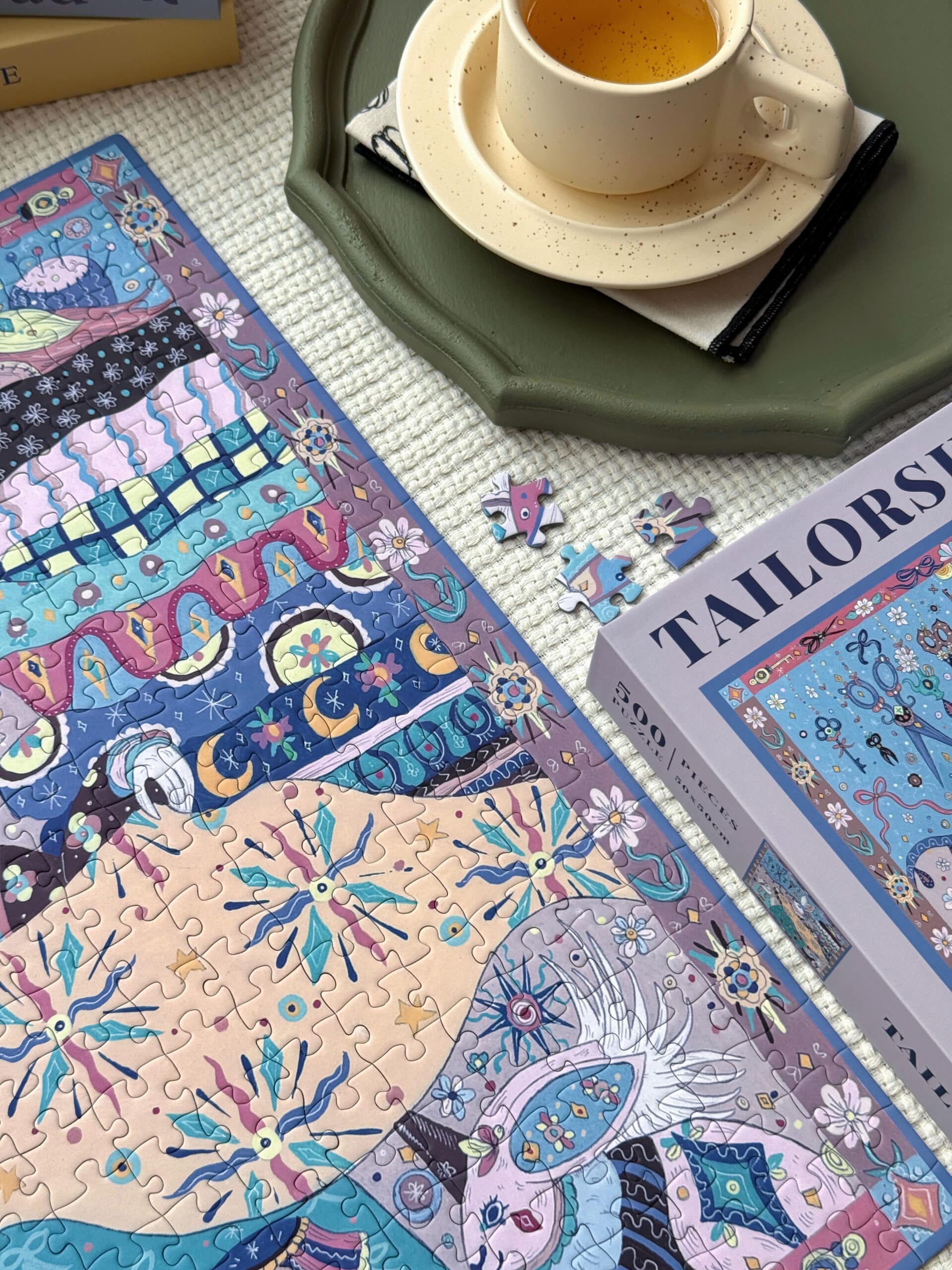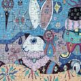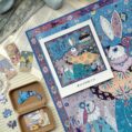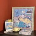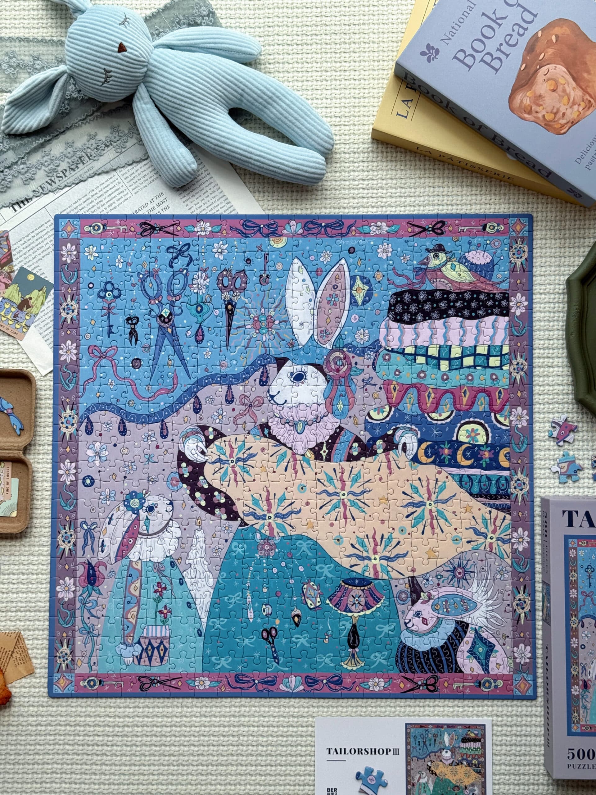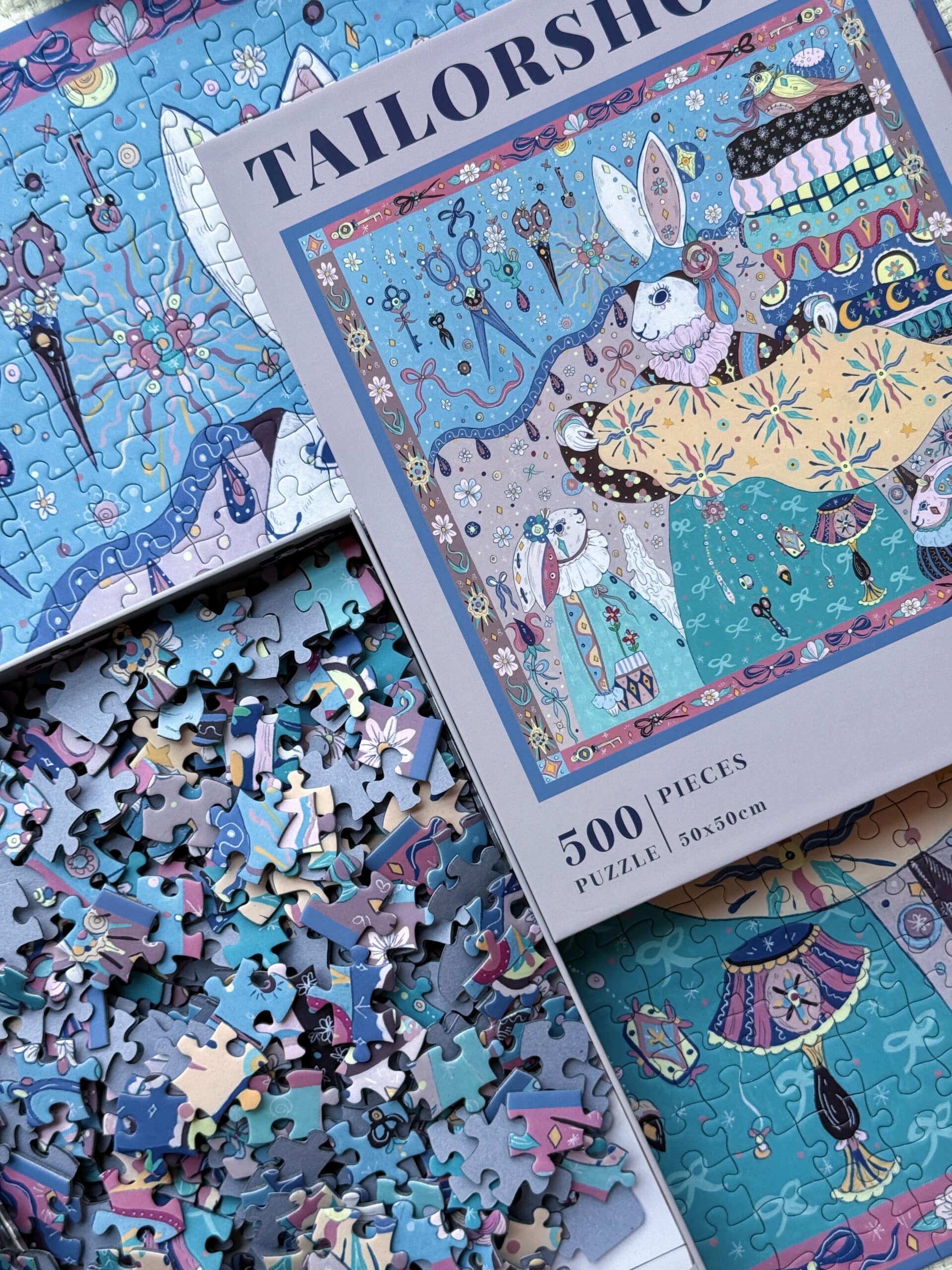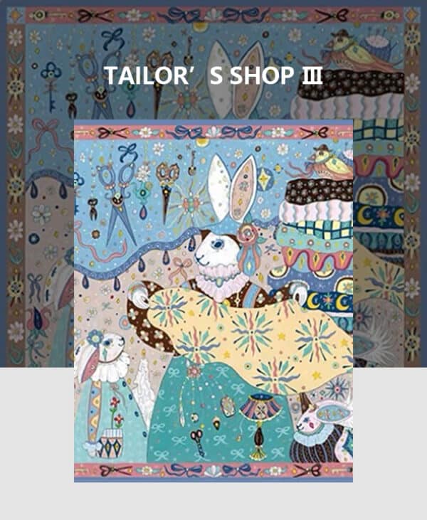 The Tailor’s Workshop III 500-piece velvet art puzzle presents a whimsical atelier with walls lined with tools and stacks of colorful fabrics, where a rabbit tailor showcases a piece of cloth to its little ones. Crafted from premium blue card with a velvet-touch finish, offers a captivating and immersive experience.