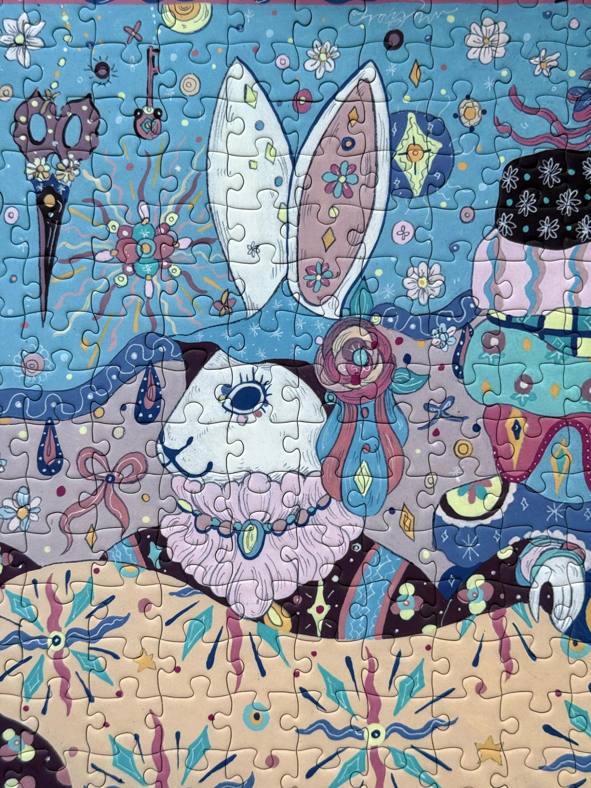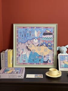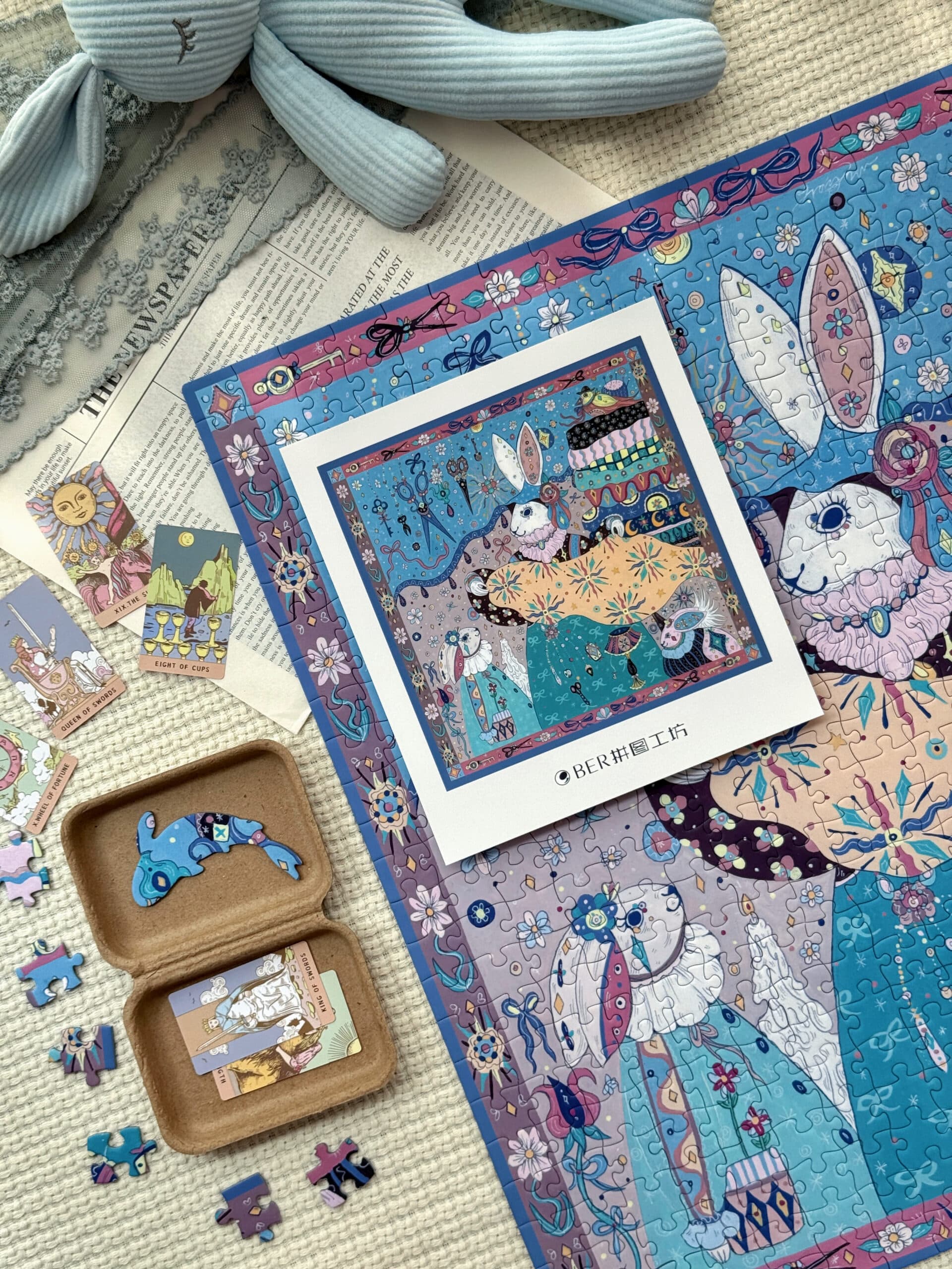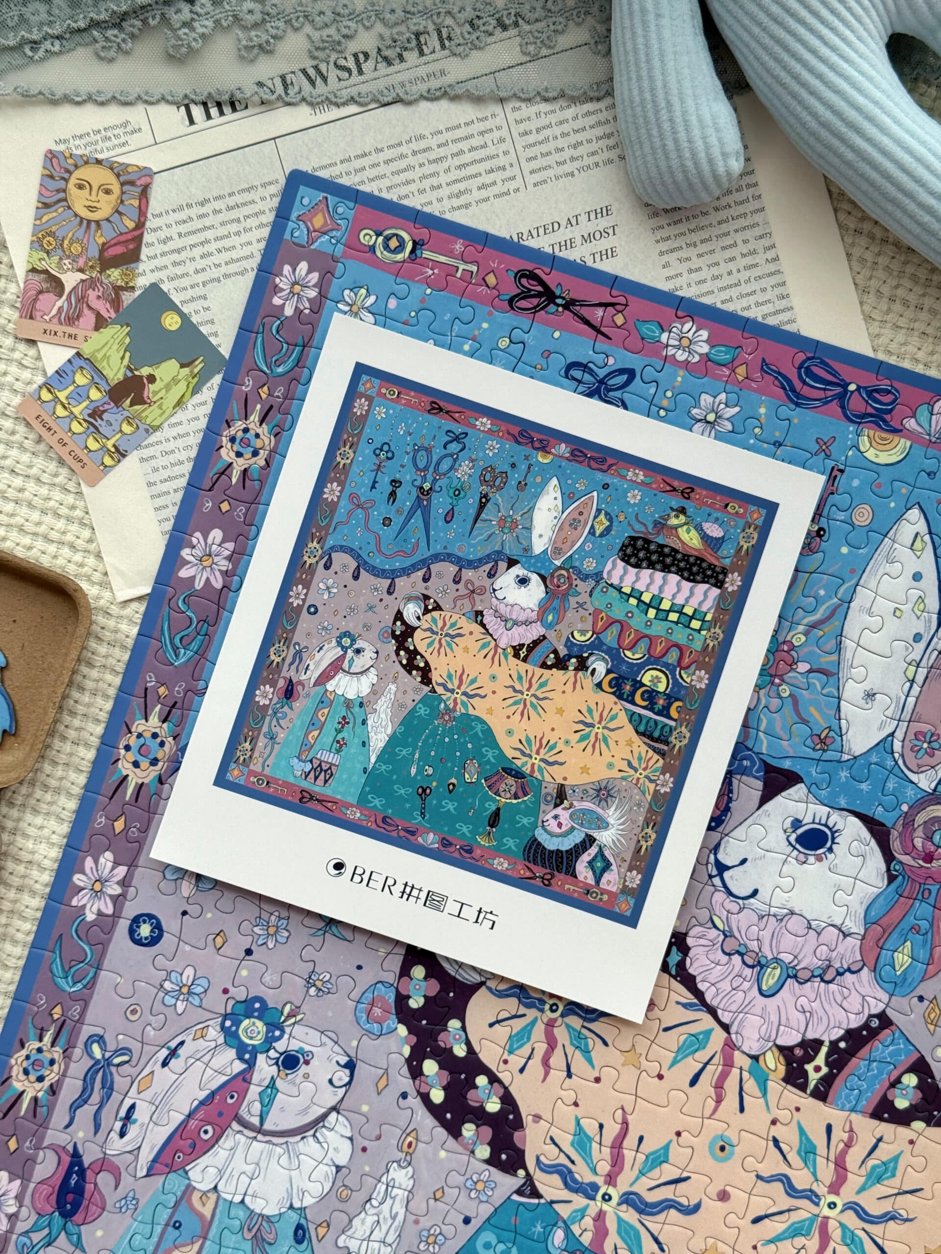 The Tailor’s Workshop III 500-piece velvet art puzzle presents a whimsical atelier with walls lined with tools and stacks of colorful fabrics, where a rabbit tailor showcases a piece of cloth to its little ones. Crafted from premium blue card with a velvet-touch finish, offers a captivating and immersive experience.