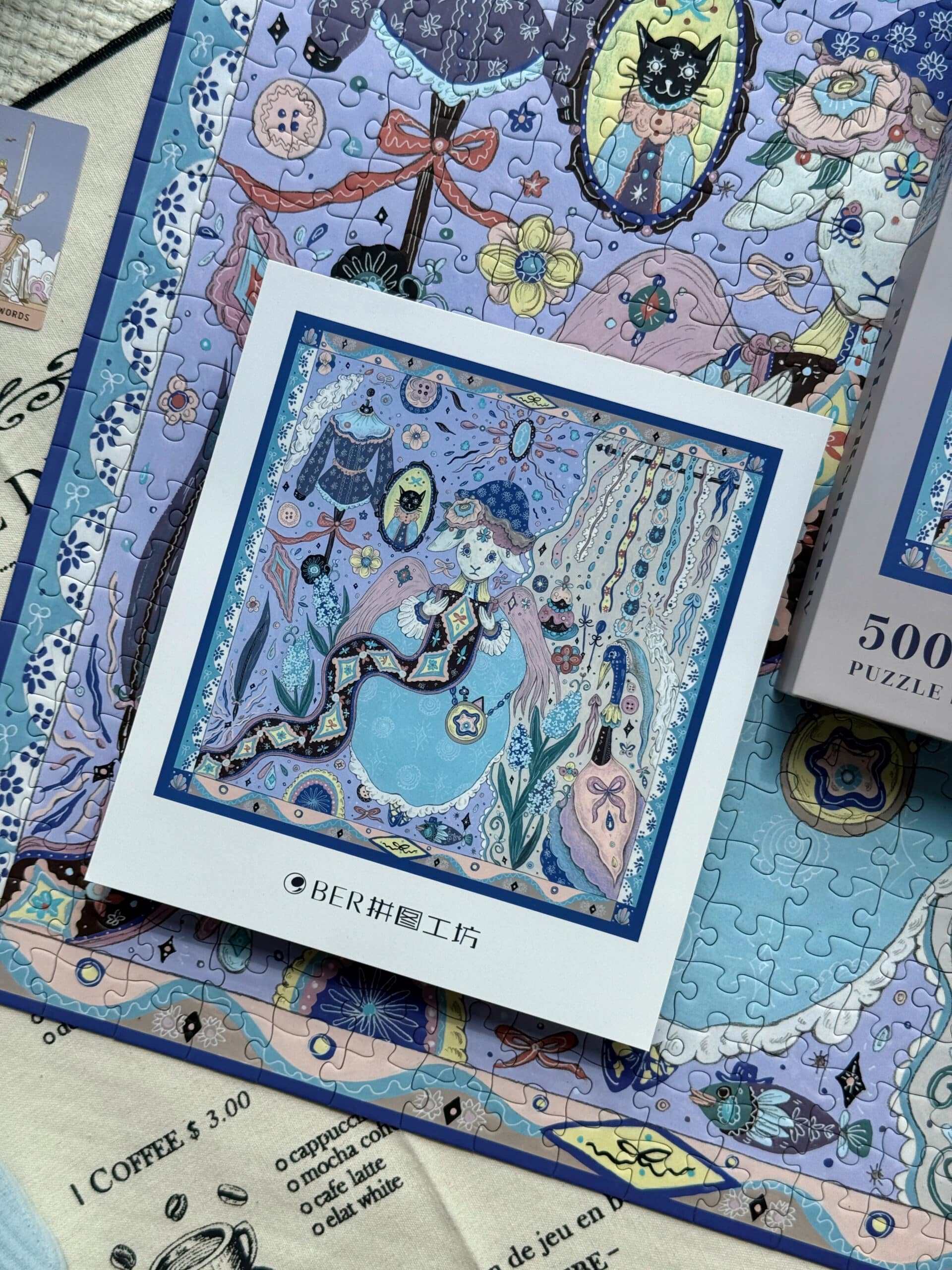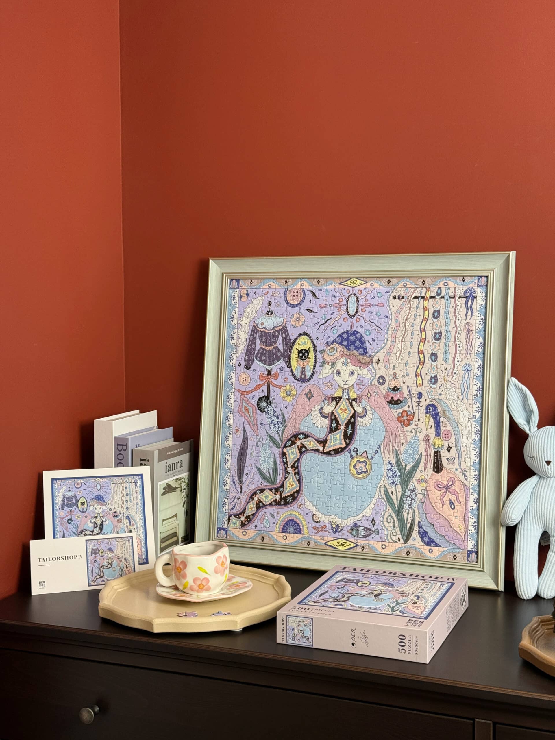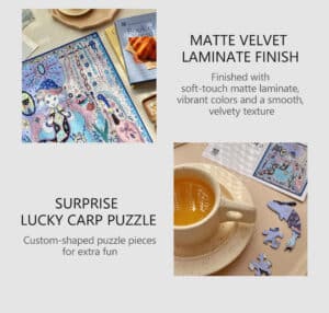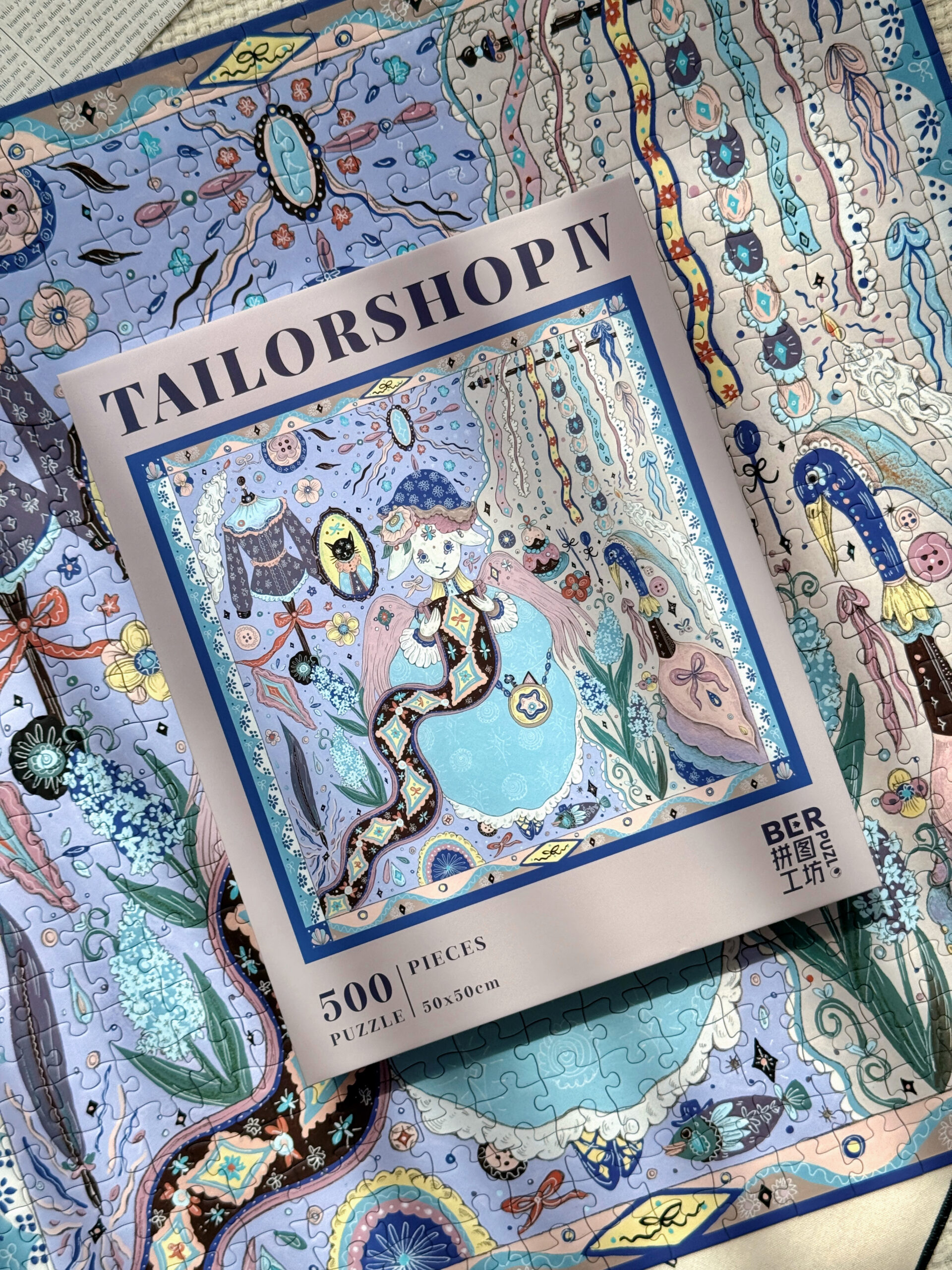 The Tailor’s Workshop IV 500-piece velvet art puzzle, depicted in a distinctive hand-drawn style, captures a charming scene of an elegant sheep thoughtfully examining rolls of fabric in a cozy atelier. Made with premium blue card and a velvet-touch finish, this puzzle delivers an enchanting and immersive assembling experience.