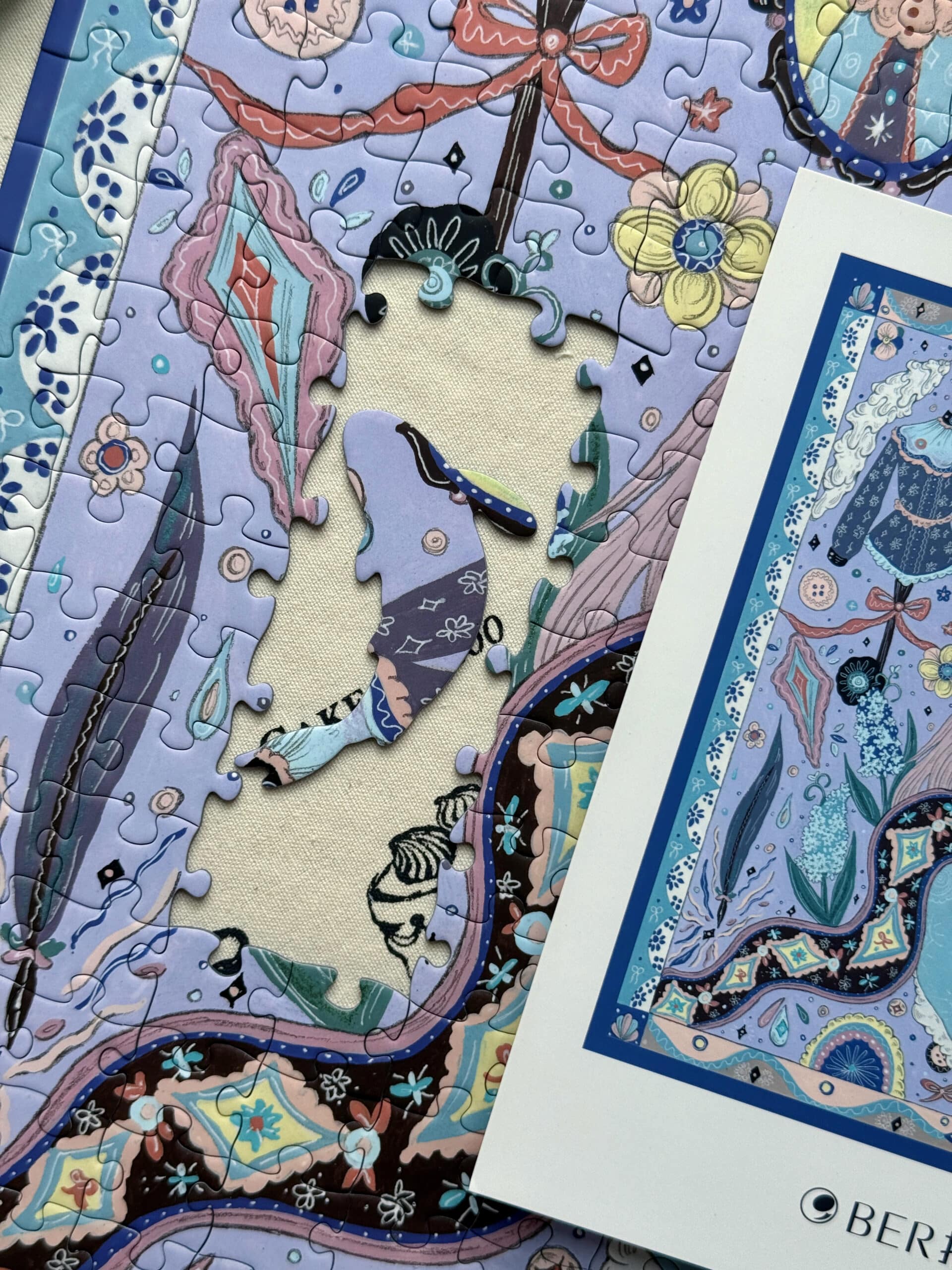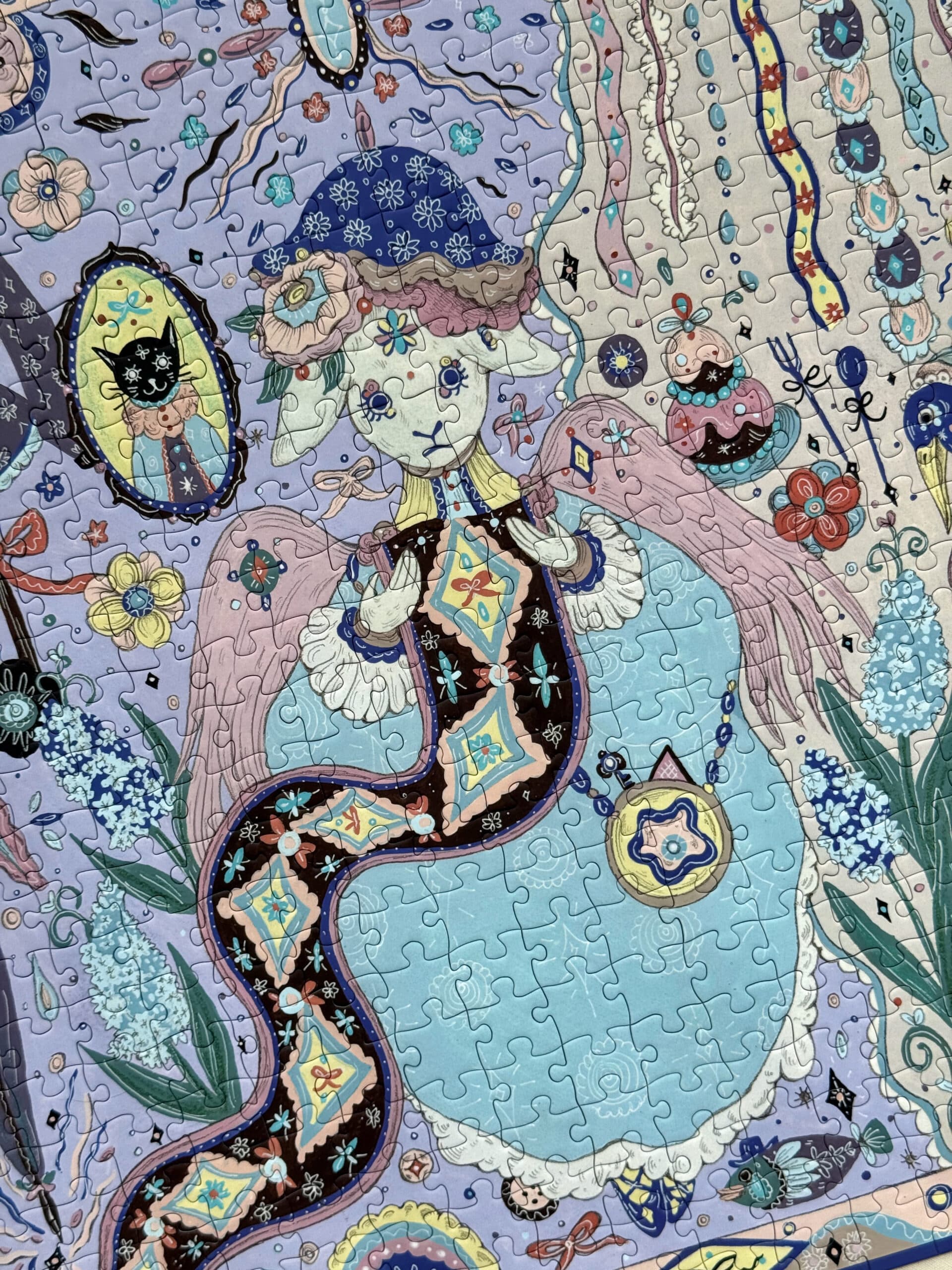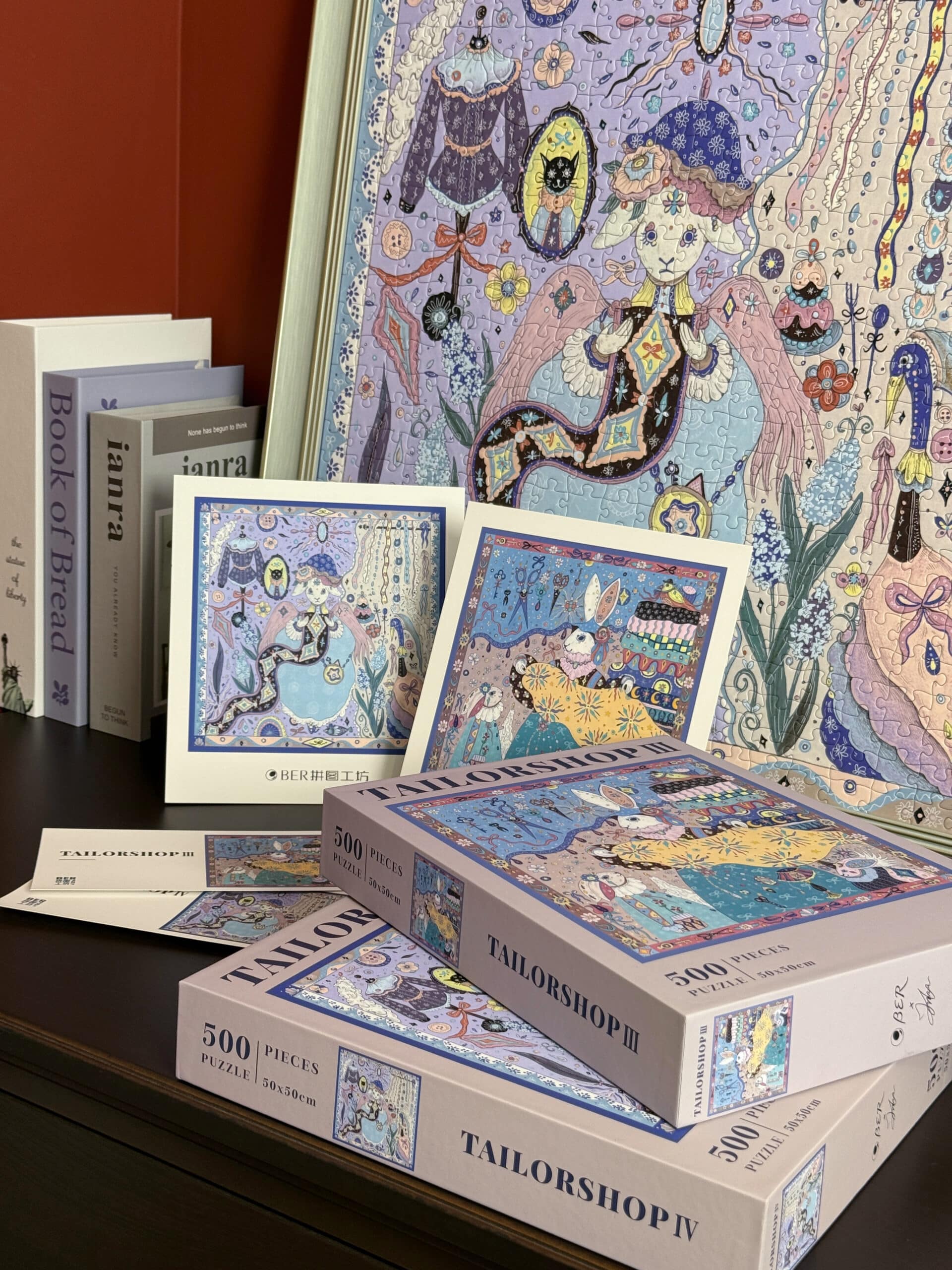 The Tailor’s Workshop IV 500-piece velvet art puzzle, depicted in a distinctive hand-drawn style, captures a charming scene of an elegant sheep thoughtfully examining rolls of fabric in a cozy atelier. Made with premium blue card and a velvet-touch finish, this puzzle delivers an enchanting and immersive assembling experience.