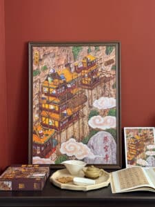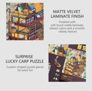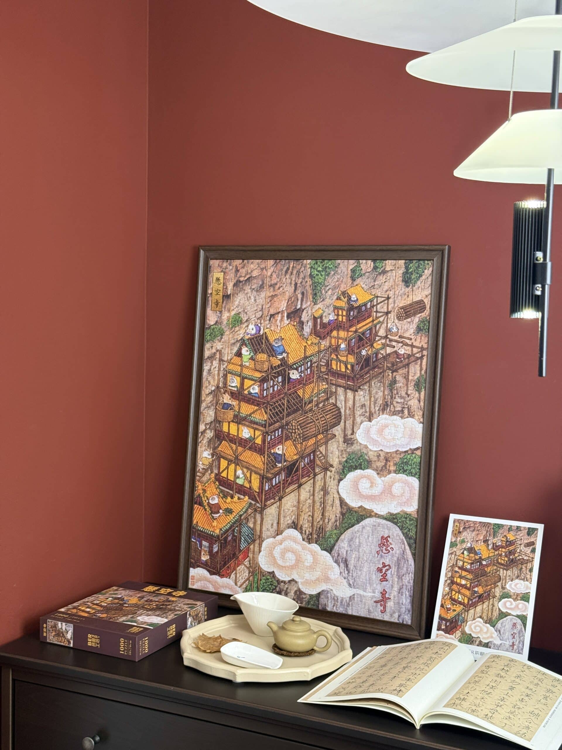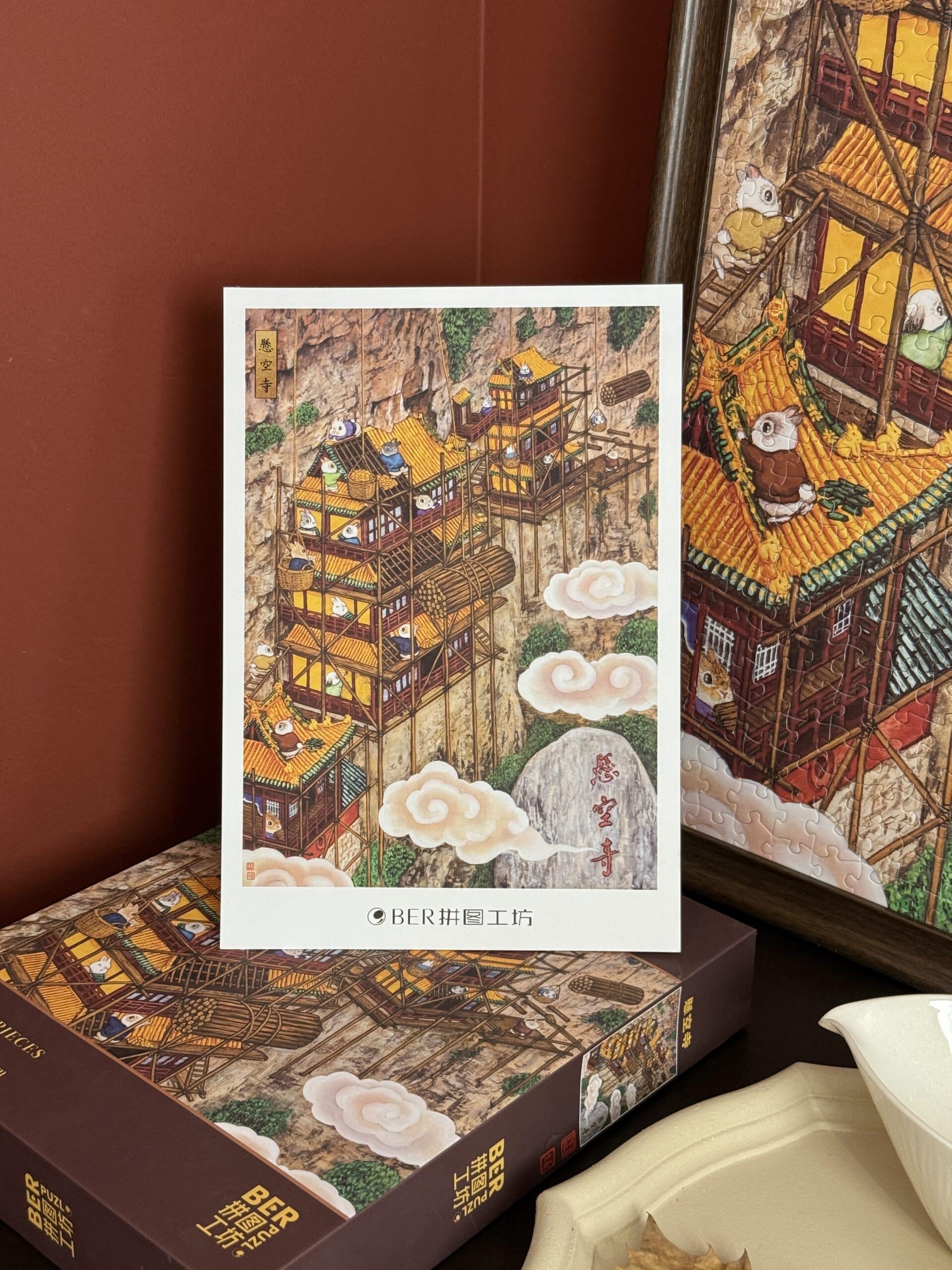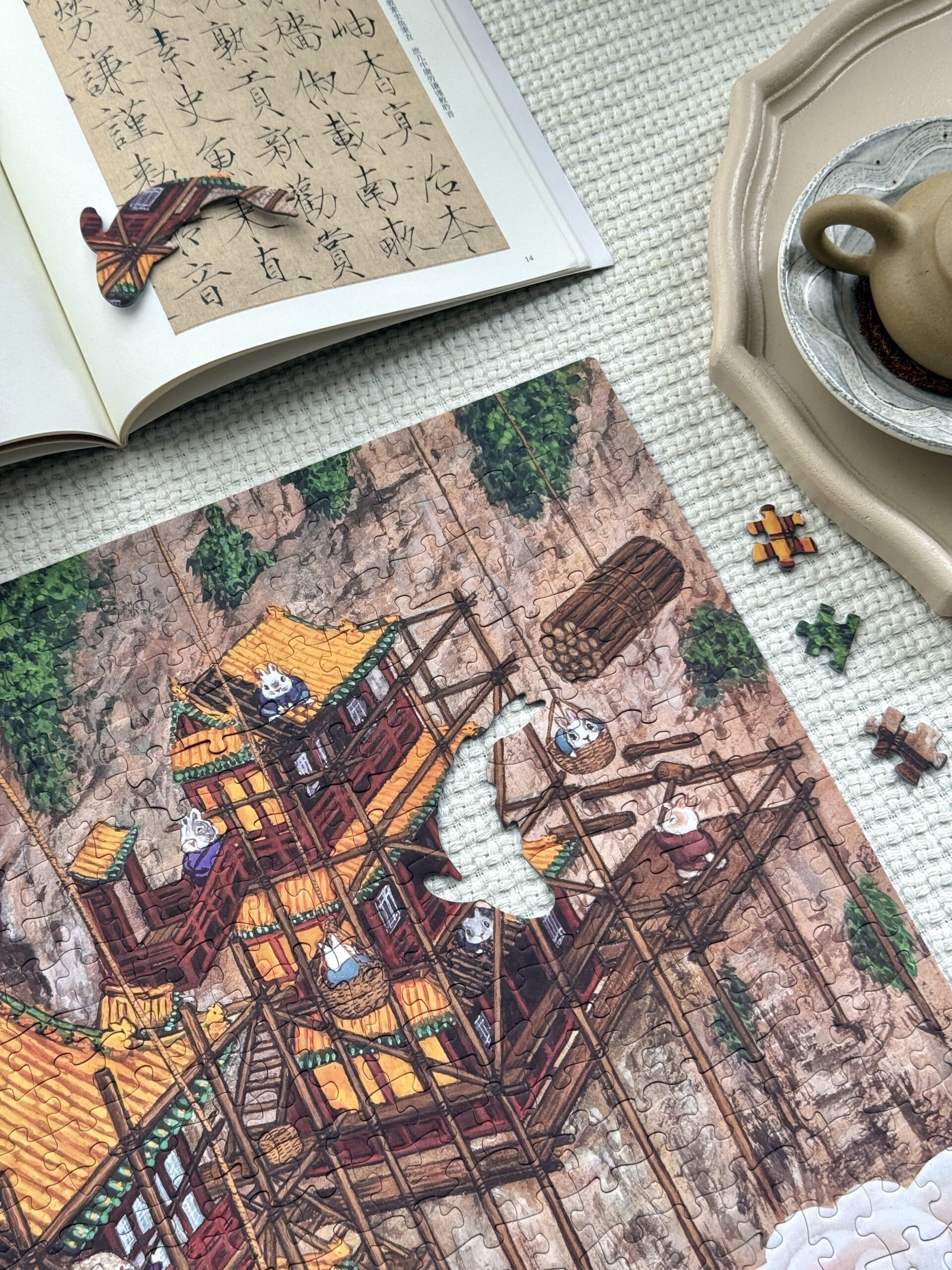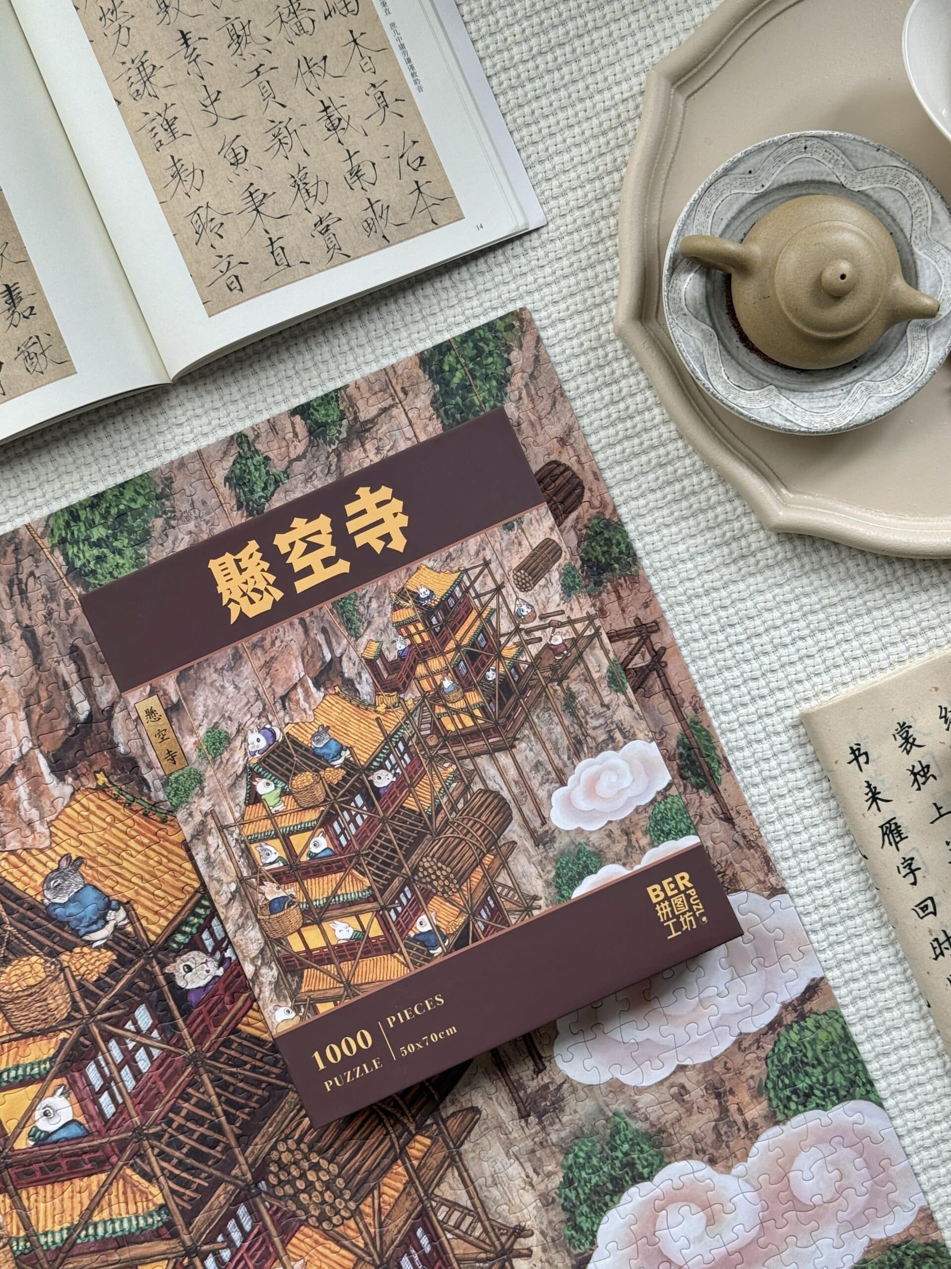 The Hanging Temple 1000-piece velvet art puzzle reimagines Shanxi’s cliffside marvel with charming cartoon artistry, where adorable rabbit builders busily work to shape this ancient wonder. Crafted from premium imported blue card with a matte velvet-touch finish, it offers a playful blend of creativity and cultural charm.