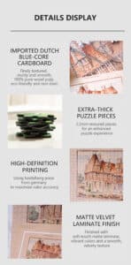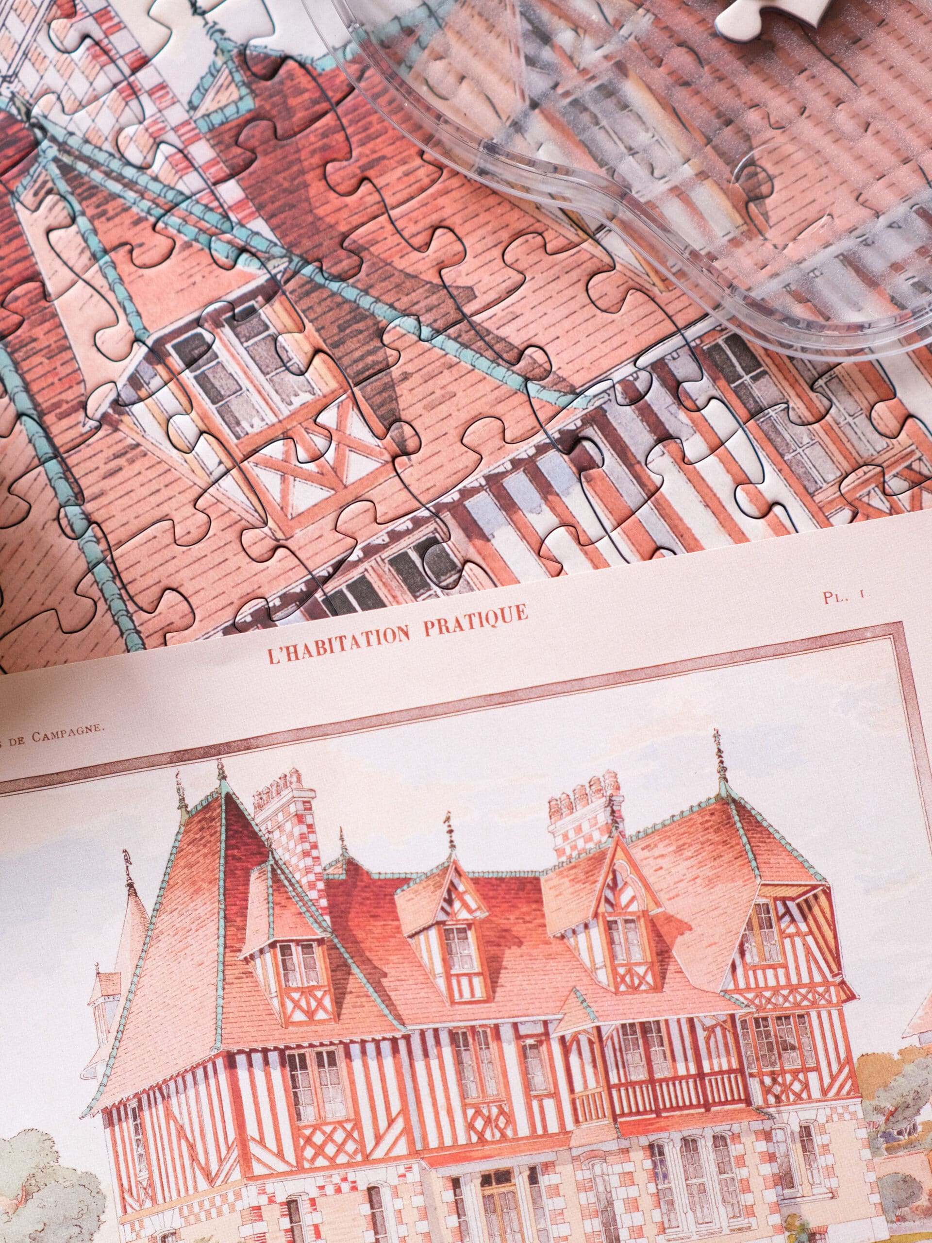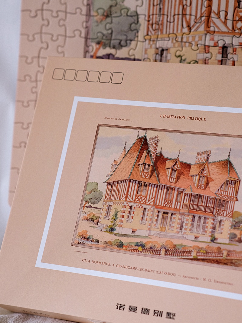 The Villa Normande 500-piece velvet art puzzle features a 19th-century architectural design draft rendered in watercolor, capturing the timeless elegance of a Normandy-style villa in France. With its refined details and artistic charm, this puzzle highlights the beauty of classic French architecture. Made with premium blue card and finished with a velvet-touch surface, it provides both cultural appreciation and a satisfying assembling experience.